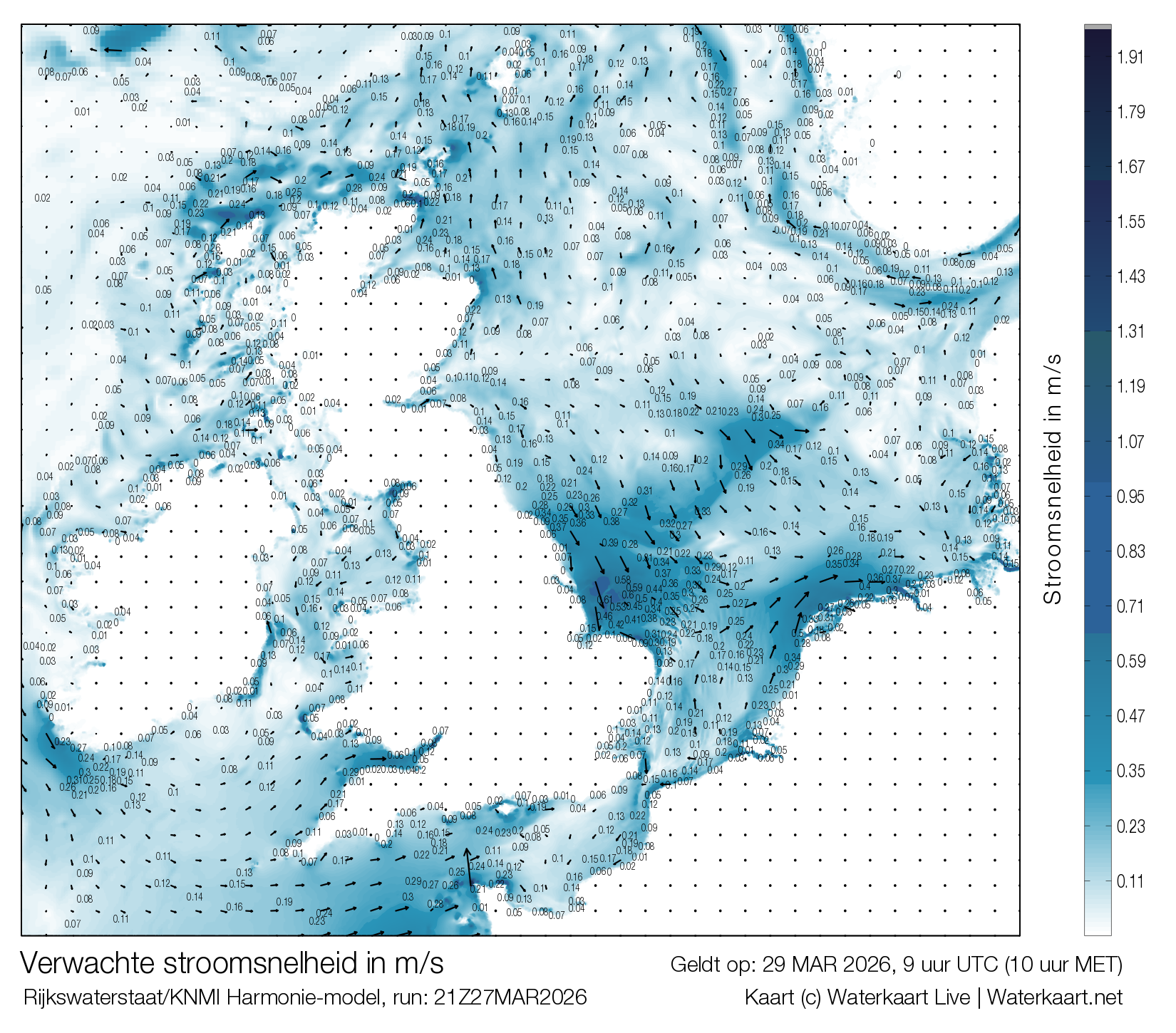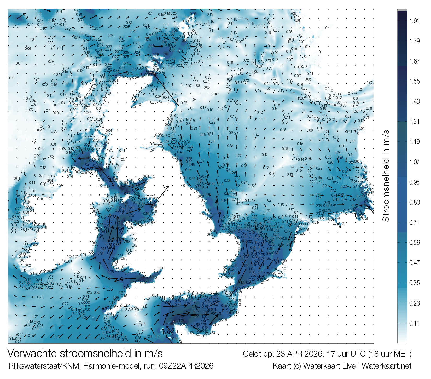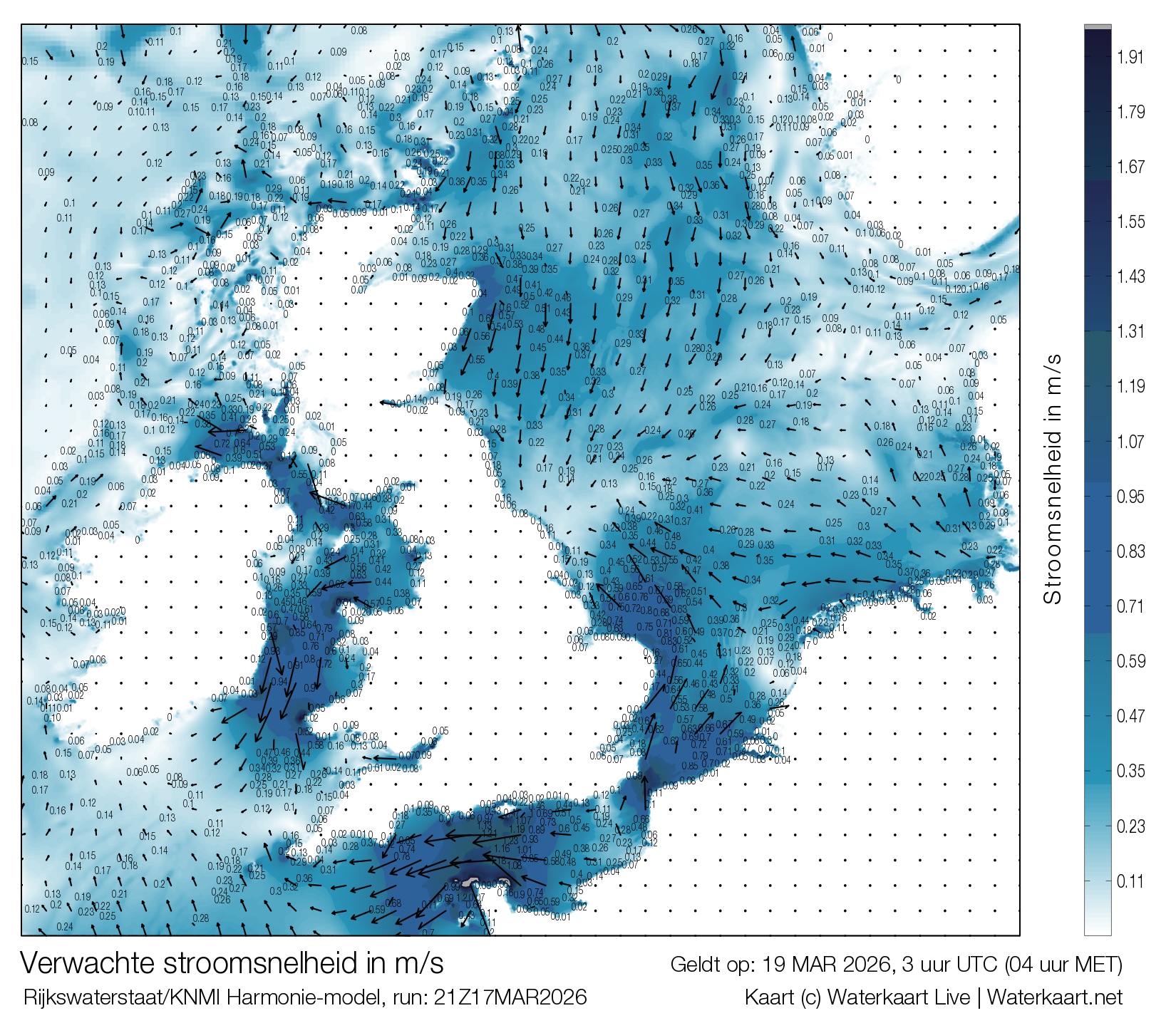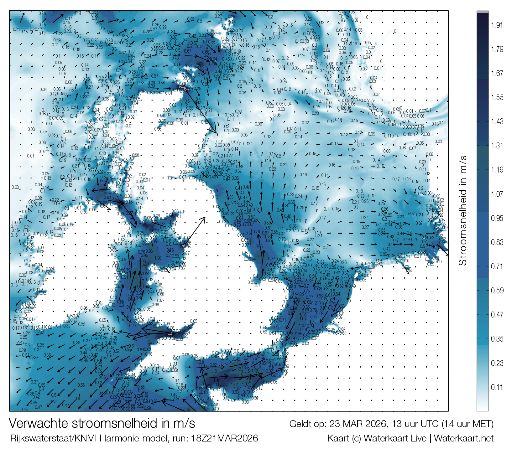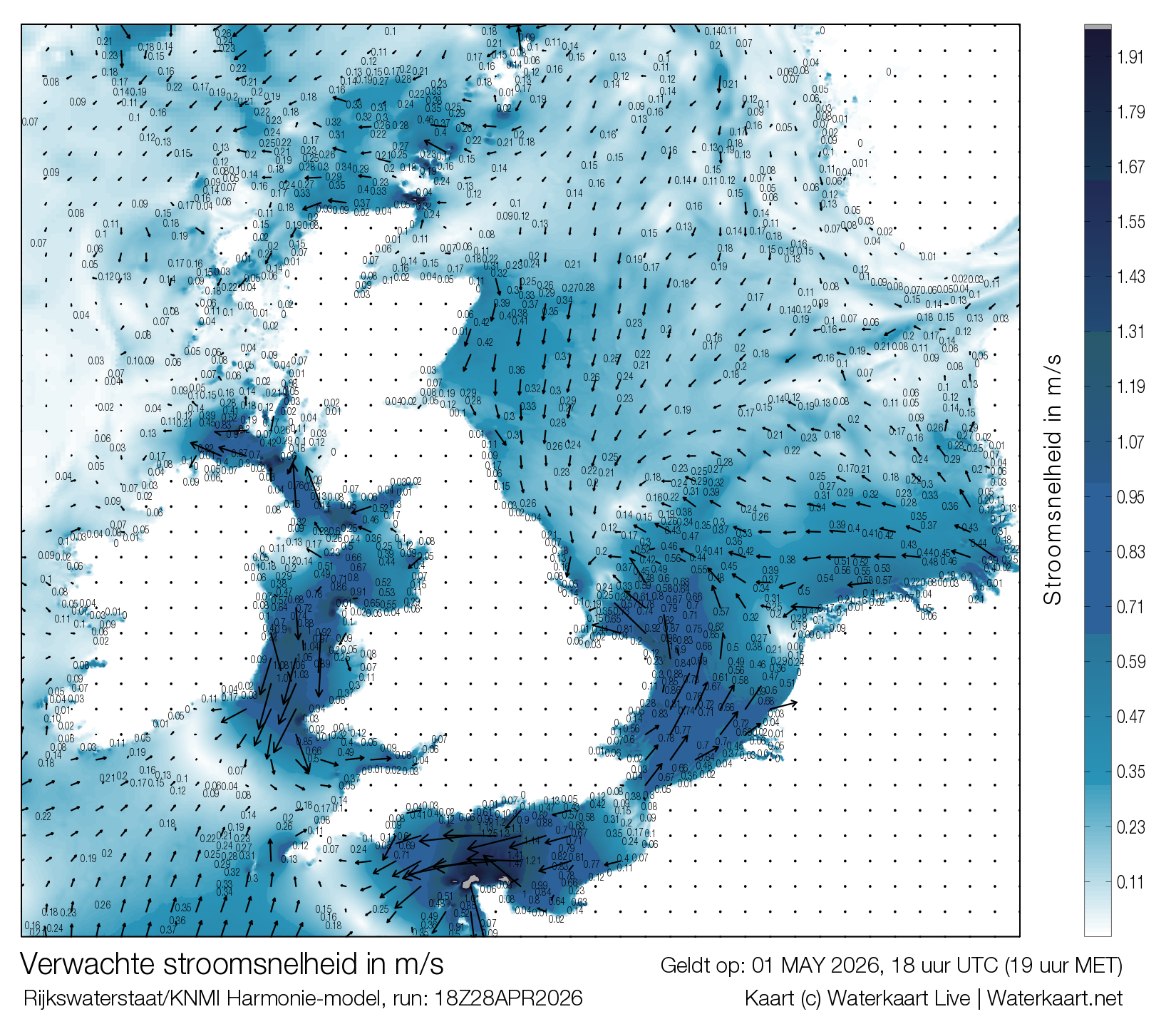 Stroomsnelheden in de Noordzee op basis van de Stroomatlas, verrekend met weersinvloeden. Deze worden iedere dag ververst met data uit het zeestromingen model van Rijkswaterstaat op basis van Harmonie weerdata, voor ieder uur een kaart, tot 48 uur in de toekomst. Lees hieronder meer over dit model