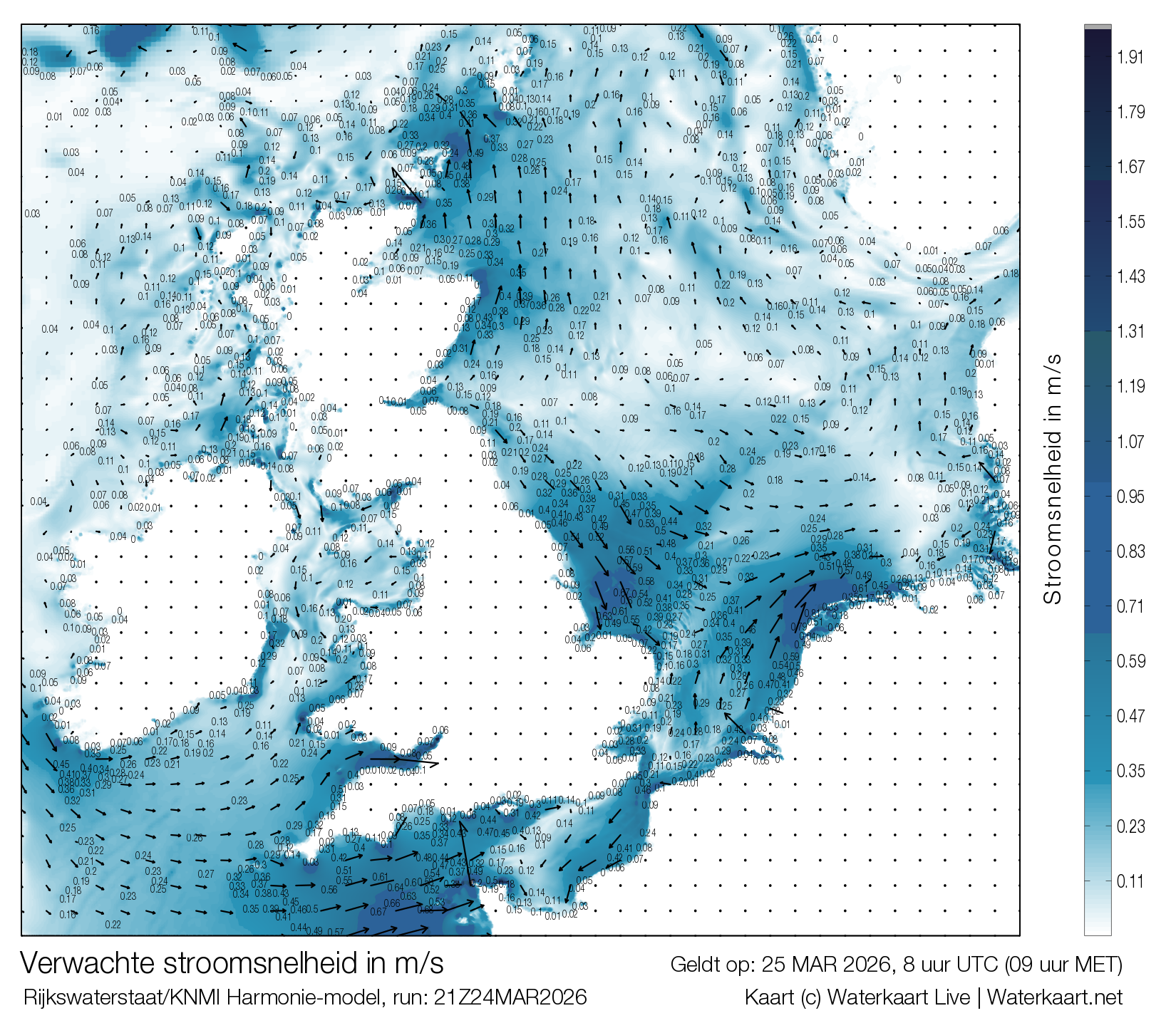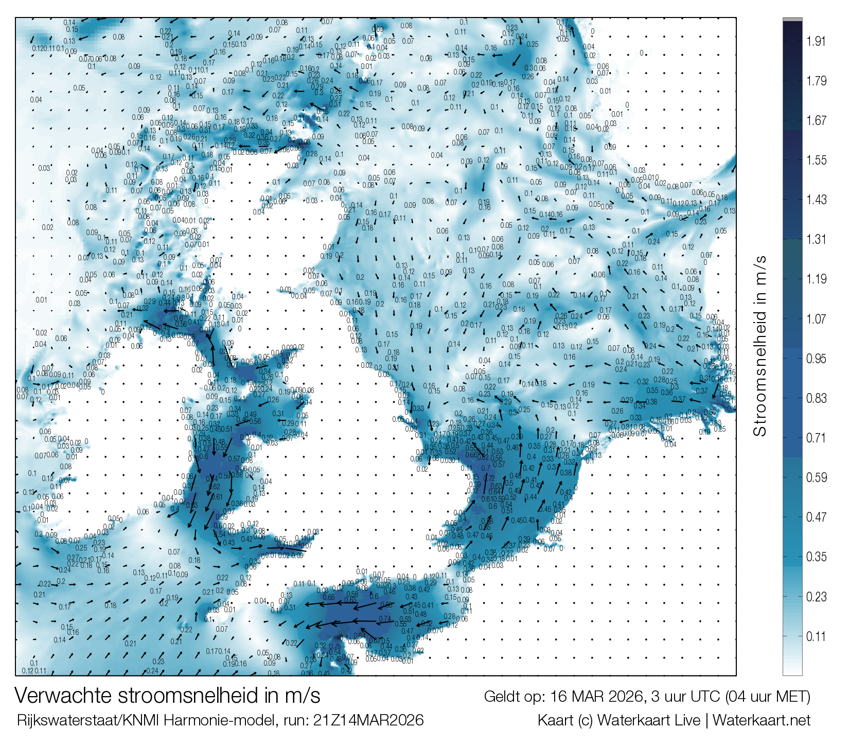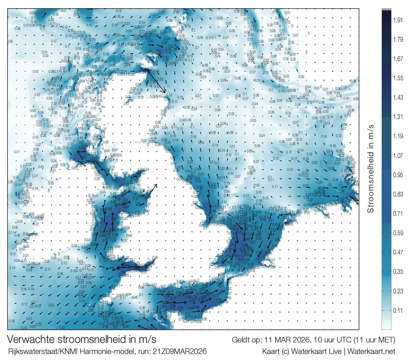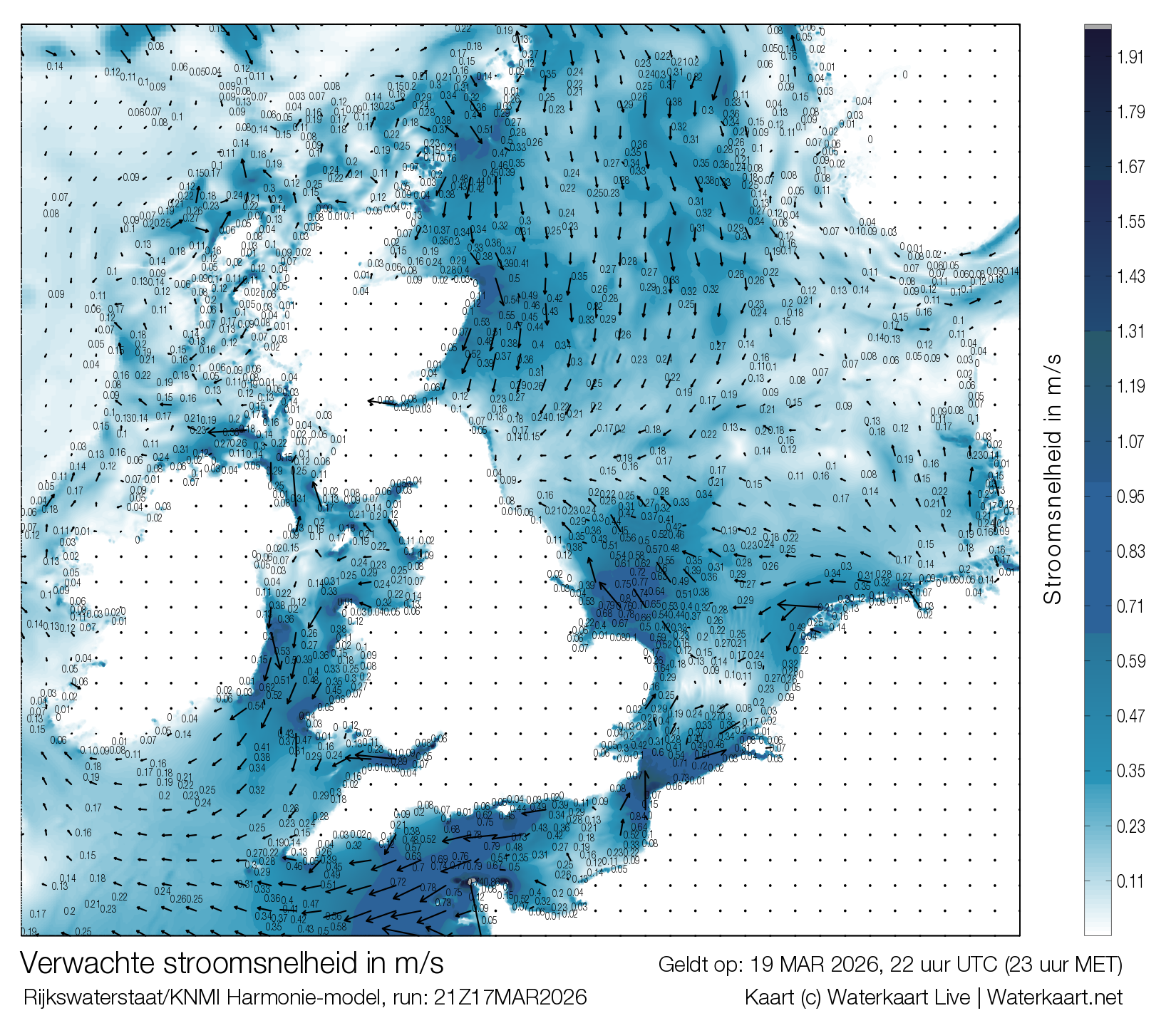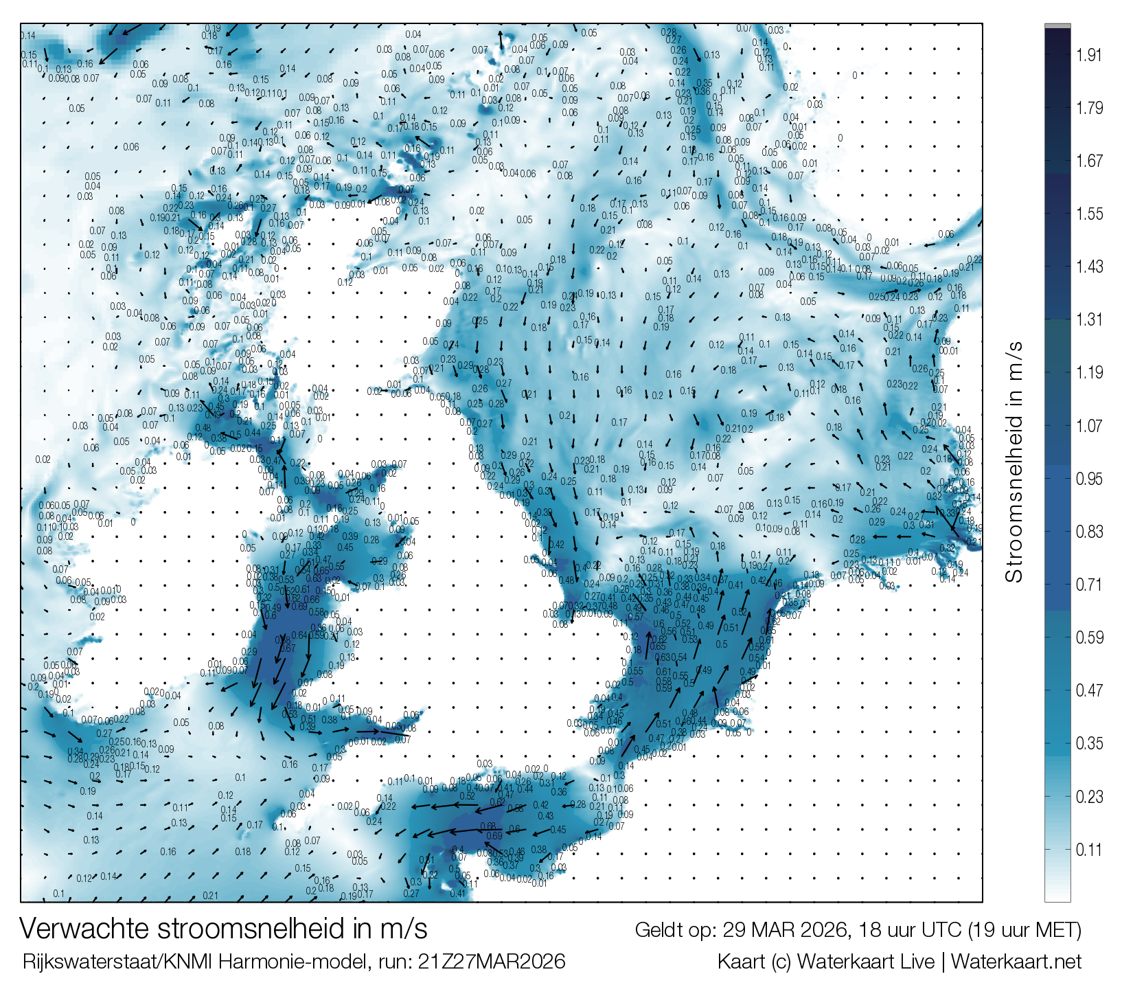 Stroomsnelheden in de Noordzee op basis van de Stroomatlas, verrekend met weersinvloeden. Deze worden iedere dag ververst met data uit het zeestromingen model van Rijkswaterstaat op basis van Harmonie weerdata, voor ieder uur een kaart, tot 48 uur in de toekomst. Lees hieronder meer over dit model