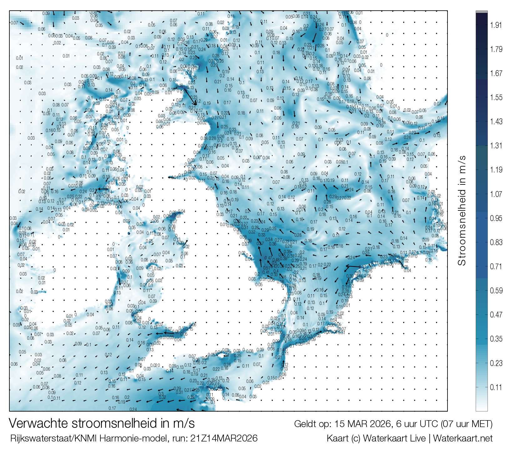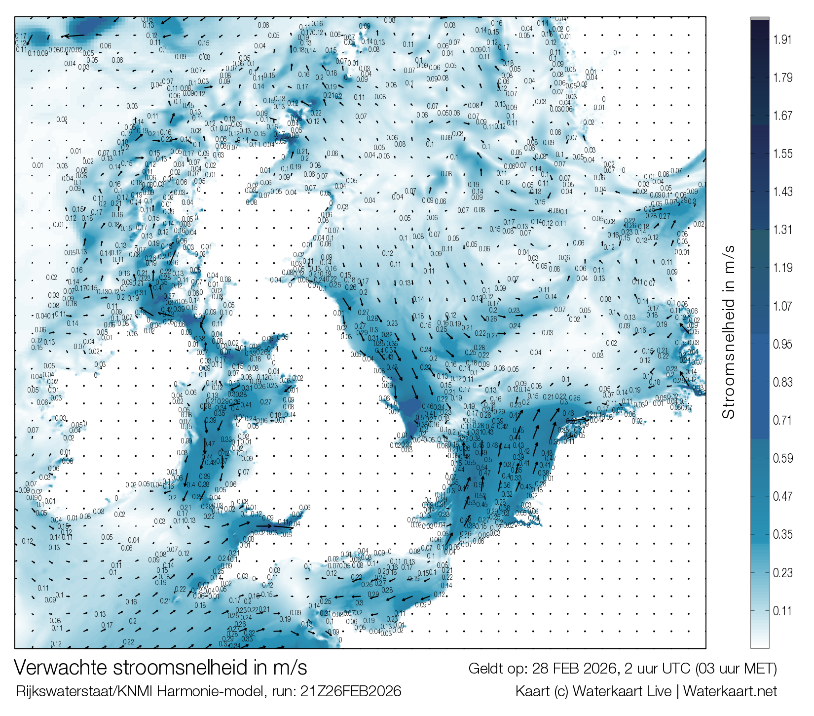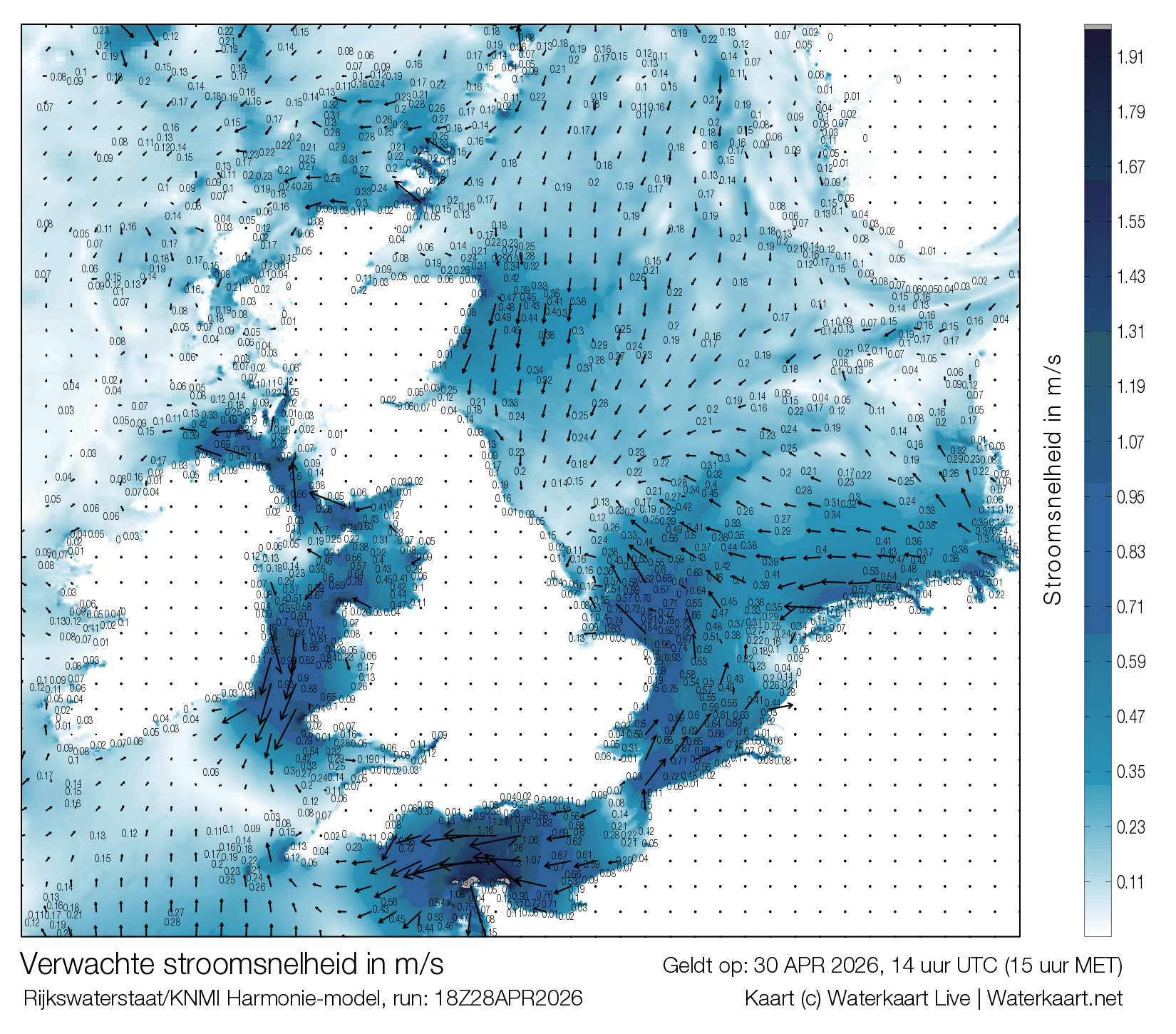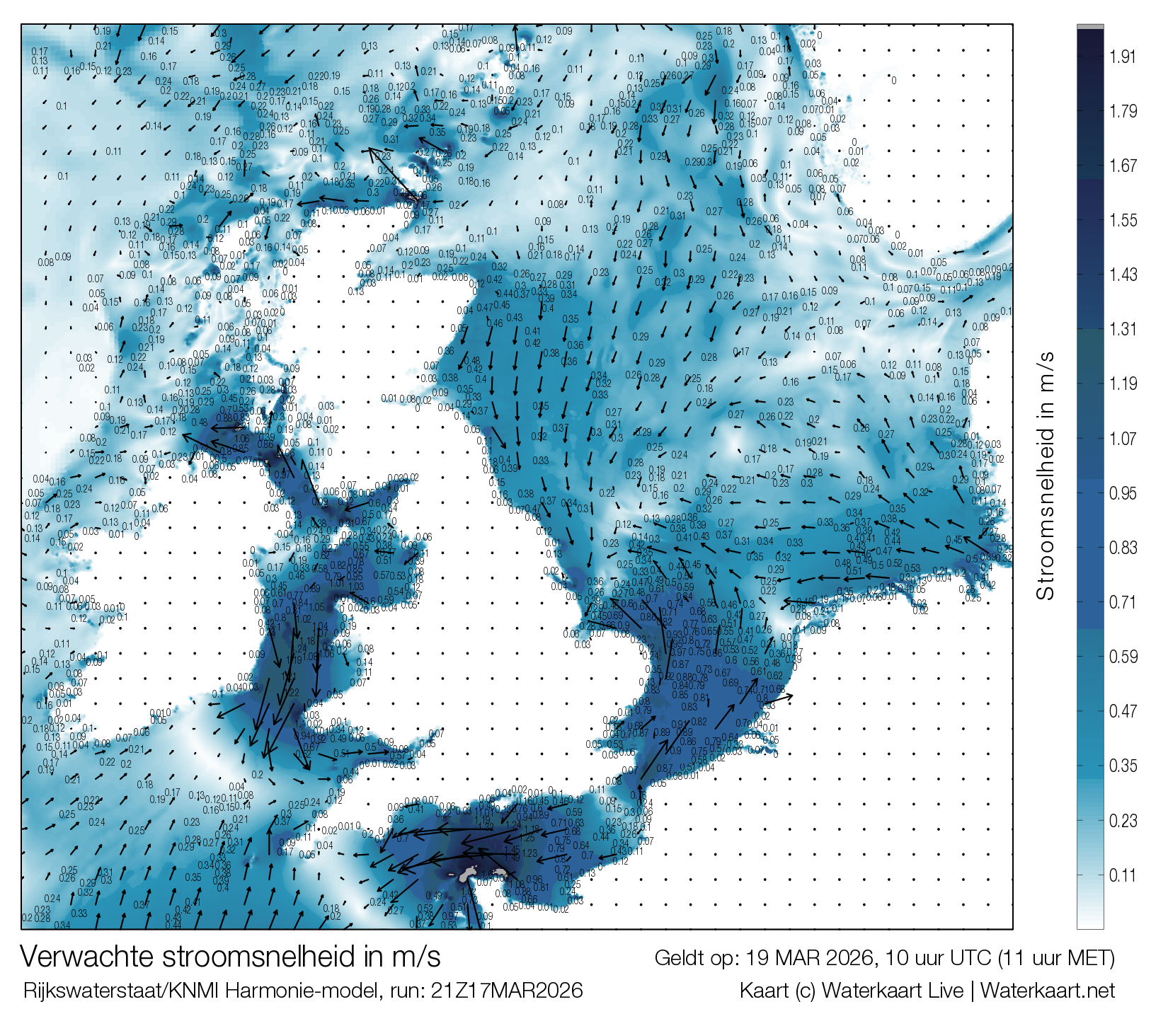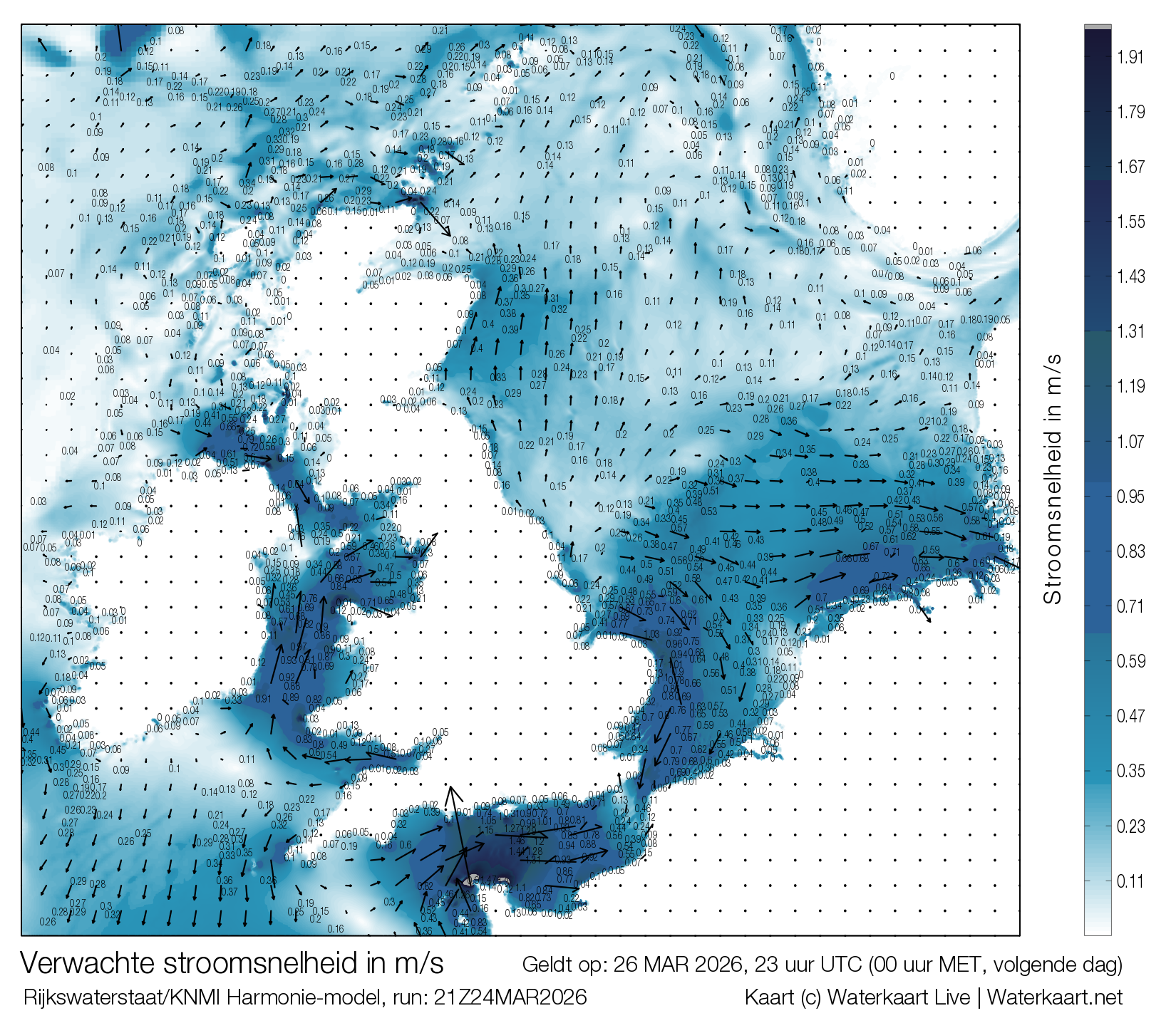 Stroomsnelheden in de Noordzee op basis van de Stroomatlas, verrekend met weersinvloeden. Deze worden iedere dag ververst met data uit het zeestromingen model van Rijkswaterstaat op basis van Harmonie weerdata, voor ieder uur een kaart, tot 48 uur in de toekomst. Lees hieronder meer over dit model