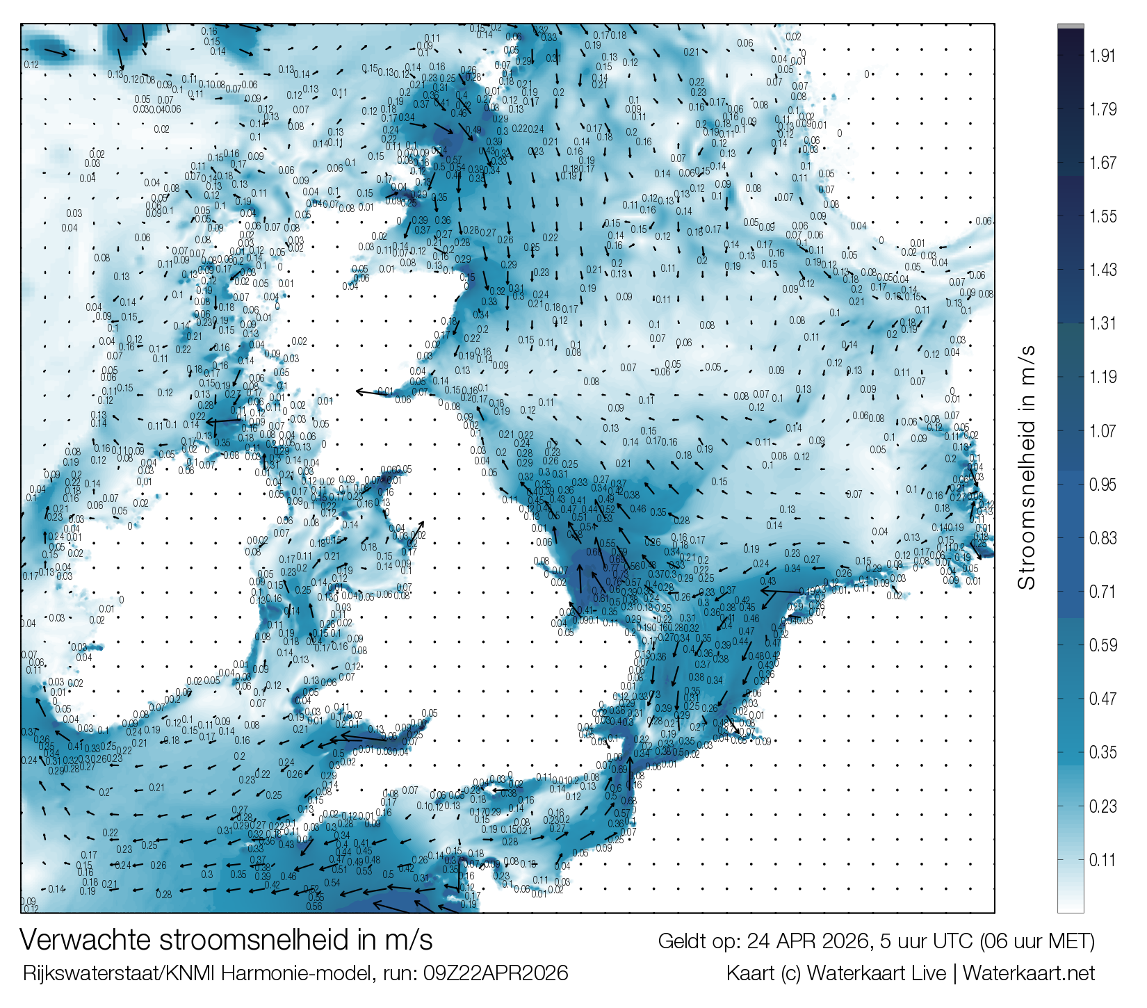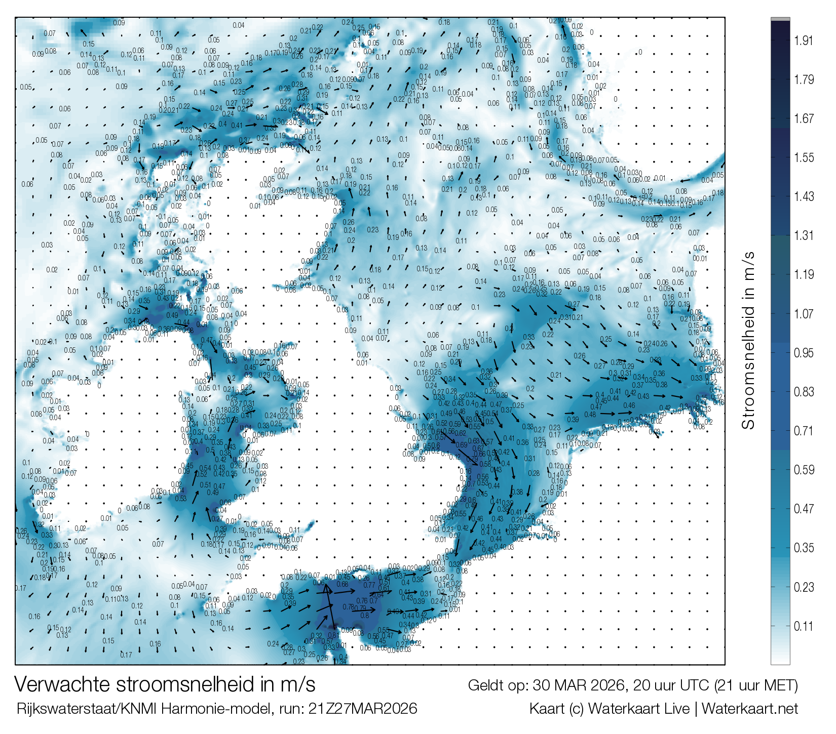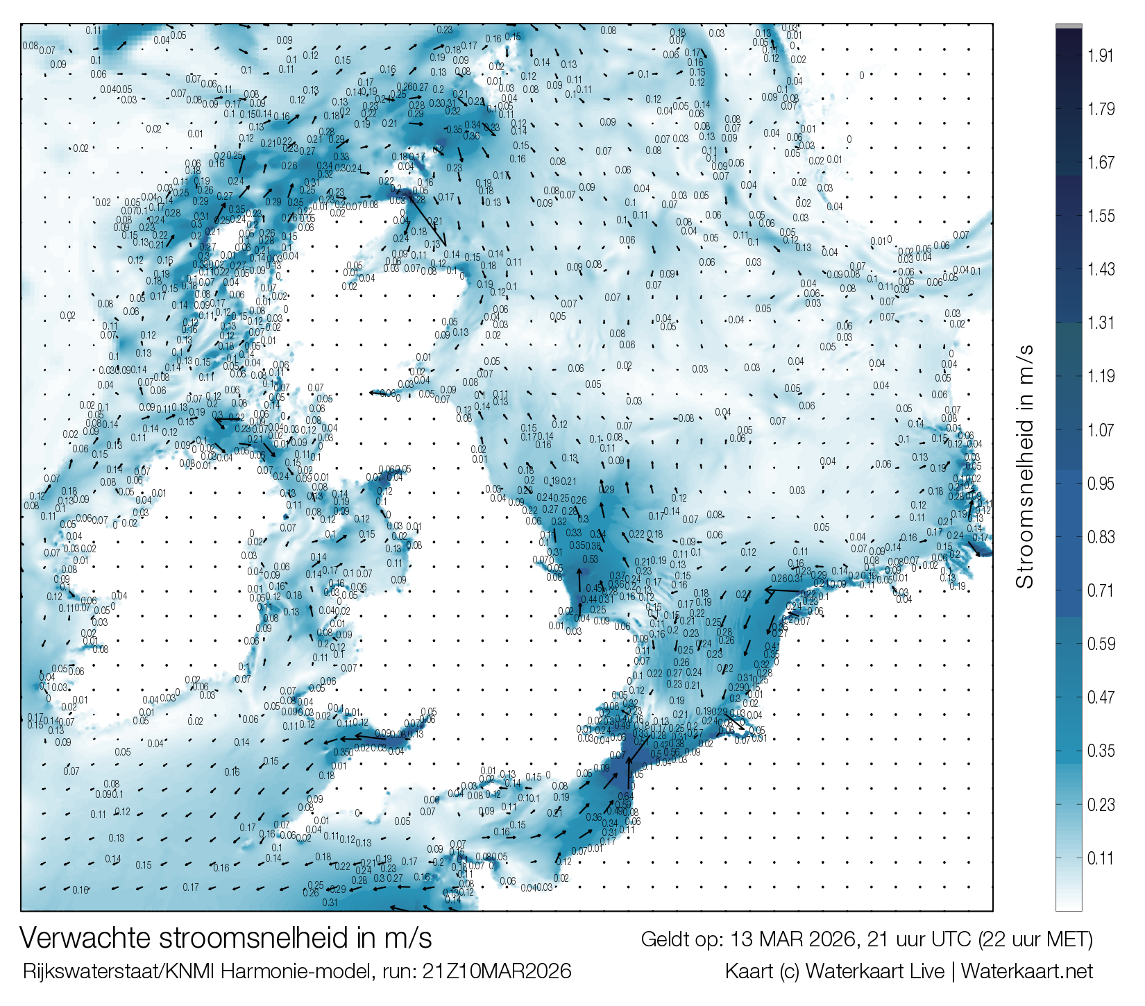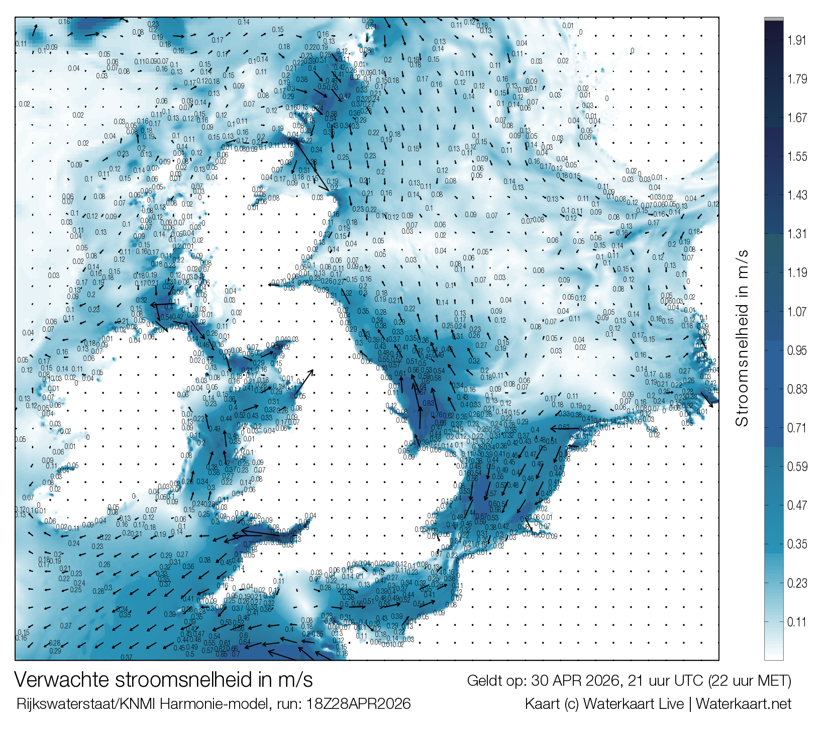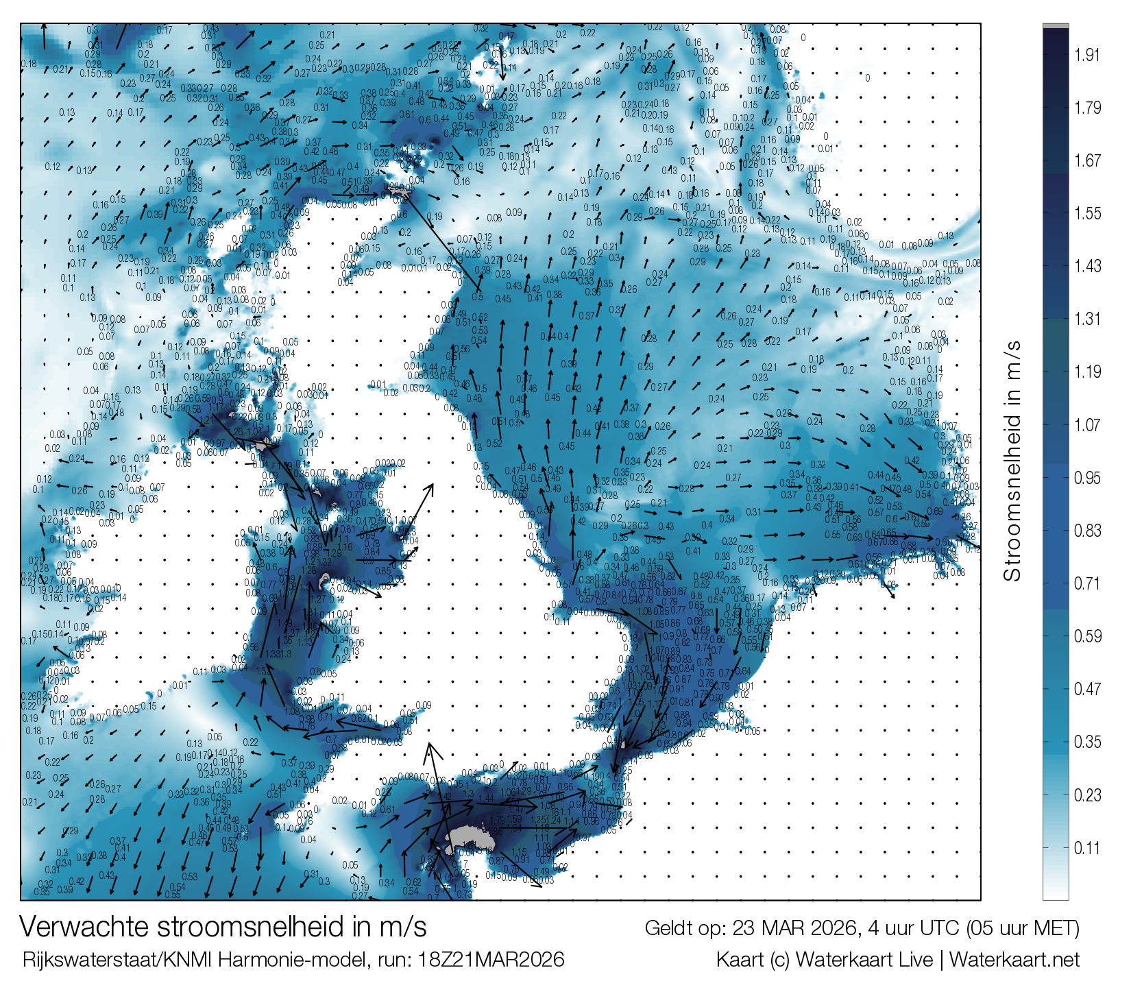 Stroomsnelheden in de Noordzee op basis van de Stroomatlas, verrekend met weersinvloeden. Deze worden iedere dag ververst met data uit het zeestromingen model van Rijkswaterstaat op basis van Harmonie weerdata, voor ieder uur een kaart, tot 48 uur in de toekomst. Lees hieronder meer over dit model