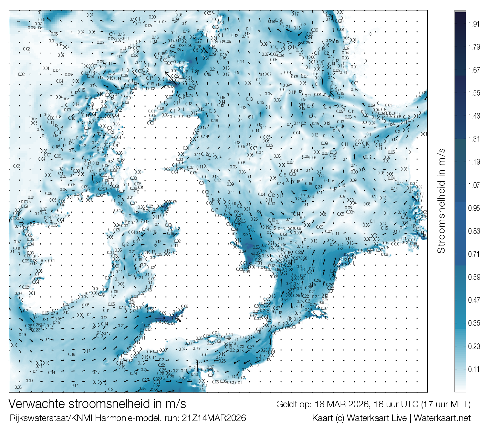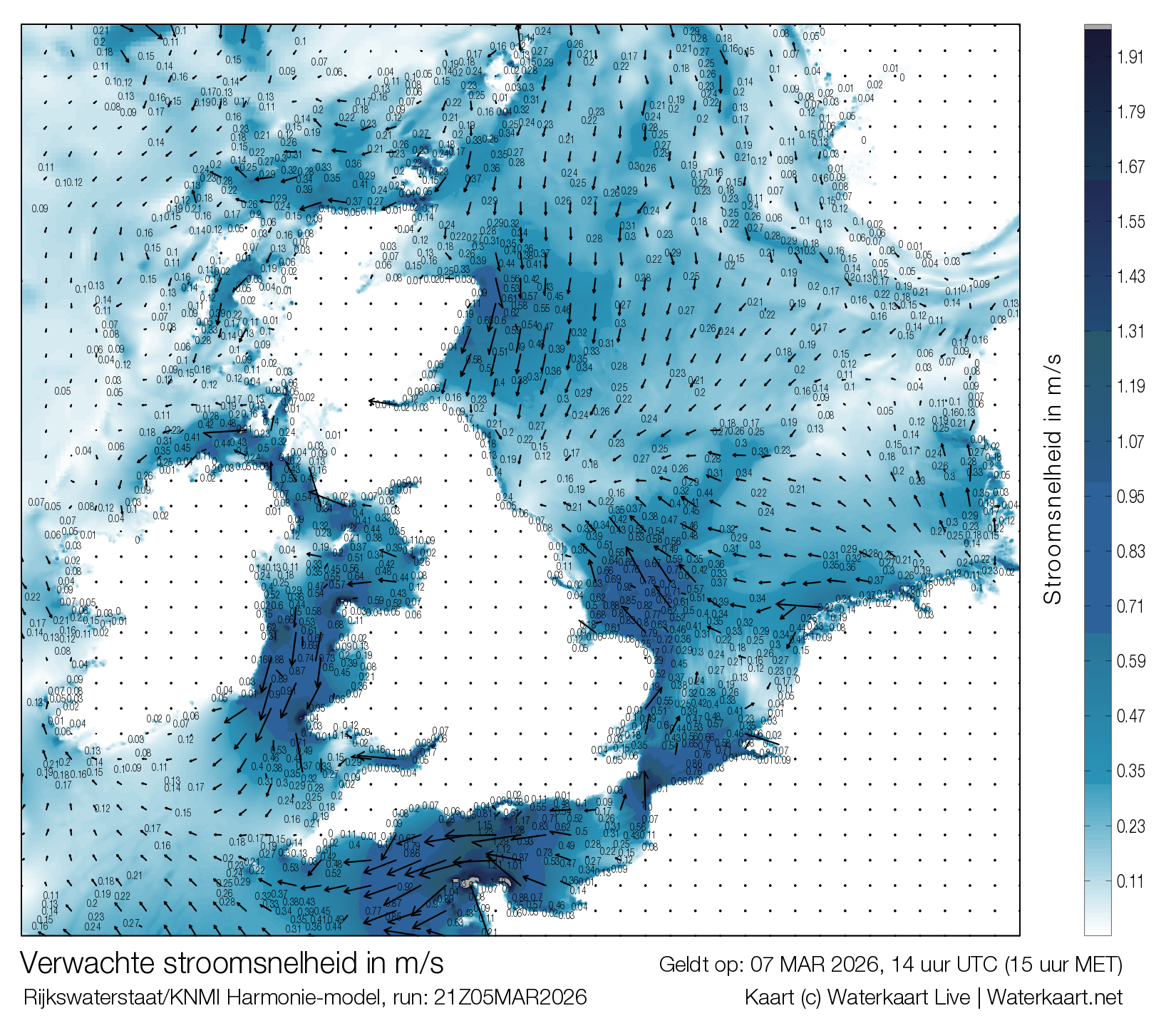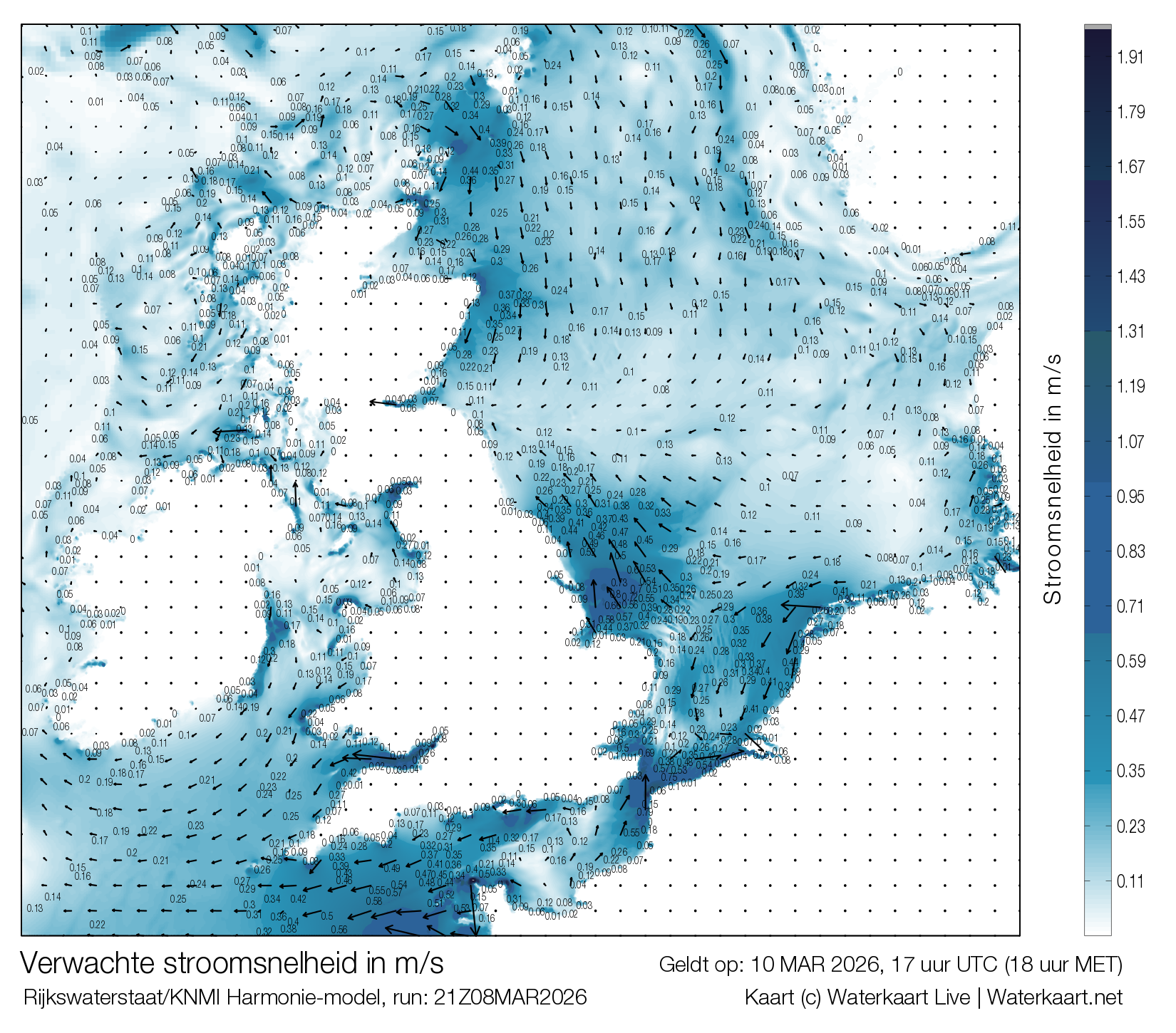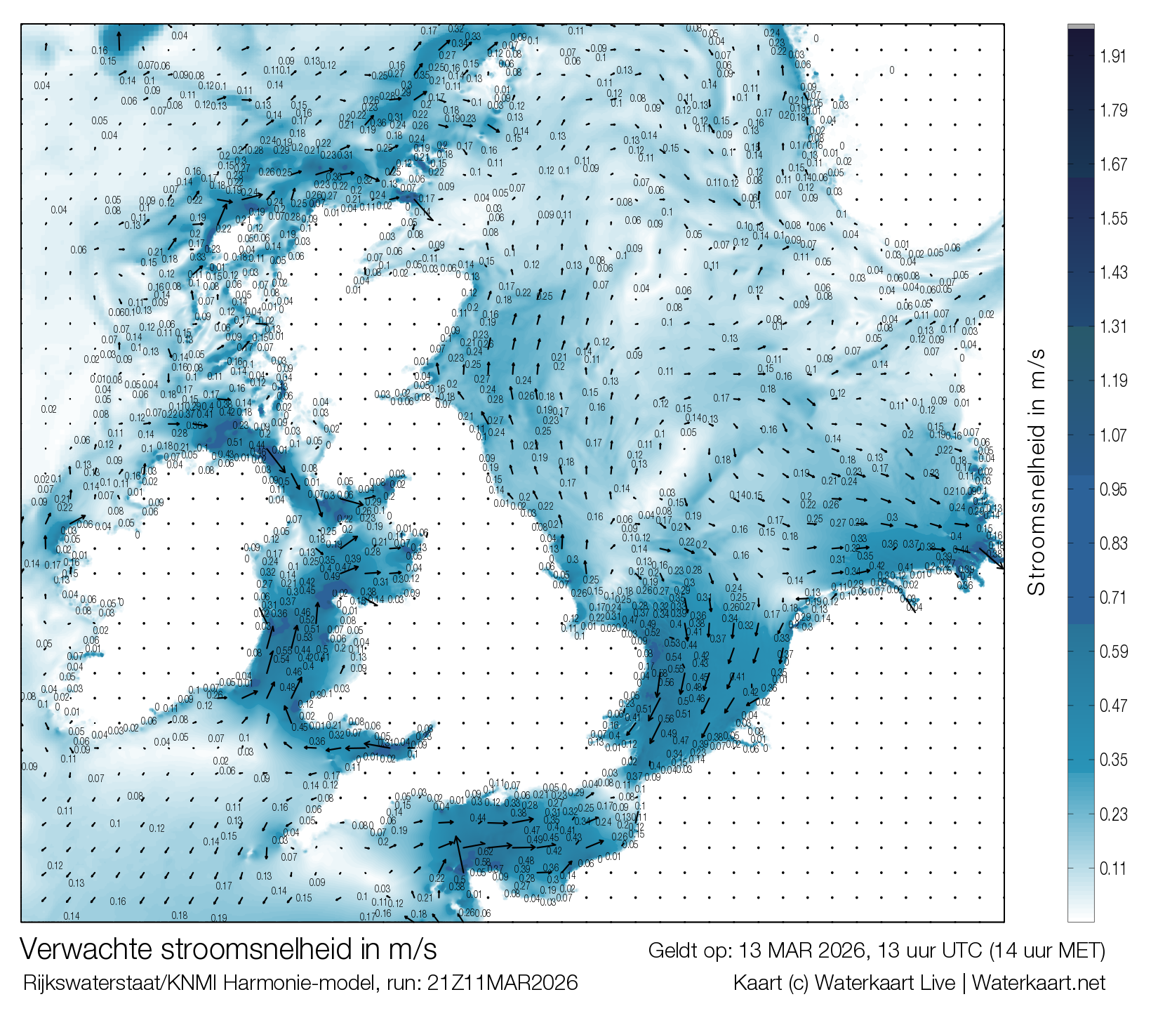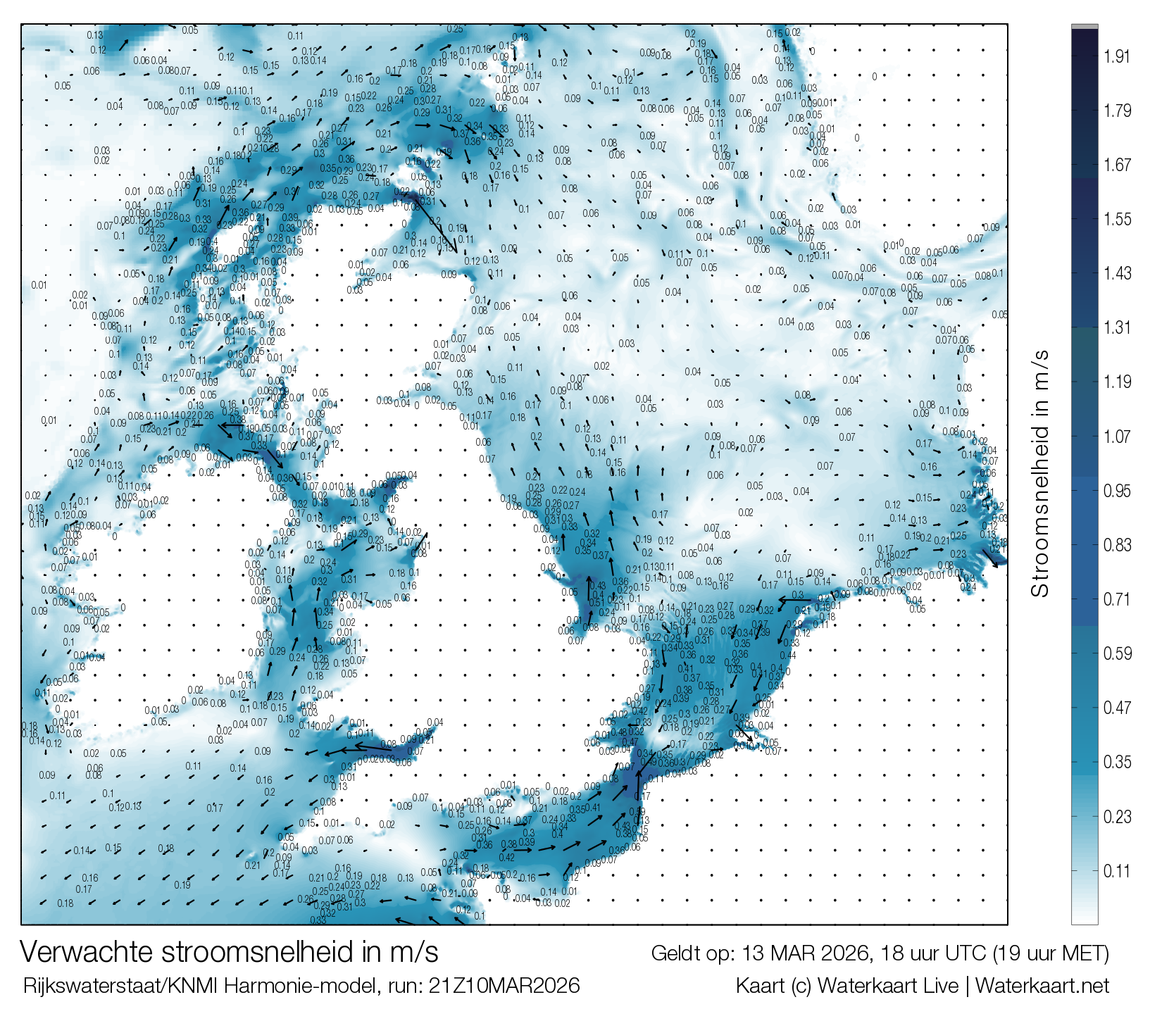 Stroomsnelheden in de Noordzee op basis van de Stroomatlas, verrekend met weersinvloeden. Deze worden iedere dag ververst met data uit het zeestromingen model van Rijkswaterstaat op basis van Harmonie weerdata, voor ieder uur een kaart, tot 48 uur in de toekomst. Lees hieronder meer over dit model