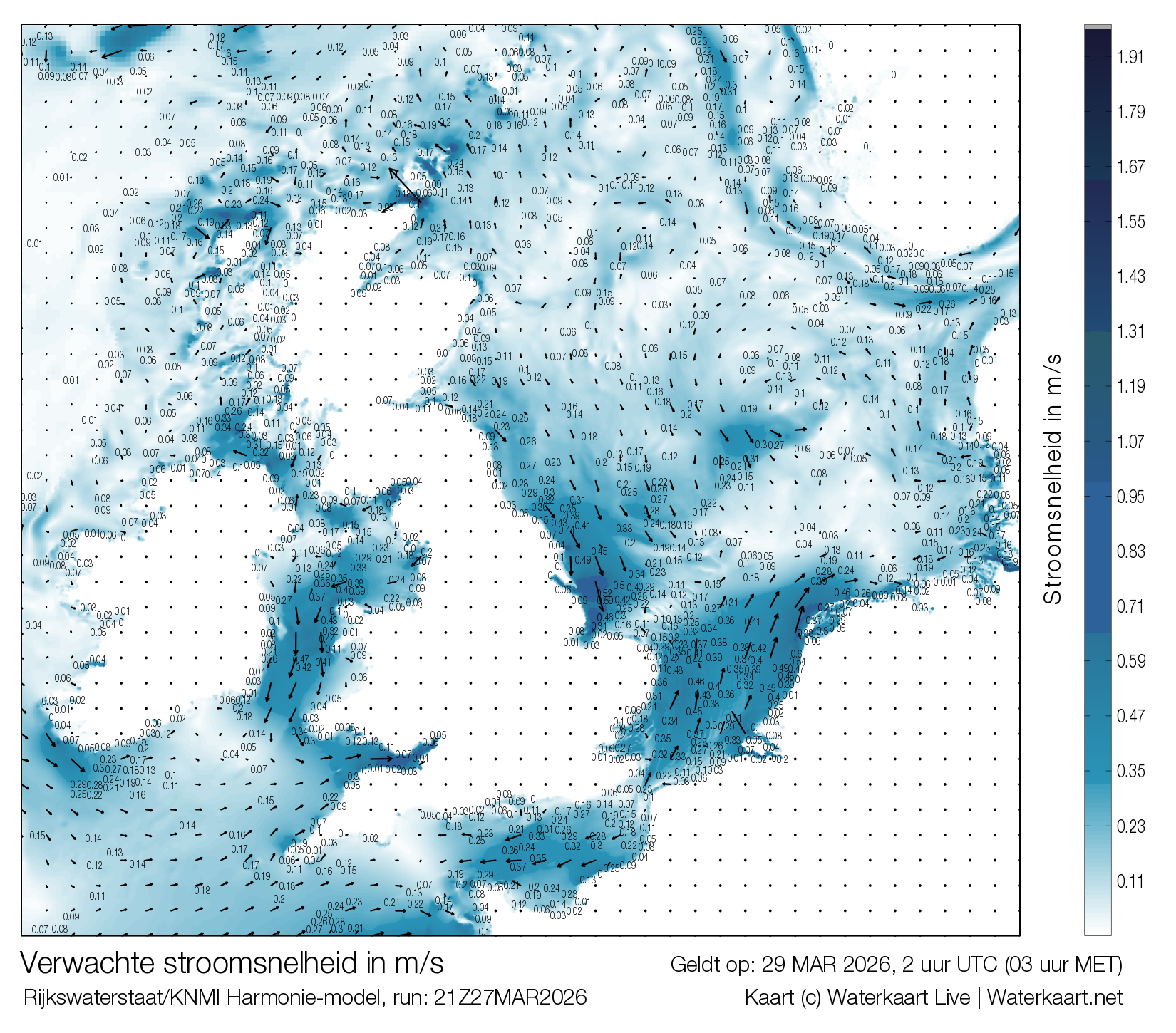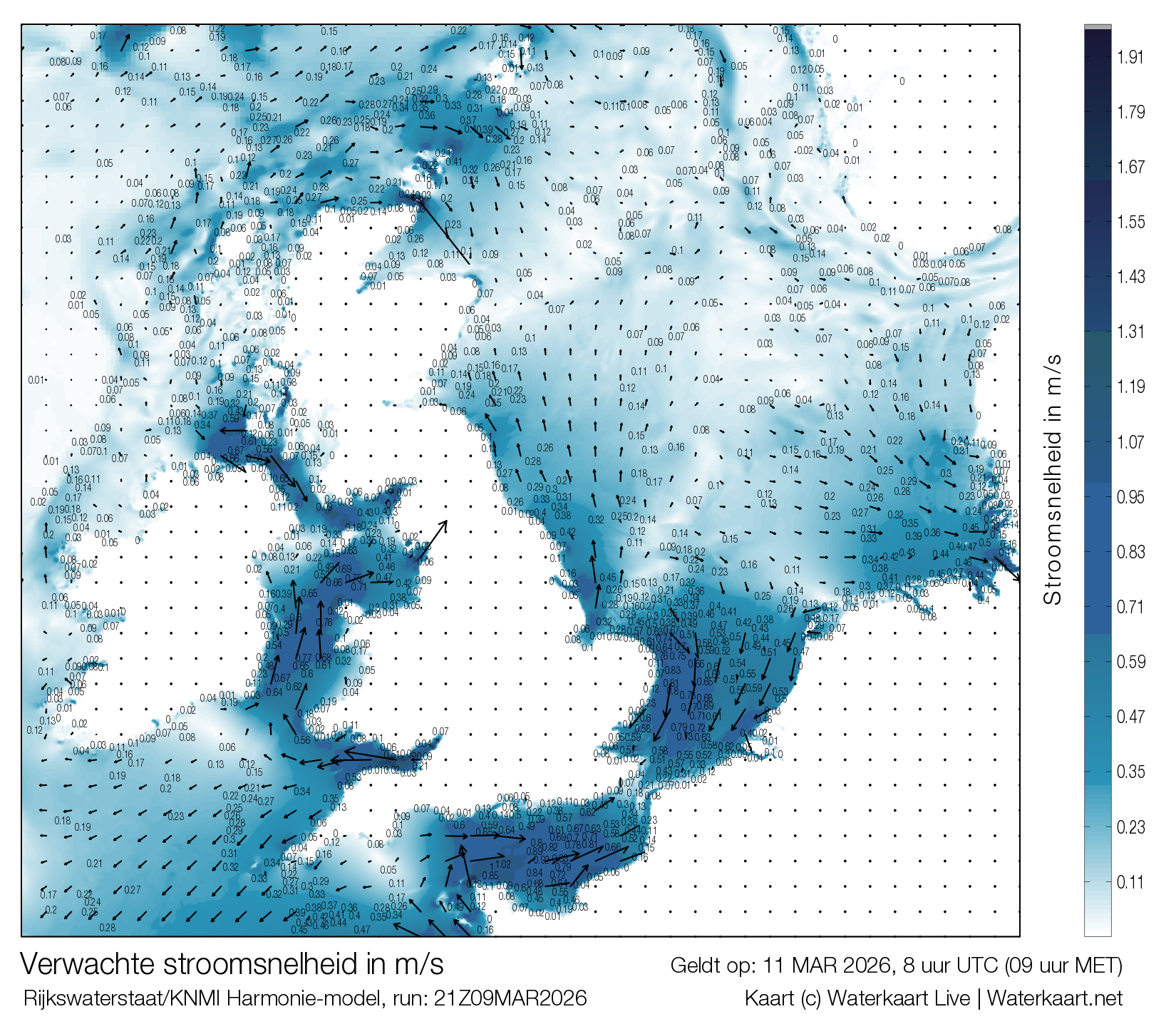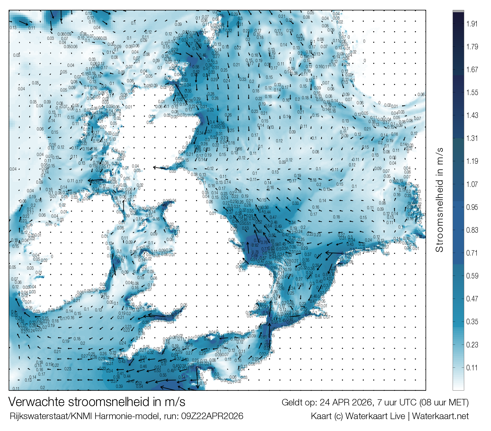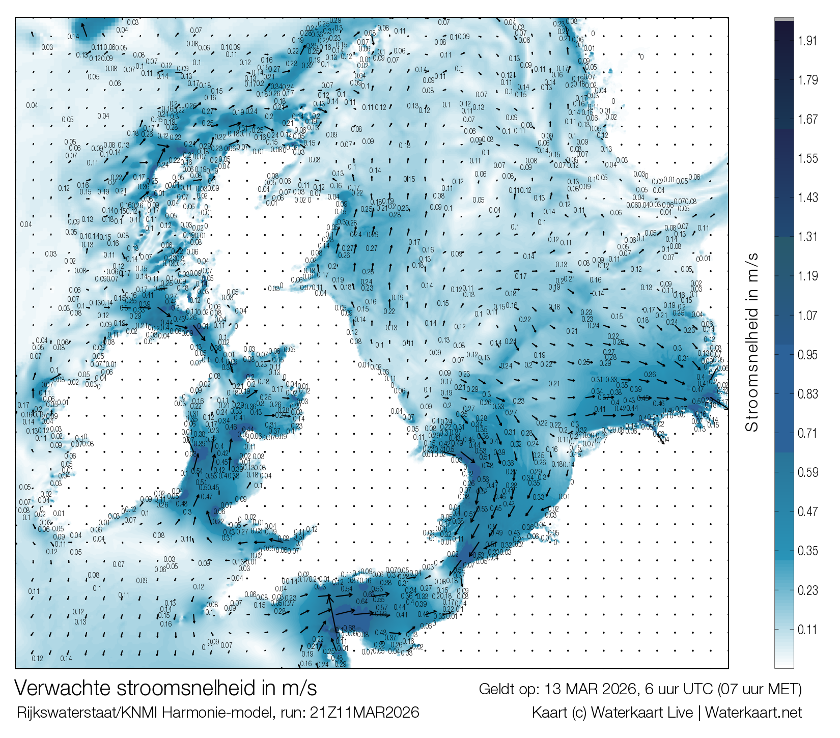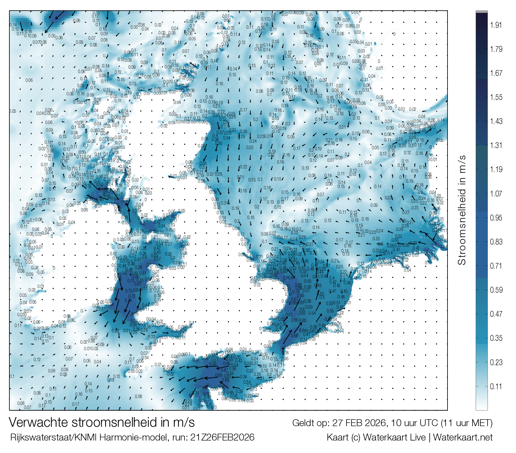 Stroomsnelheden in de Noordzee op basis van de Stroomatlas, verrekend met weersinvloeden. Deze worden iedere dag ververst met data uit het zeestromingen model van Rijkswaterstaat op basis van Harmonie weerdata, voor ieder uur een kaart, tot 48 uur in de toekomst. Lees hieronder meer over dit model