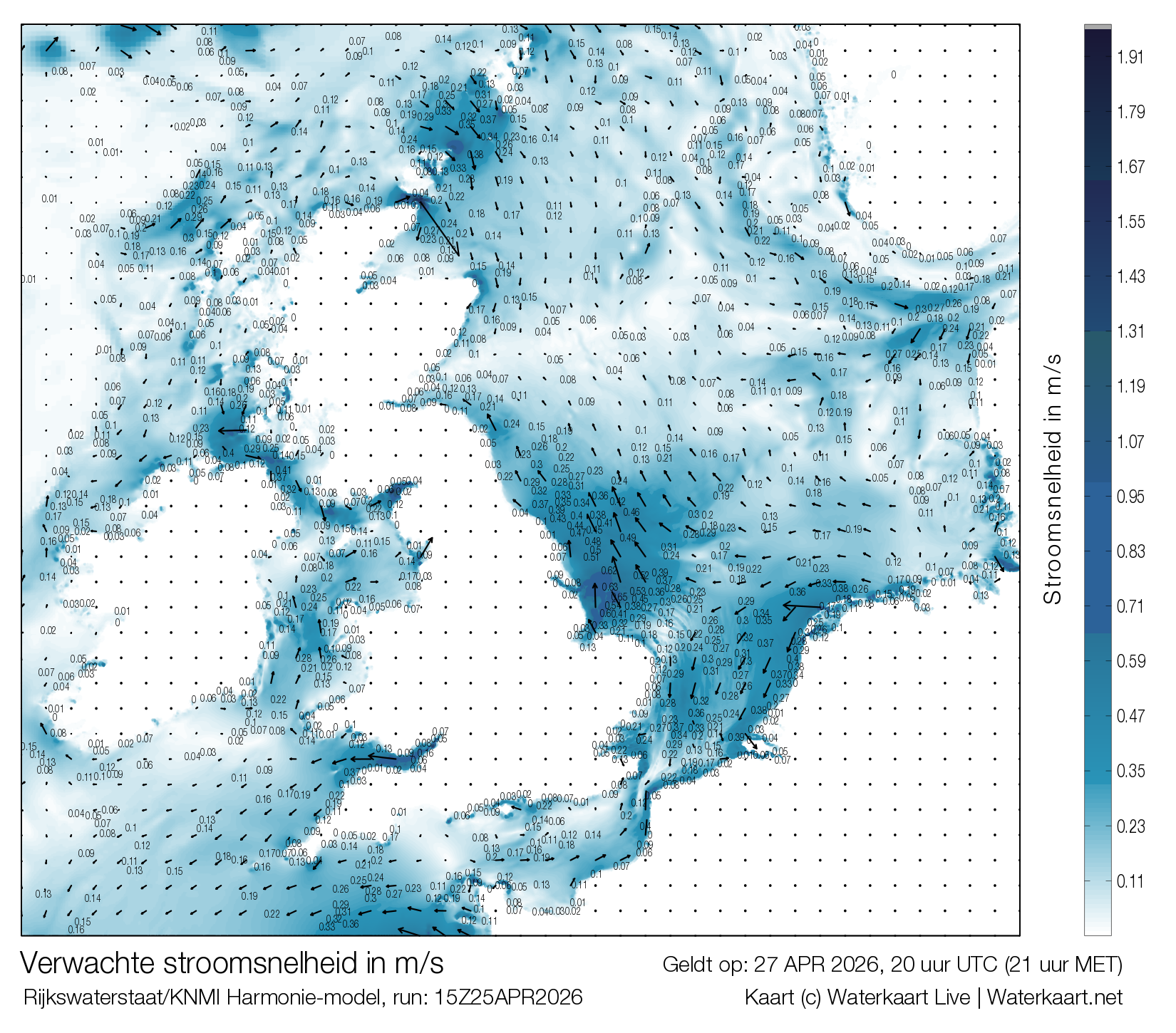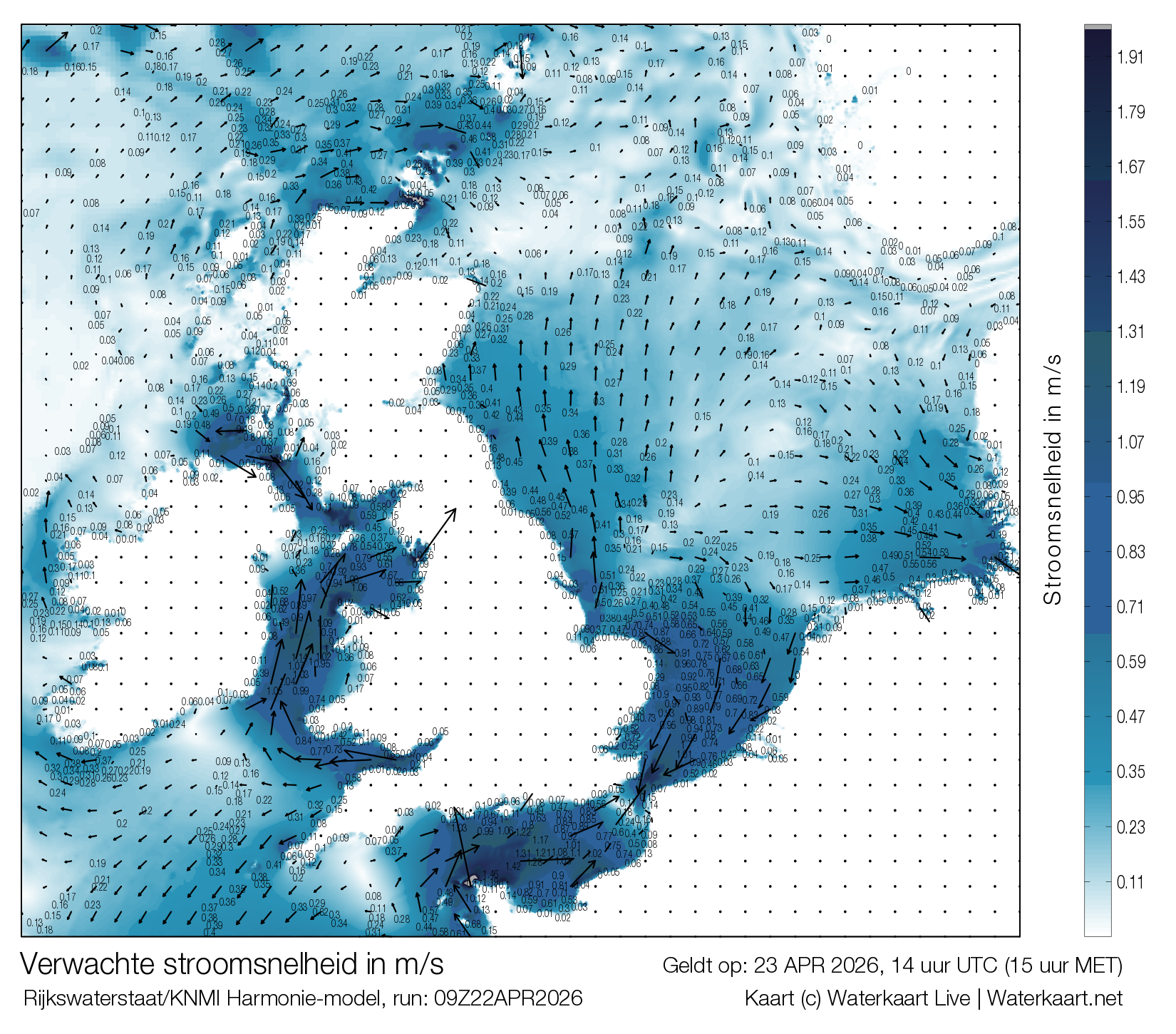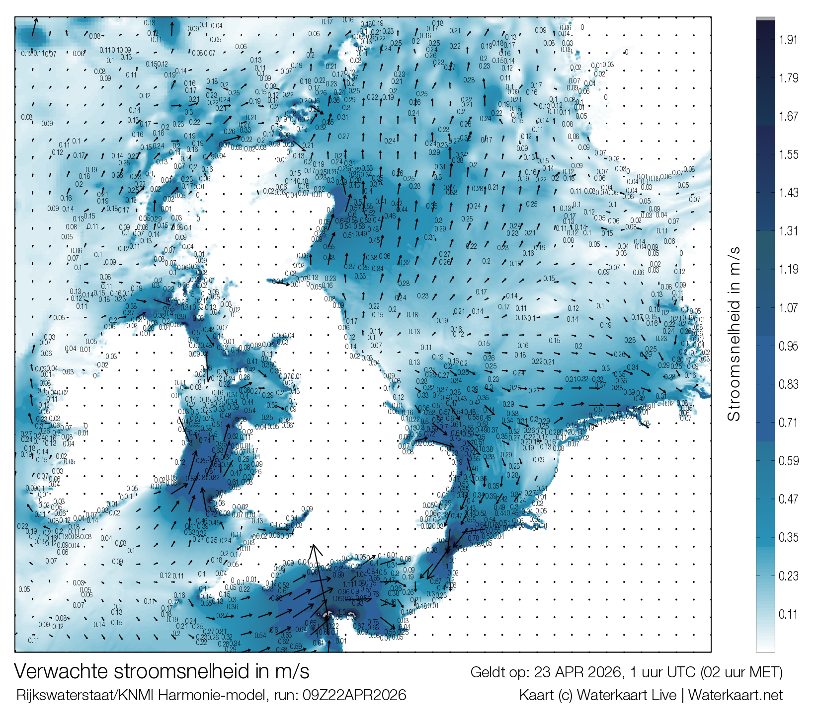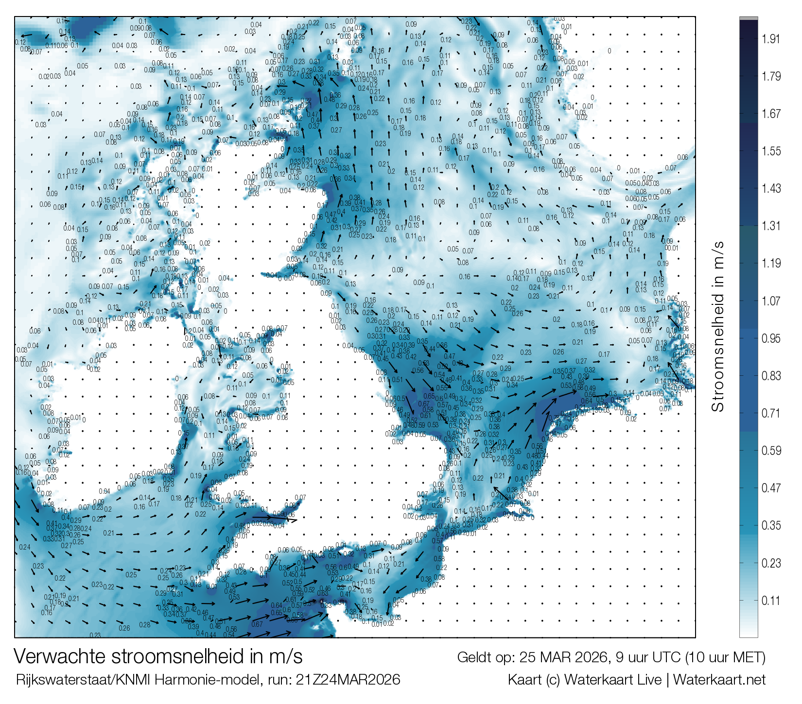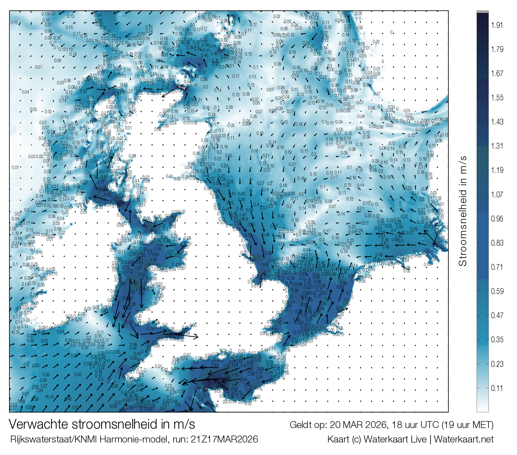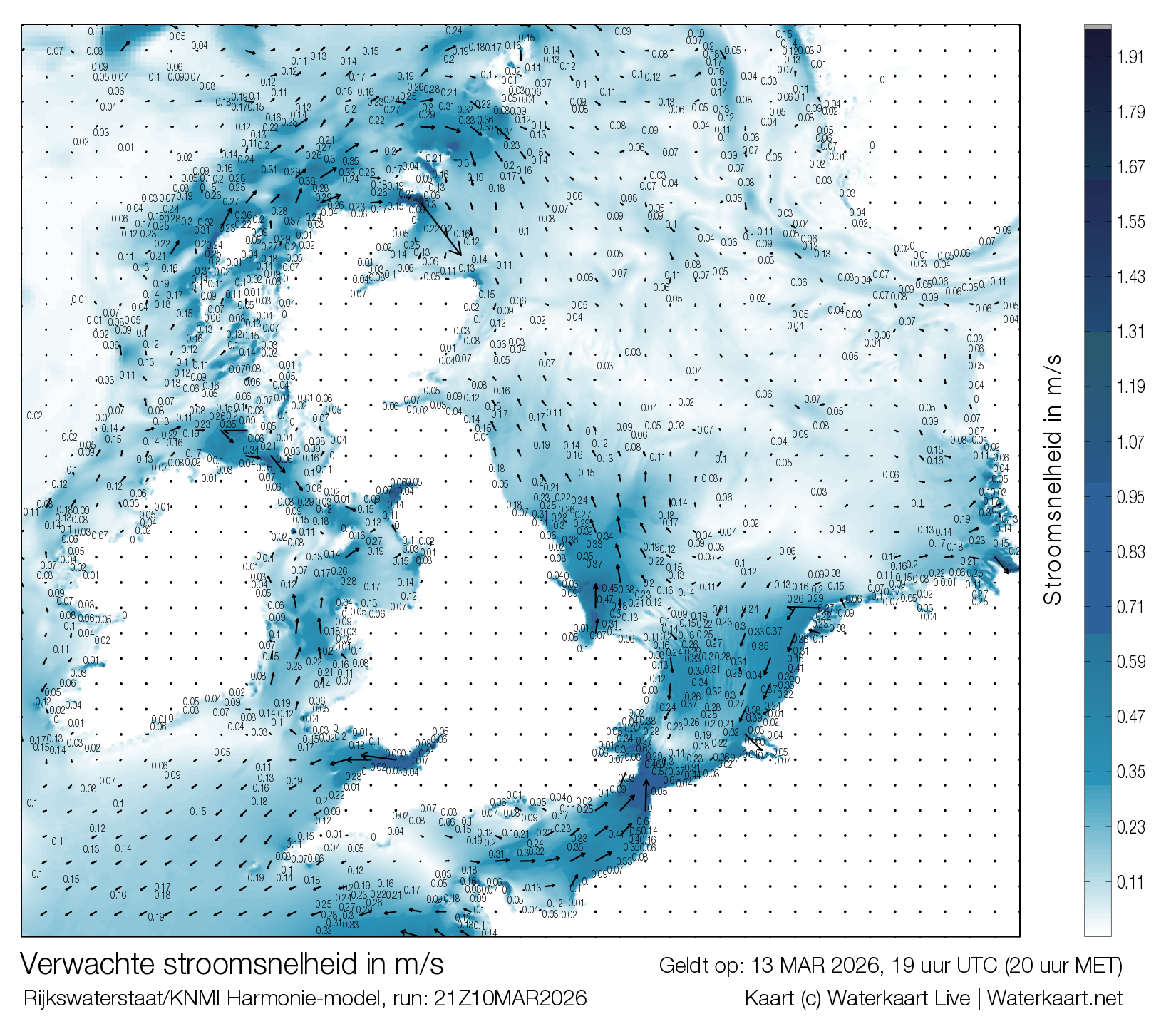 Stroomsnelheden in de Noordzee op basis van de Stroomatlas, verrekend met weersinvloeden. Deze worden iedere dag ververst met data uit het zeestromingen model van Rijkswaterstaat op basis van Harmonie weerdata, voor ieder uur een kaart, tot 48 uur in de toekomst. Lees hieronder meer over dit model