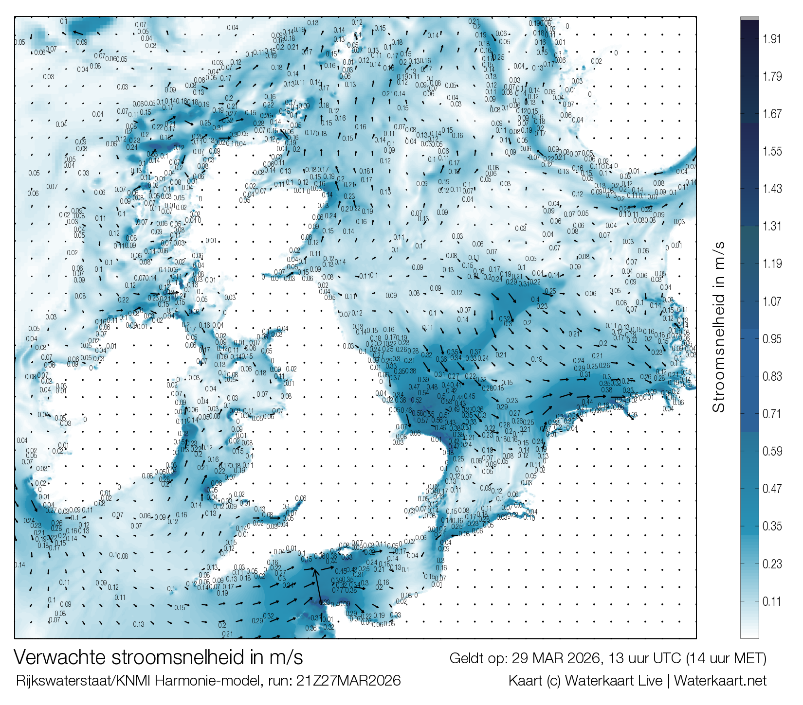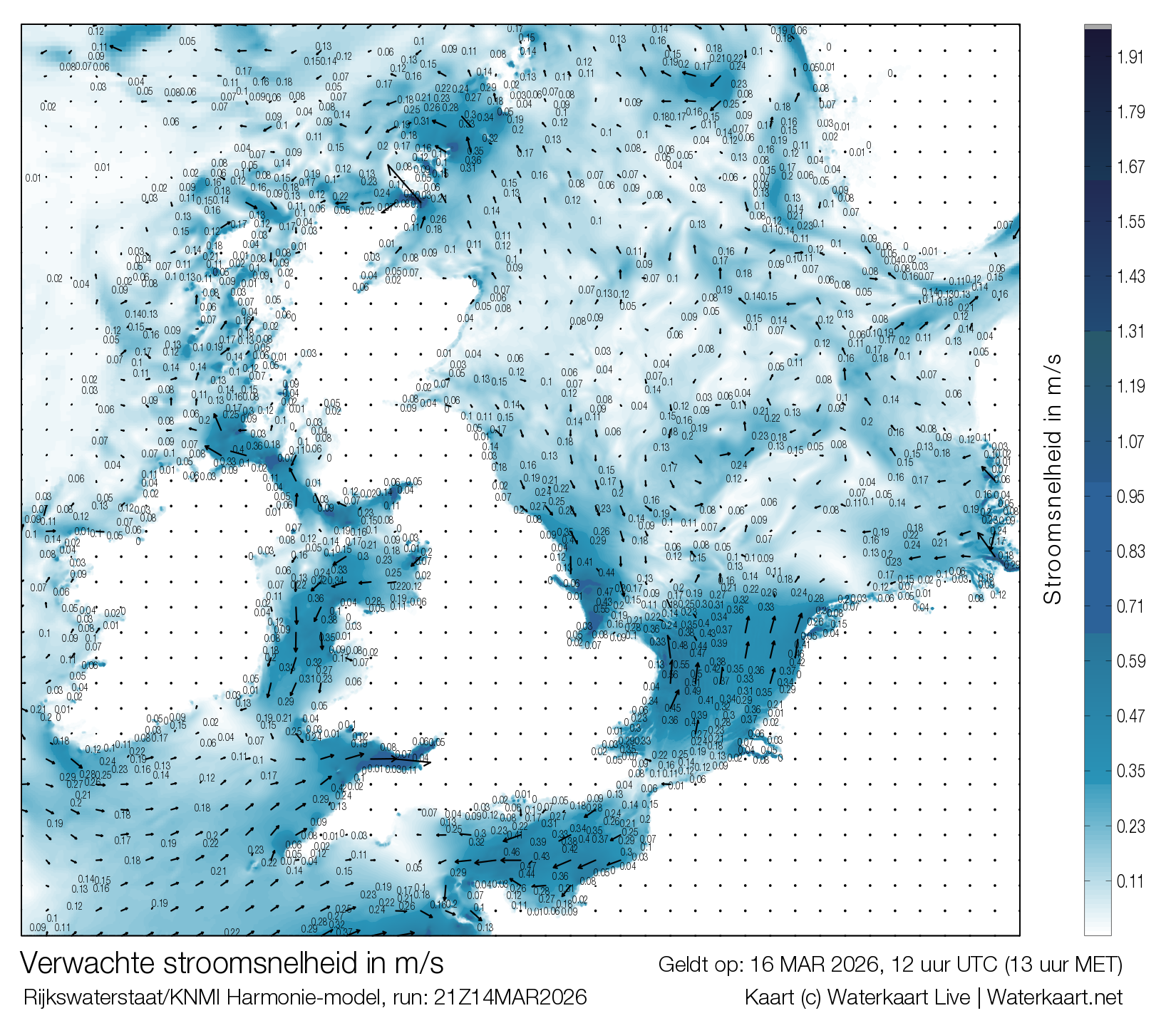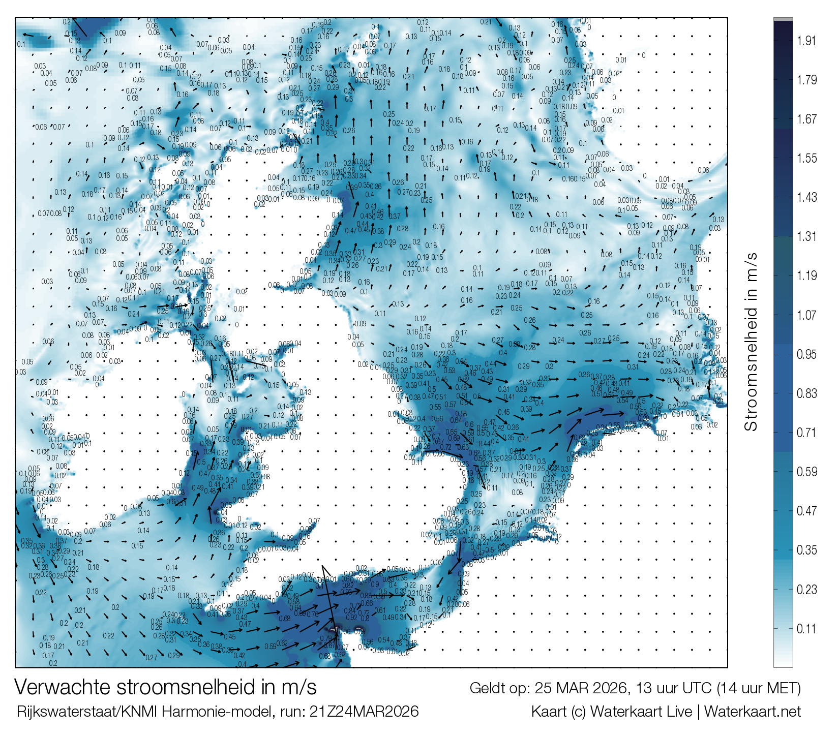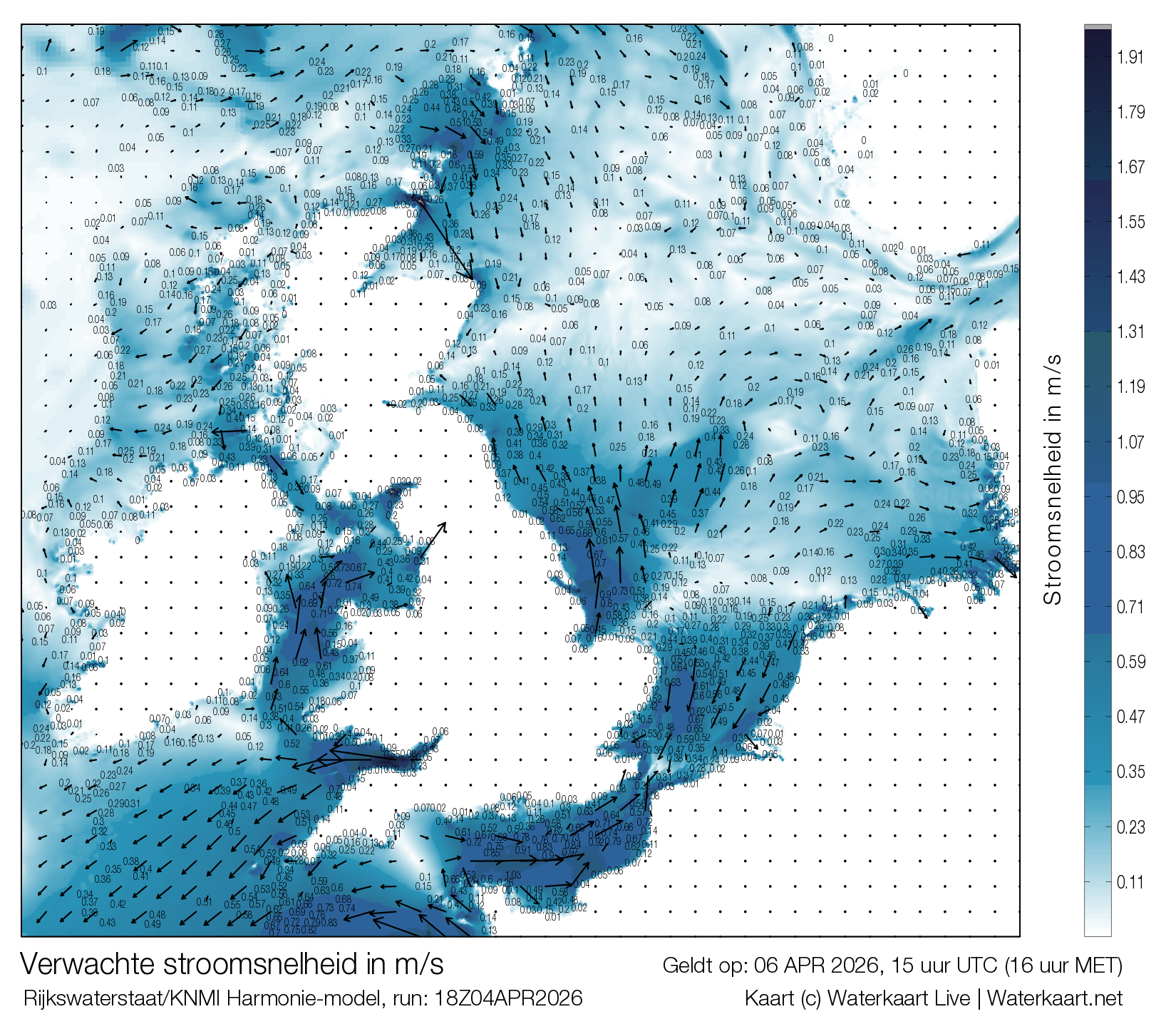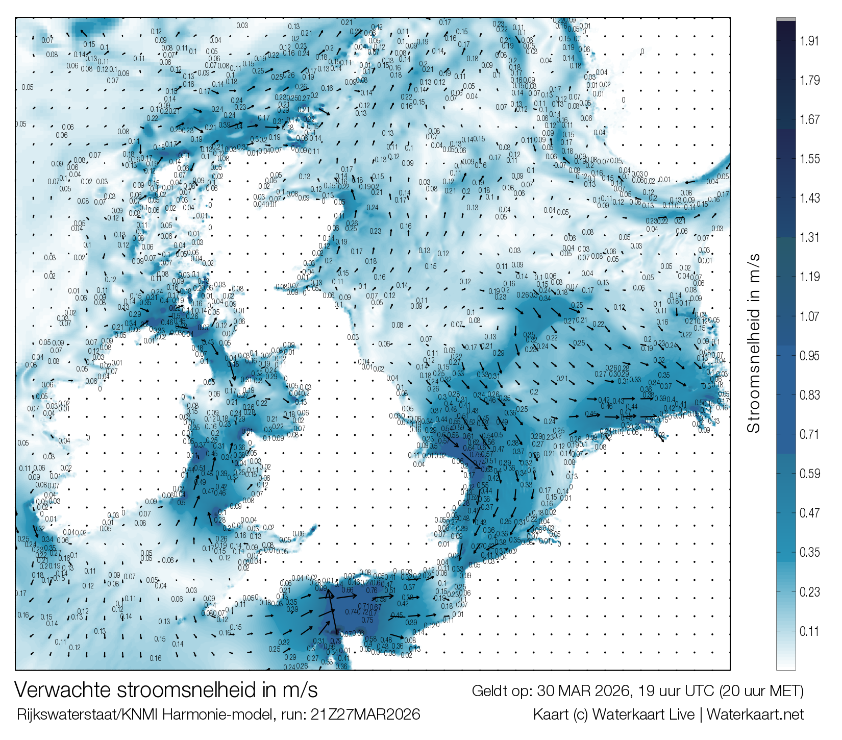 Stroomsnelheden in de Noordzee op basis van de Stroomatlas, verrekend met weersinvloeden. Deze worden iedere dag ververst met data uit het zeestromingen model van Rijkswaterstaat op basis van Harmonie weerdata, voor ieder uur een kaart, tot 48 uur in de toekomst. Lees hieronder meer over dit model