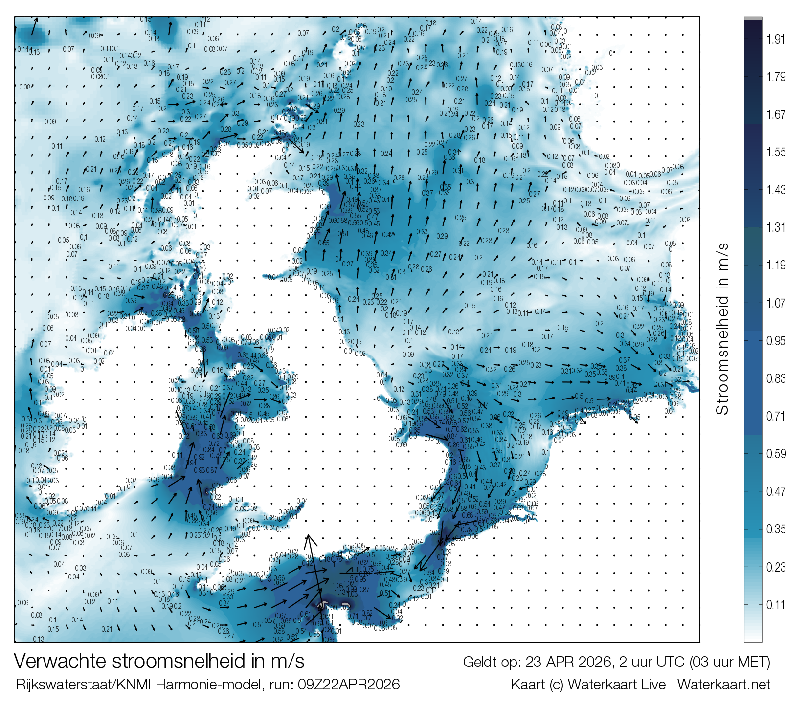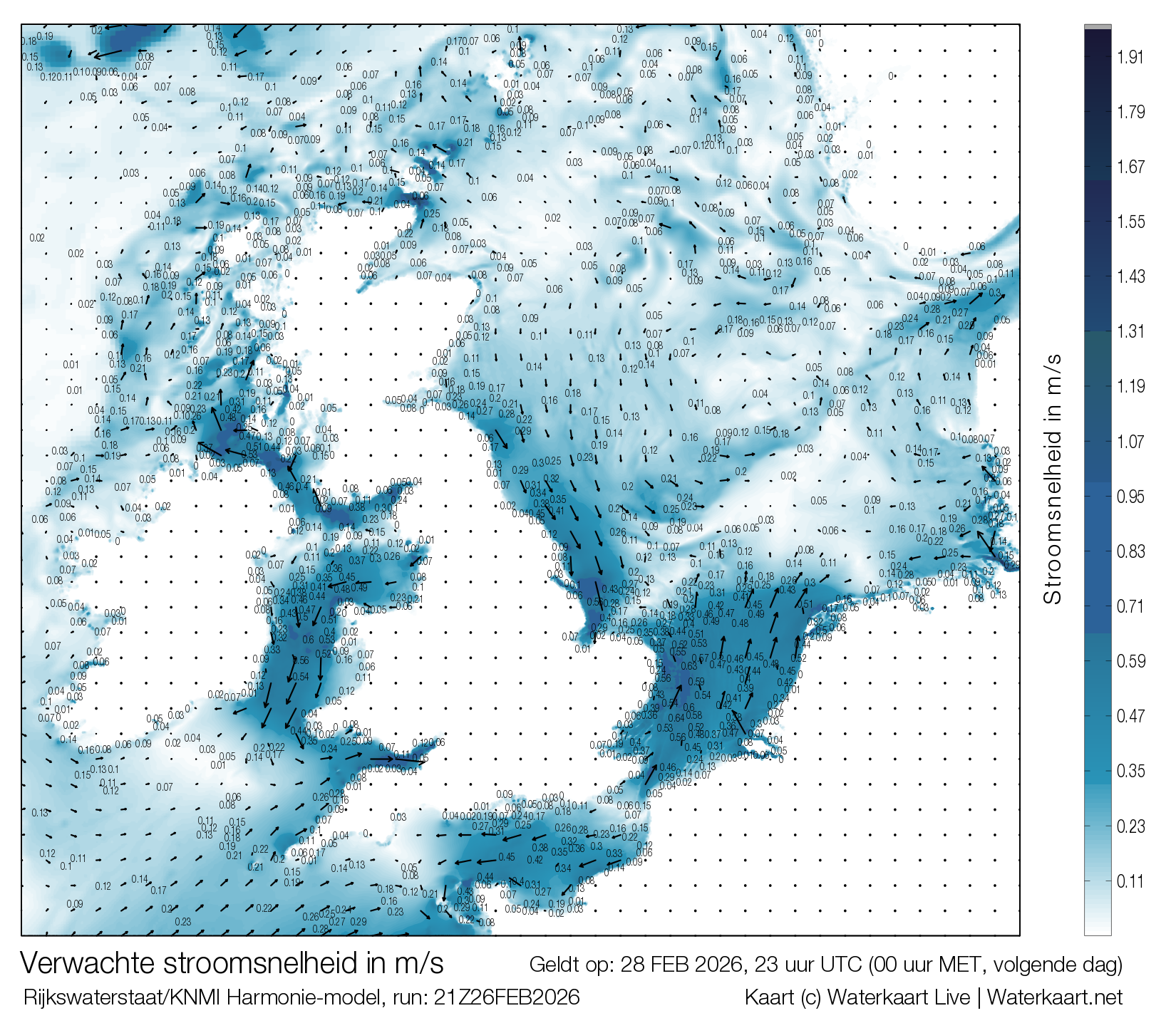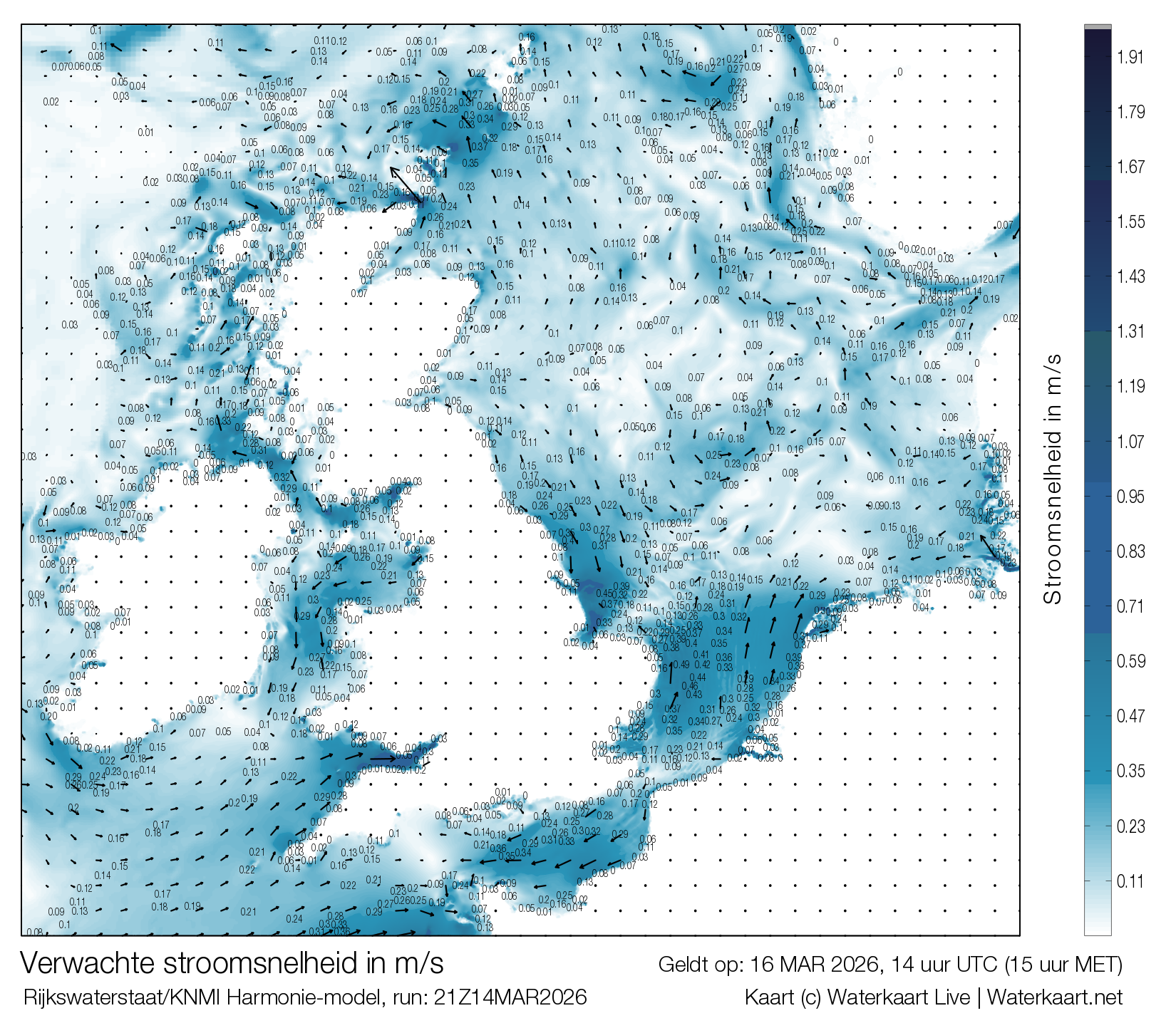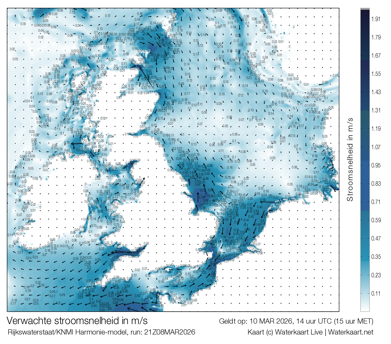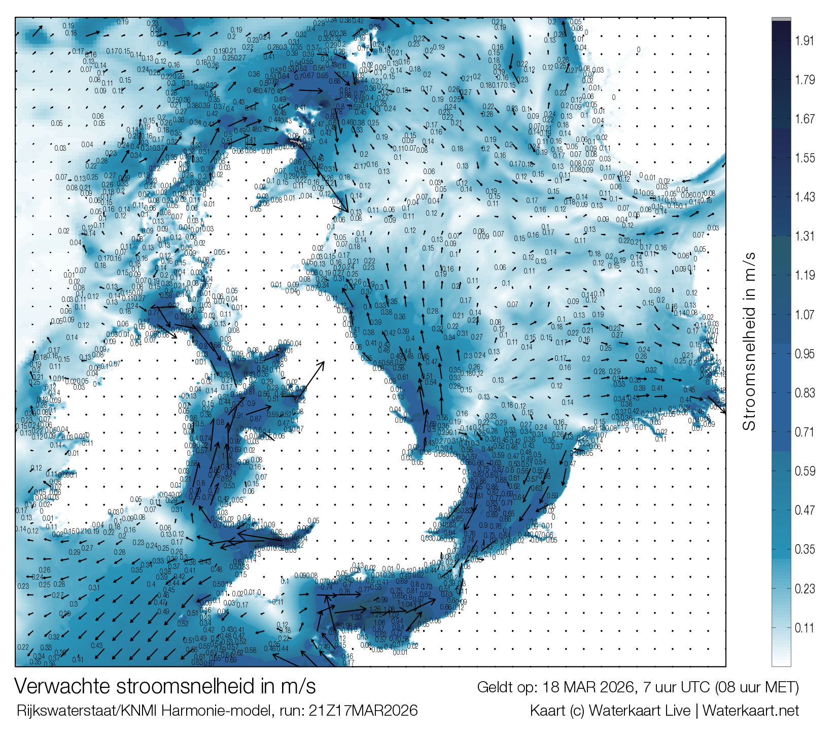 Stroomsnelheden in de Noordzee op basis van de Stroomatlas, verrekend met weersinvloeden. Deze worden iedere dag ververst met data uit het zeestromingen model van Rijkswaterstaat op basis van Harmonie weerdata, voor ieder uur een kaart, tot 48 uur in de toekomst. Lees hieronder meer over dit model