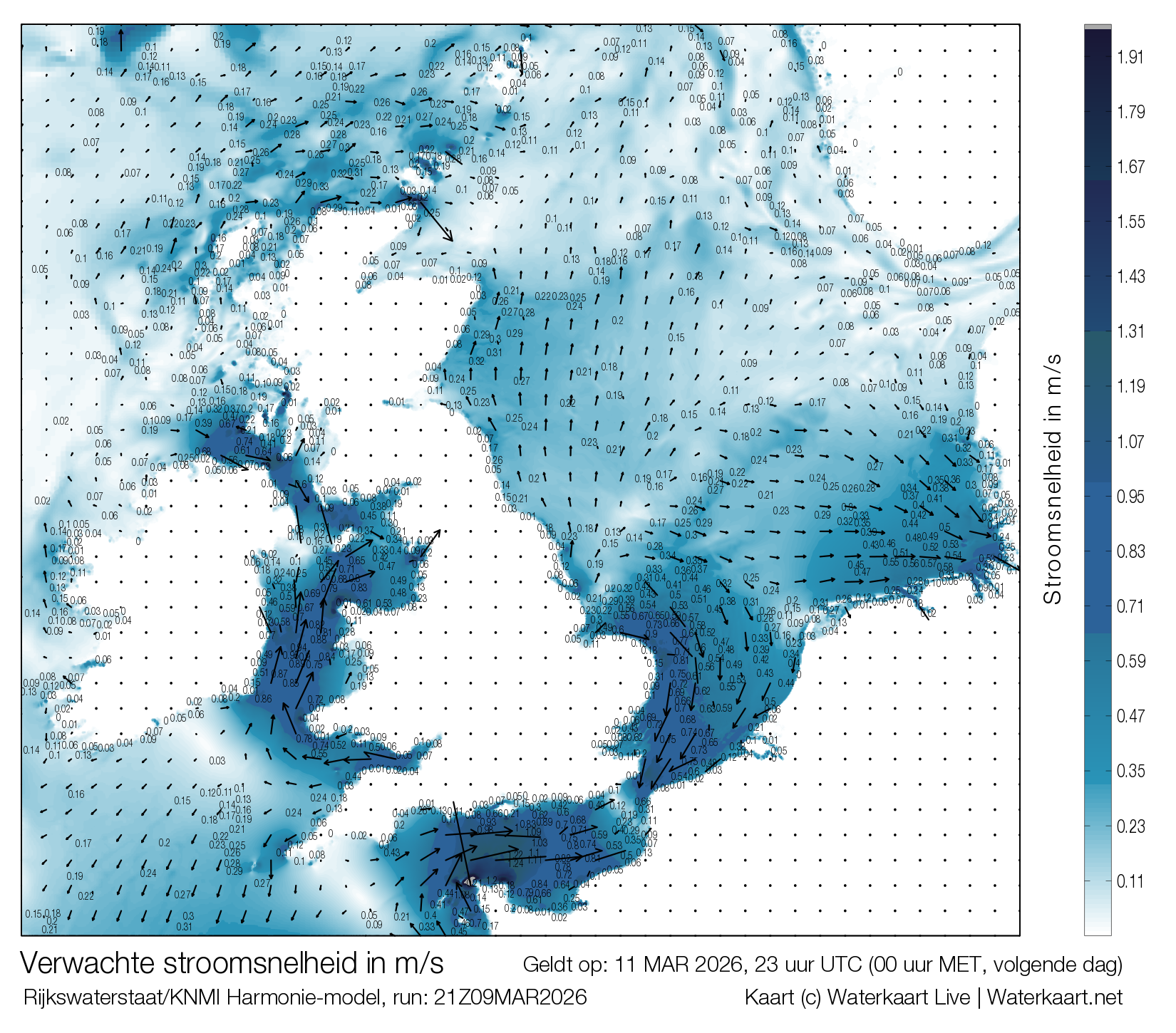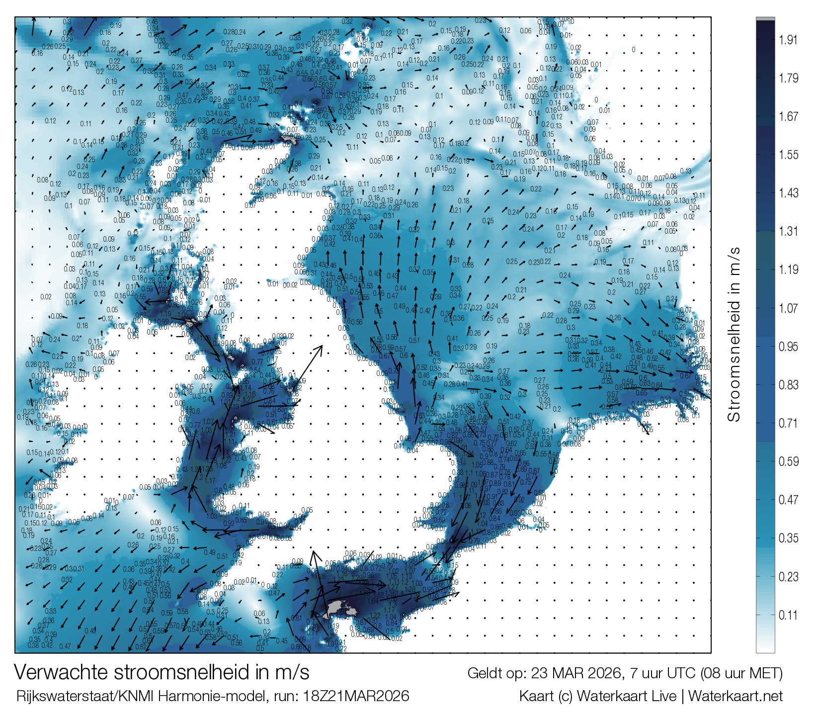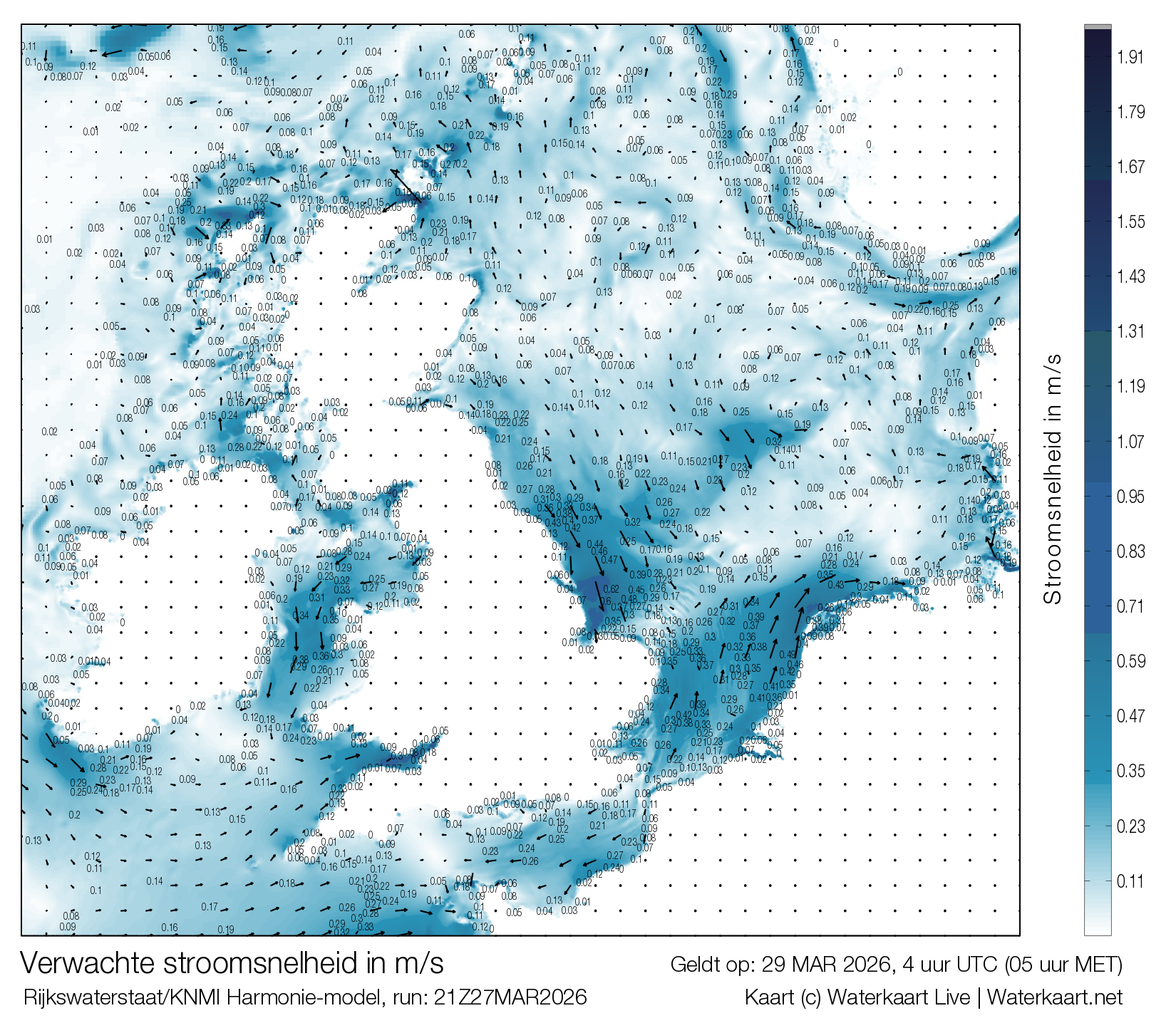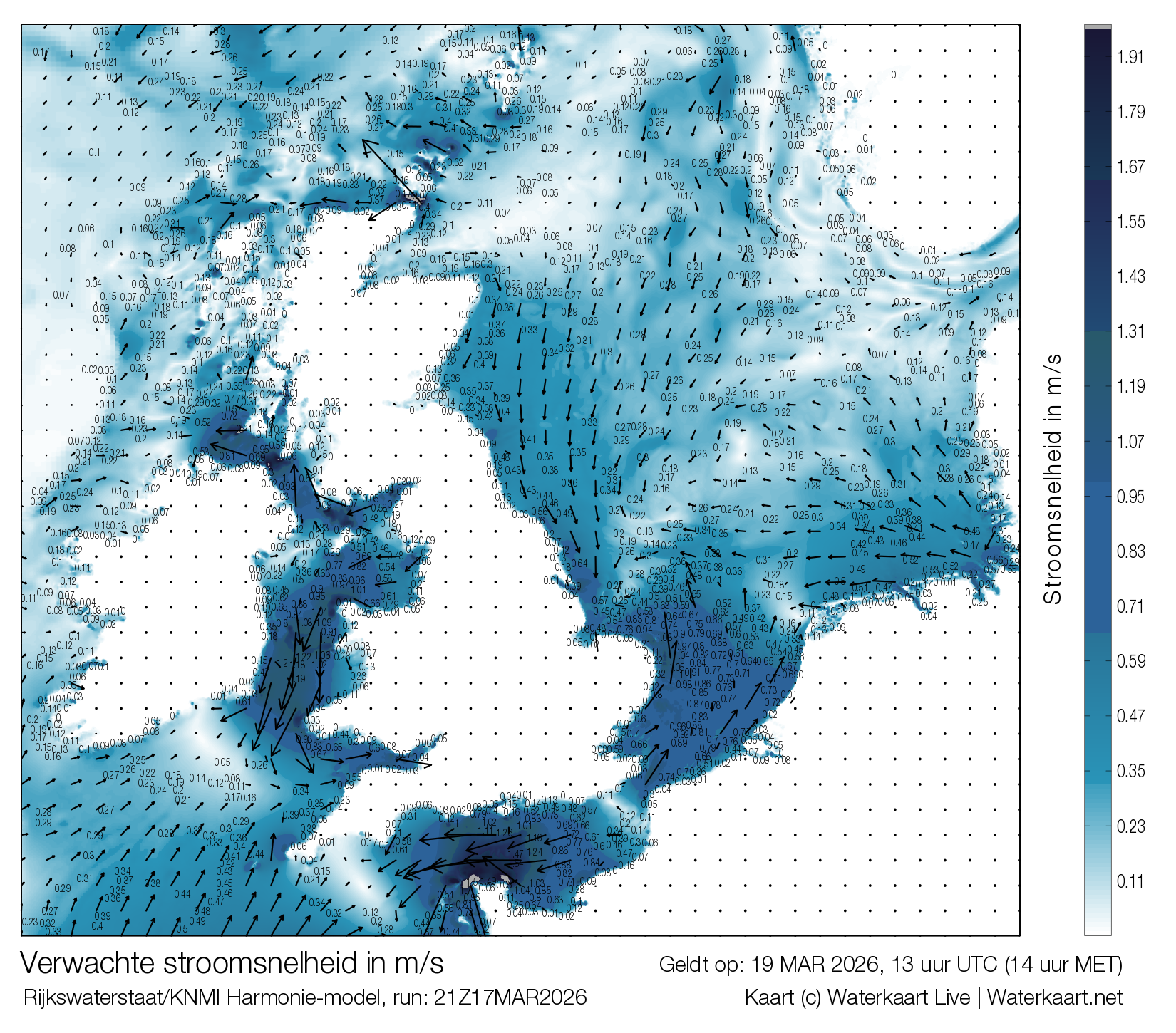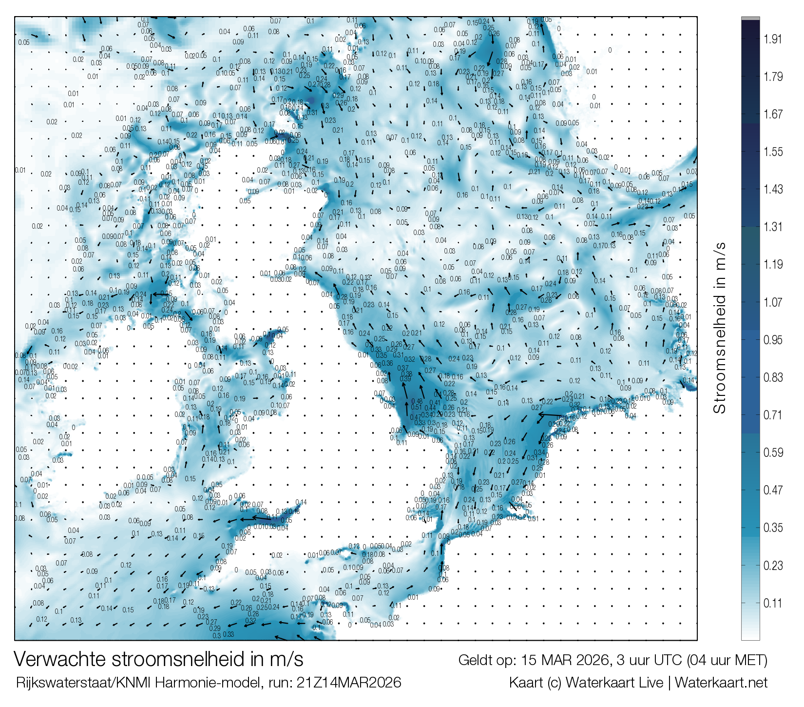 Stroomsnelheden in de Noordzee op basis van de Stroomatlas, verrekend met weersinvloeden. Deze worden iedere dag ververst met data uit het zeestromingen model van Rijkswaterstaat op basis van Harmonie weerdata, voor ieder uur een kaart, tot 48 uur in de toekomst. Lees hieronder meer over dit model