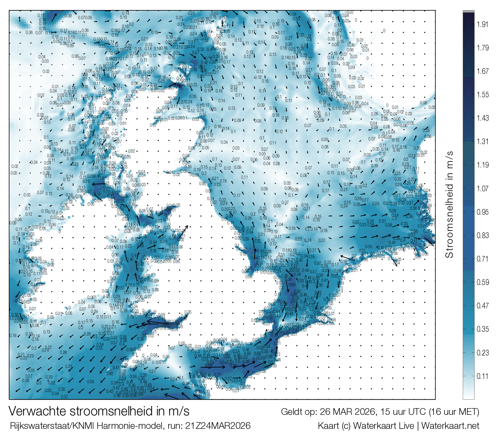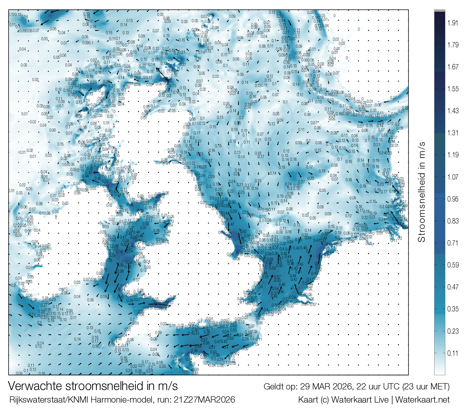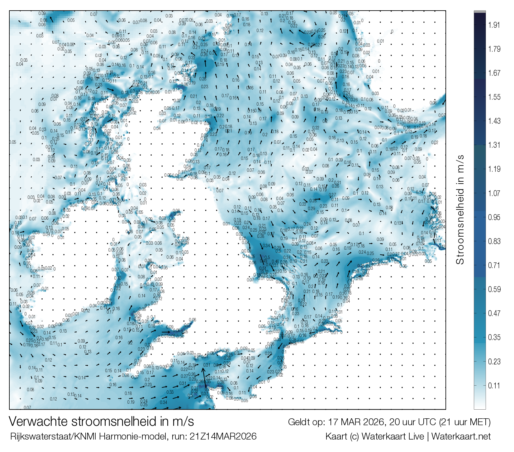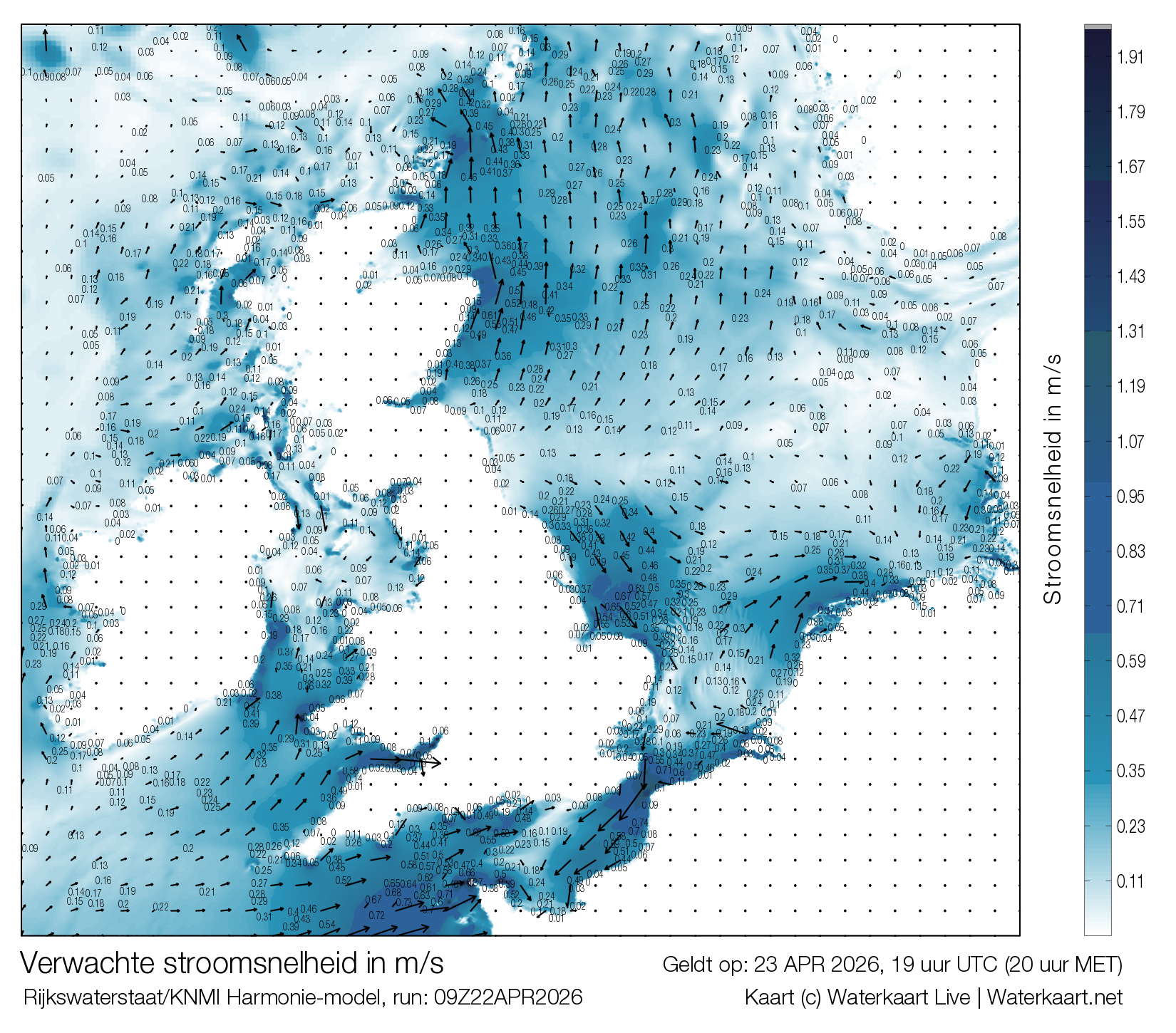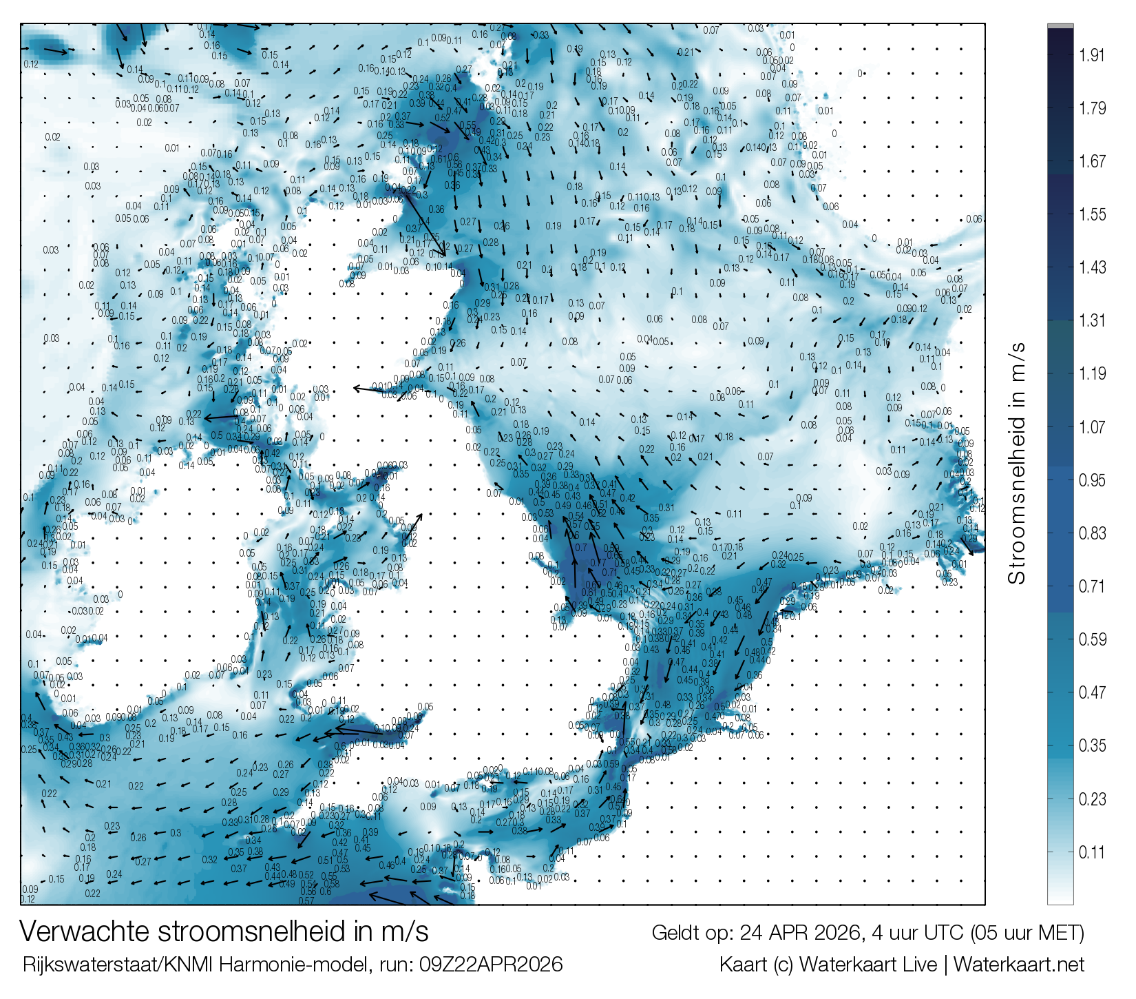 Stroomsnelheden in de Noordzee op basis van de Stroomatlas, verrekend met weersinvloeden. Deze worden iedere dag ververst met data uit het zeestromingen model van Rijkswaterstaat op basis van Harmonie weerdata, voor ieder uur een kaart, tot 48 uur in de toekomst. Lees hieronder meer over dit model