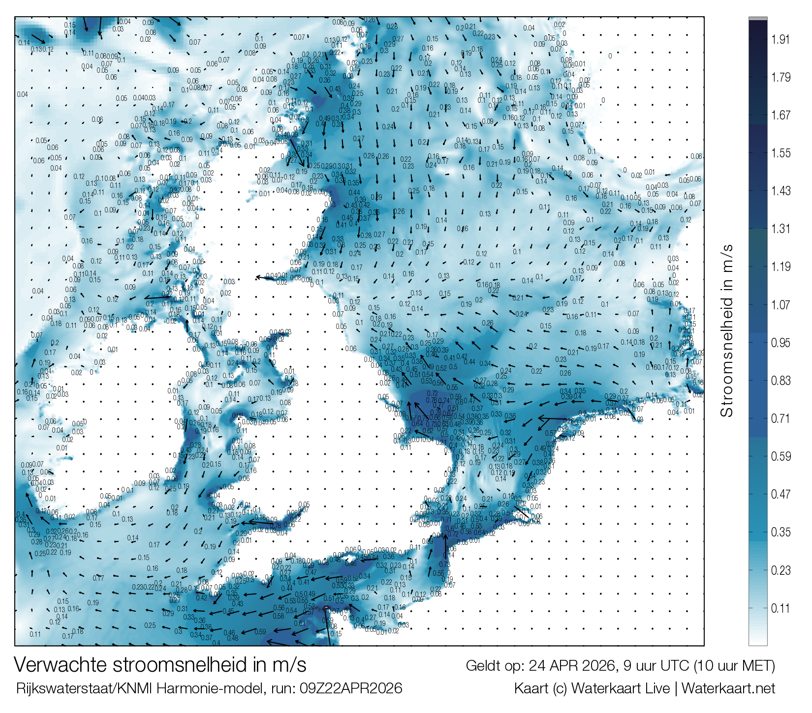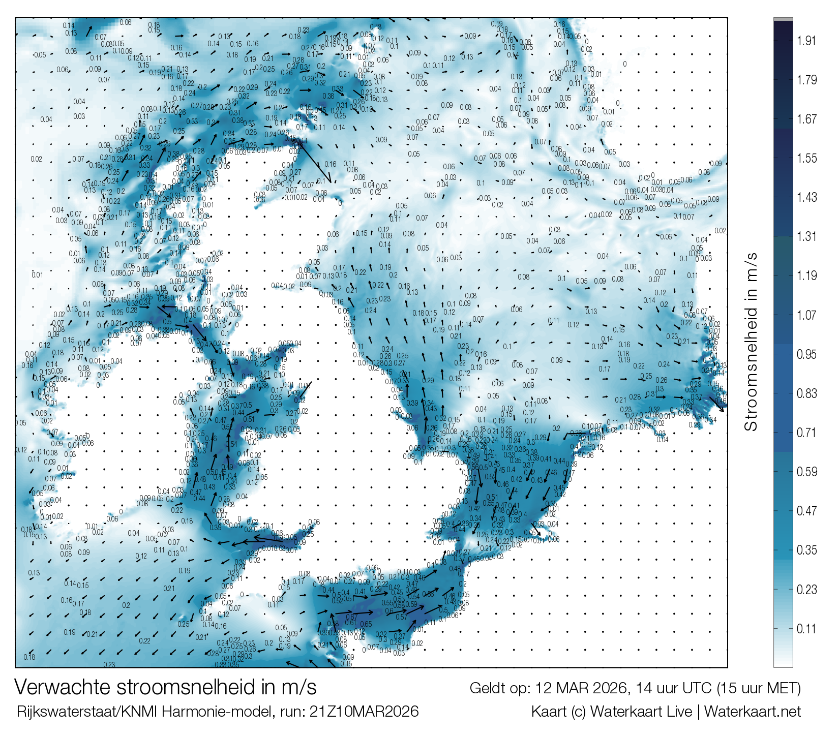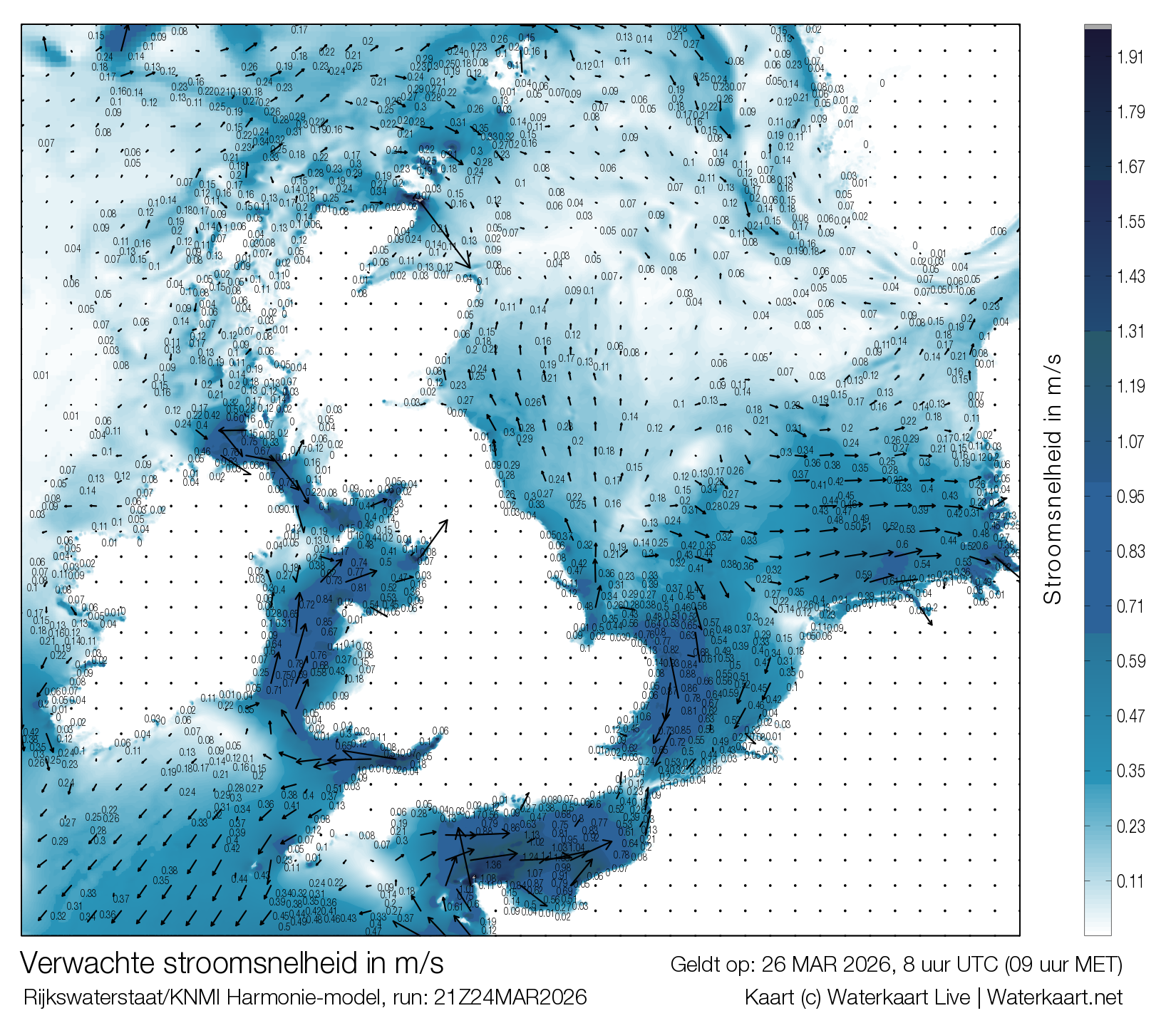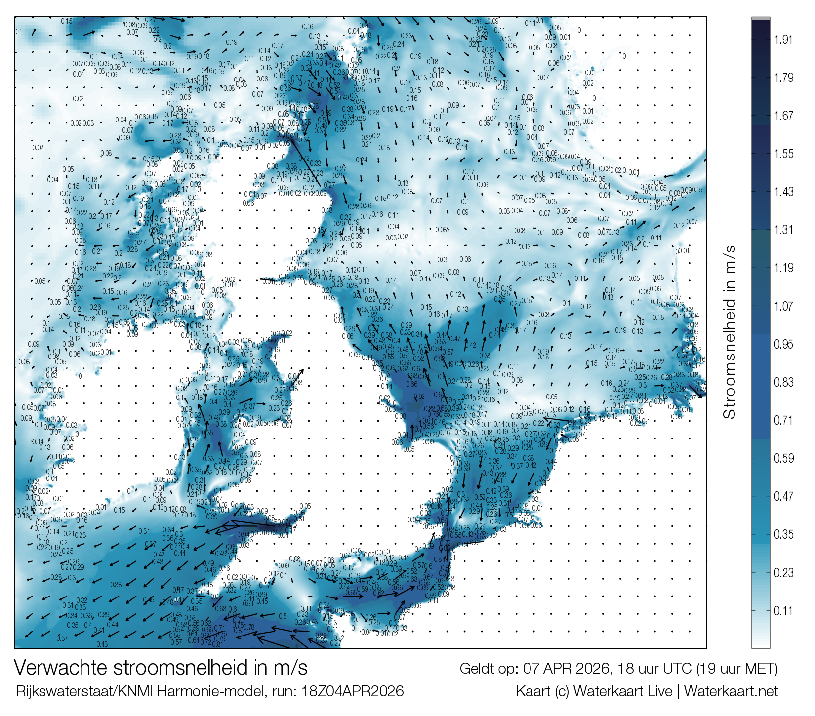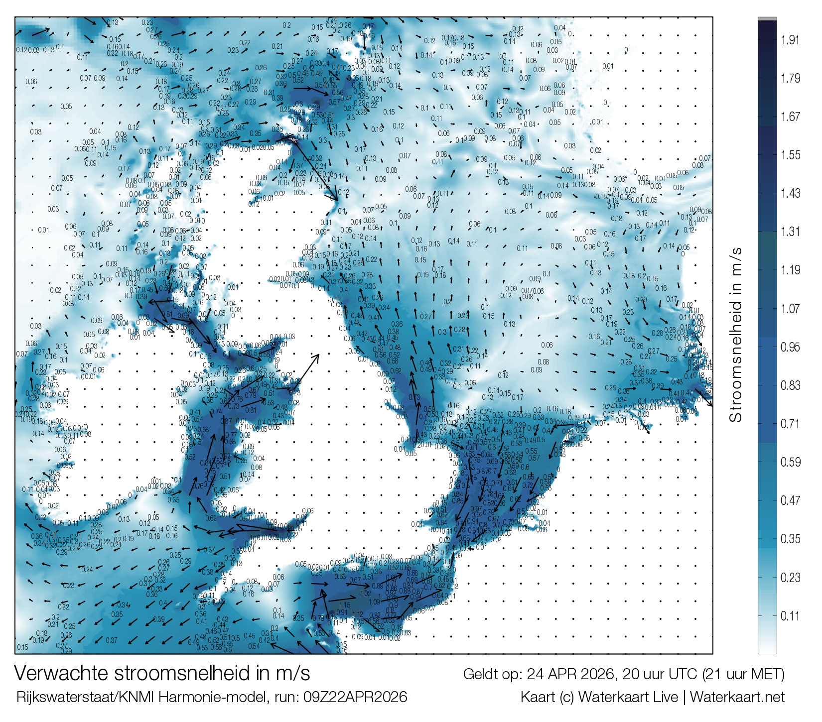 Stroomsnelheden in de Noordzee op basis van de Stroomatlas, verrekend met weersinvloeden. Deze worden iedere dag ververst met data uit het zeestromingen model van Rijkswaterstaat op basis van Harmonie weerdata, voor ieder uur een kaart, tot 48 uur in de toekomst. Lees hieronder meer over dit model
