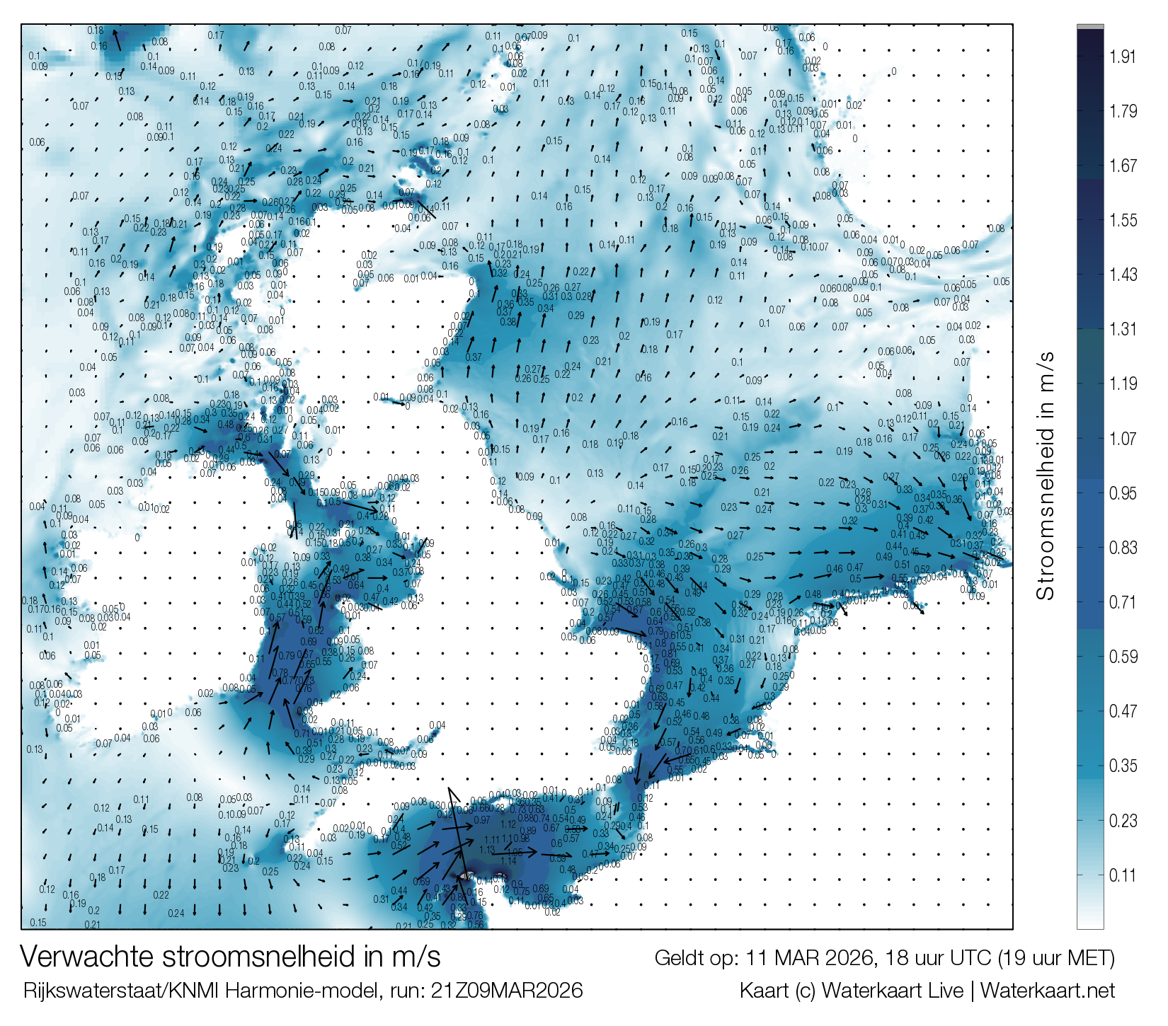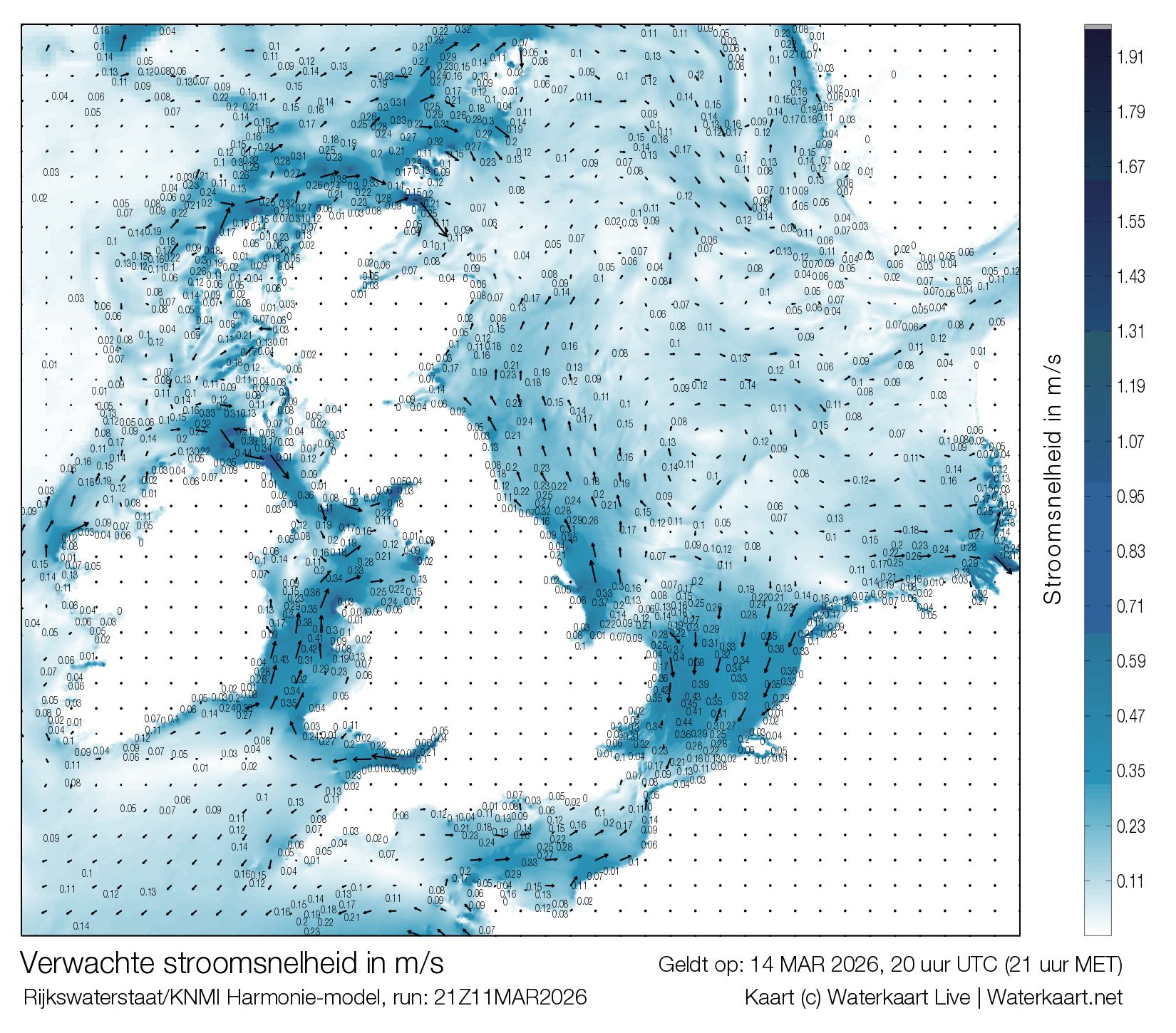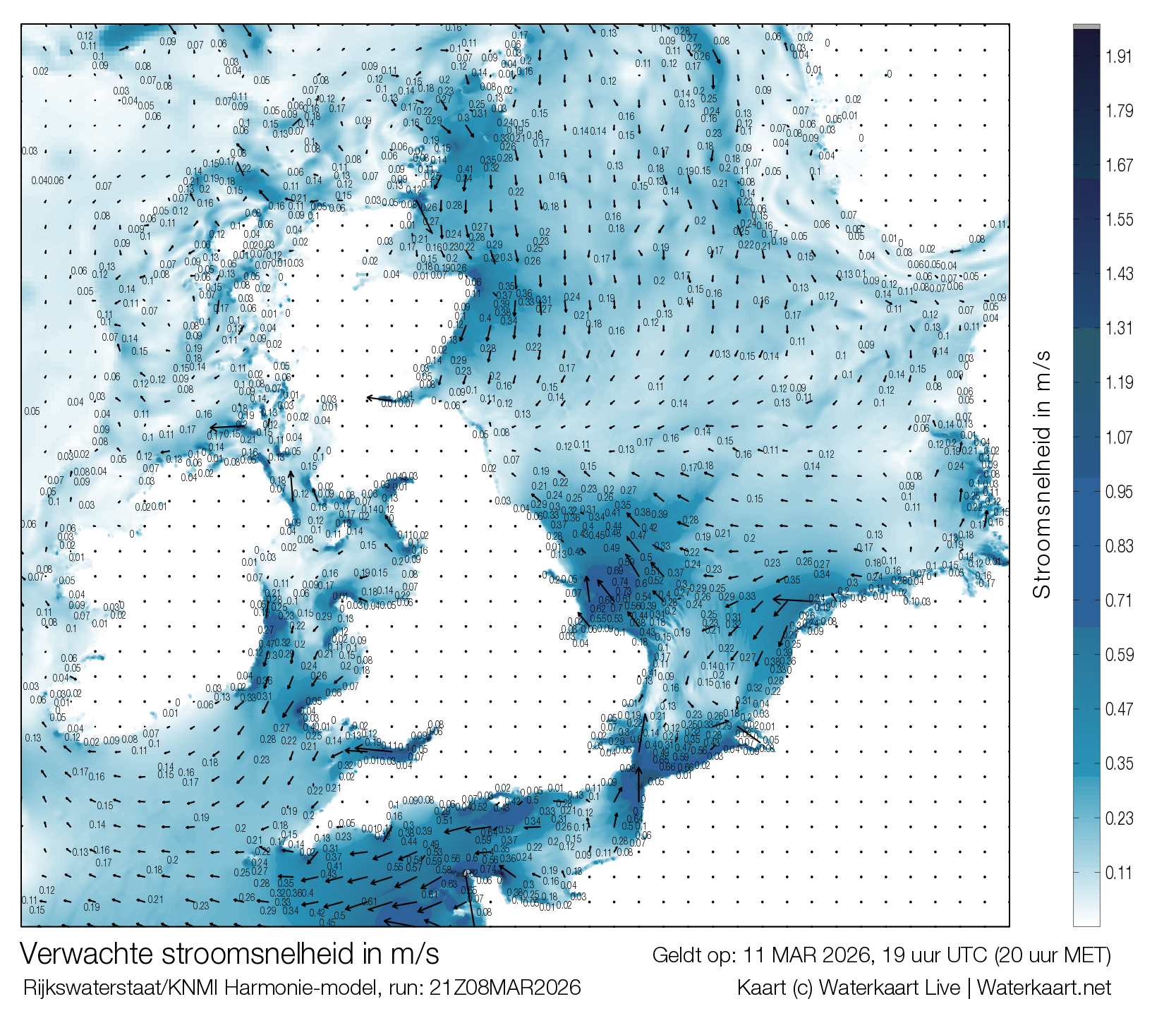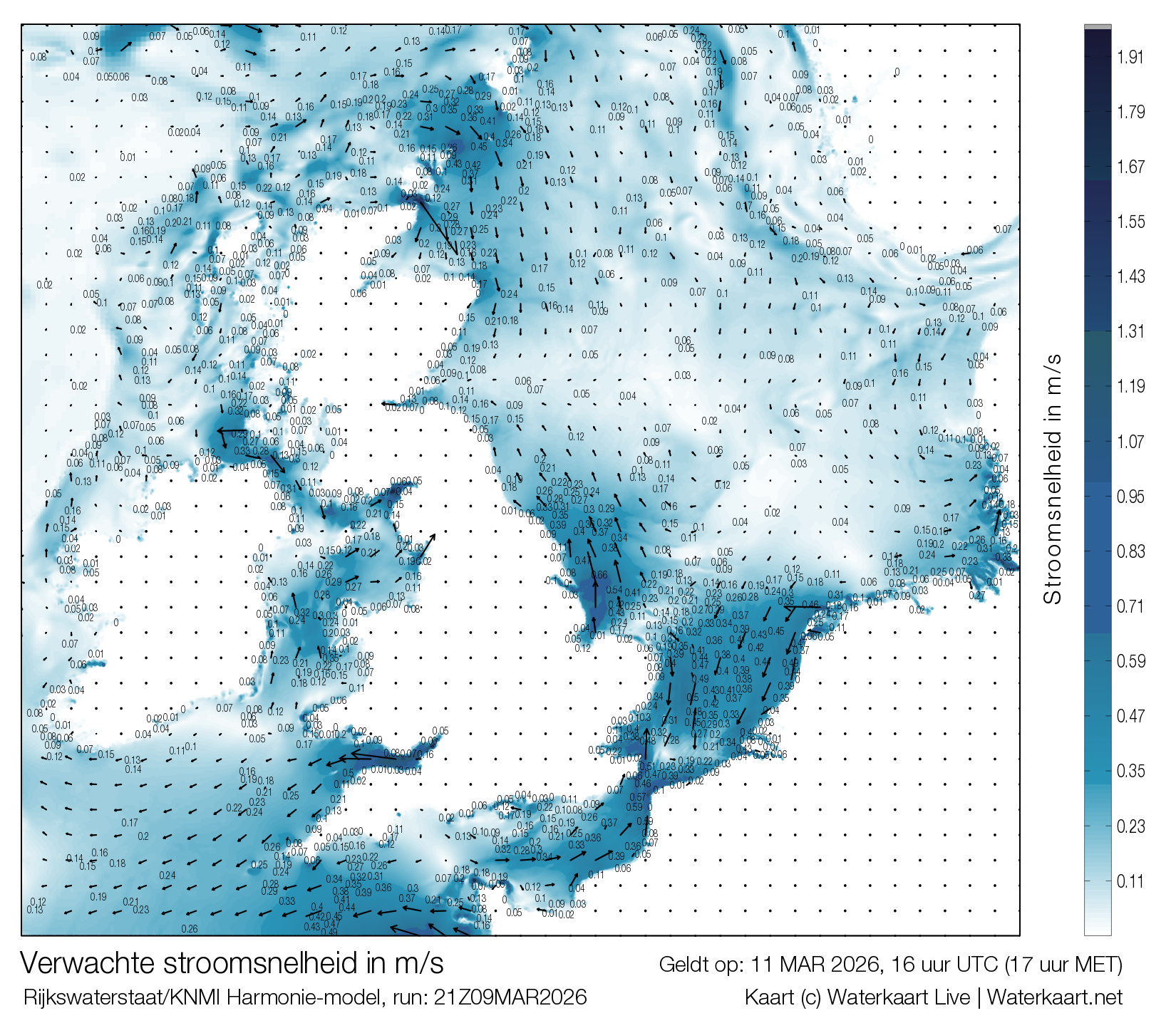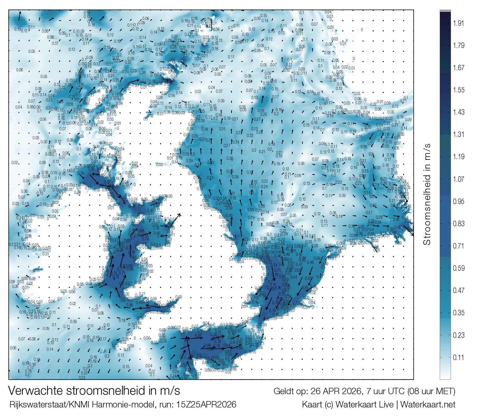 Stroomsnelheden in de Noordzee op basis van de Stroomatlas, verrekend met weersinvloeden. Deze worden iedere dag ververst met data uit het zeestromingen model van Rijkswaterstaat op basis van Harmonie weerdata, voor ieder uur een kaart, tot 48 uur in de toekomst. Lees hieronder meer over dit model