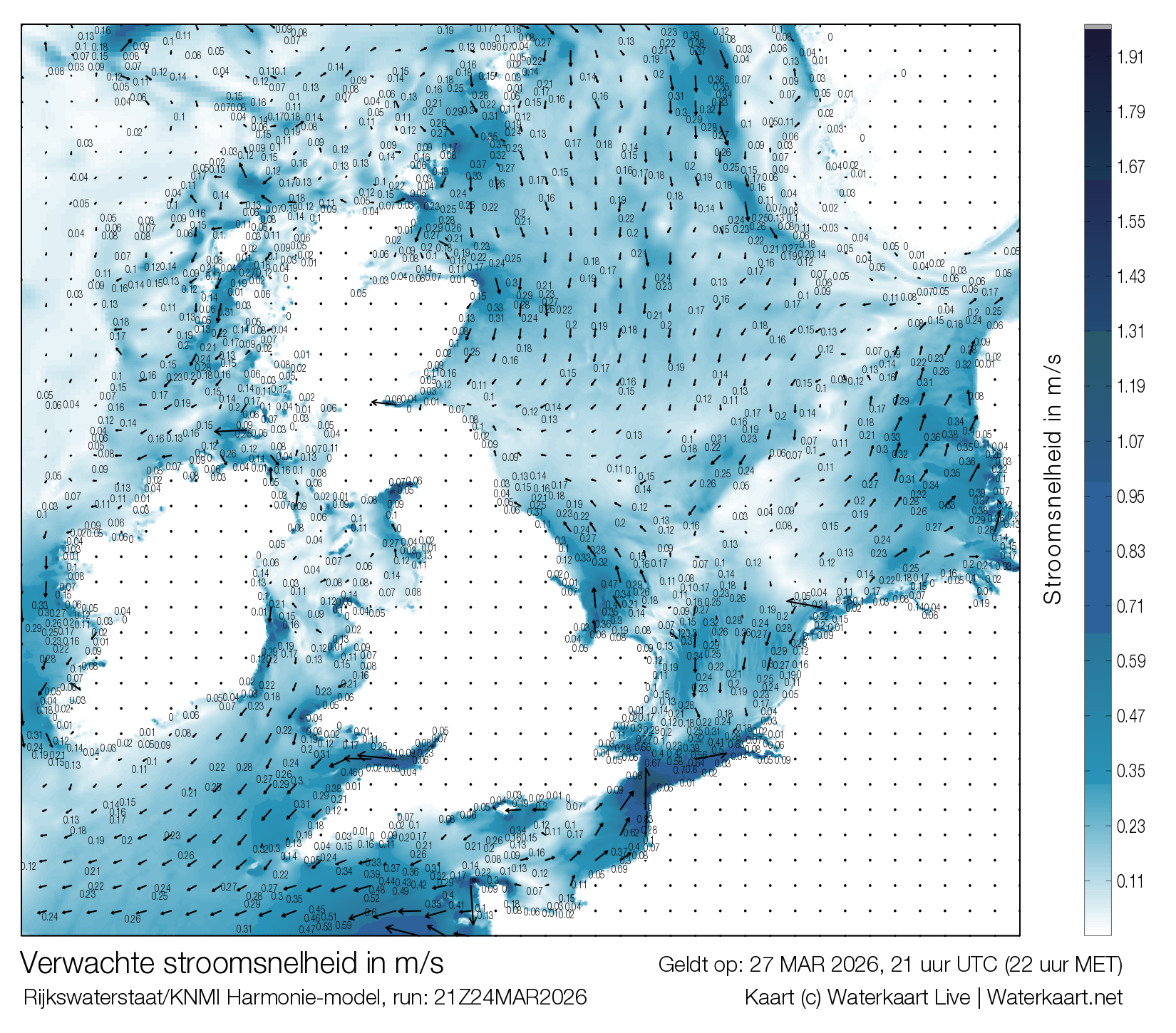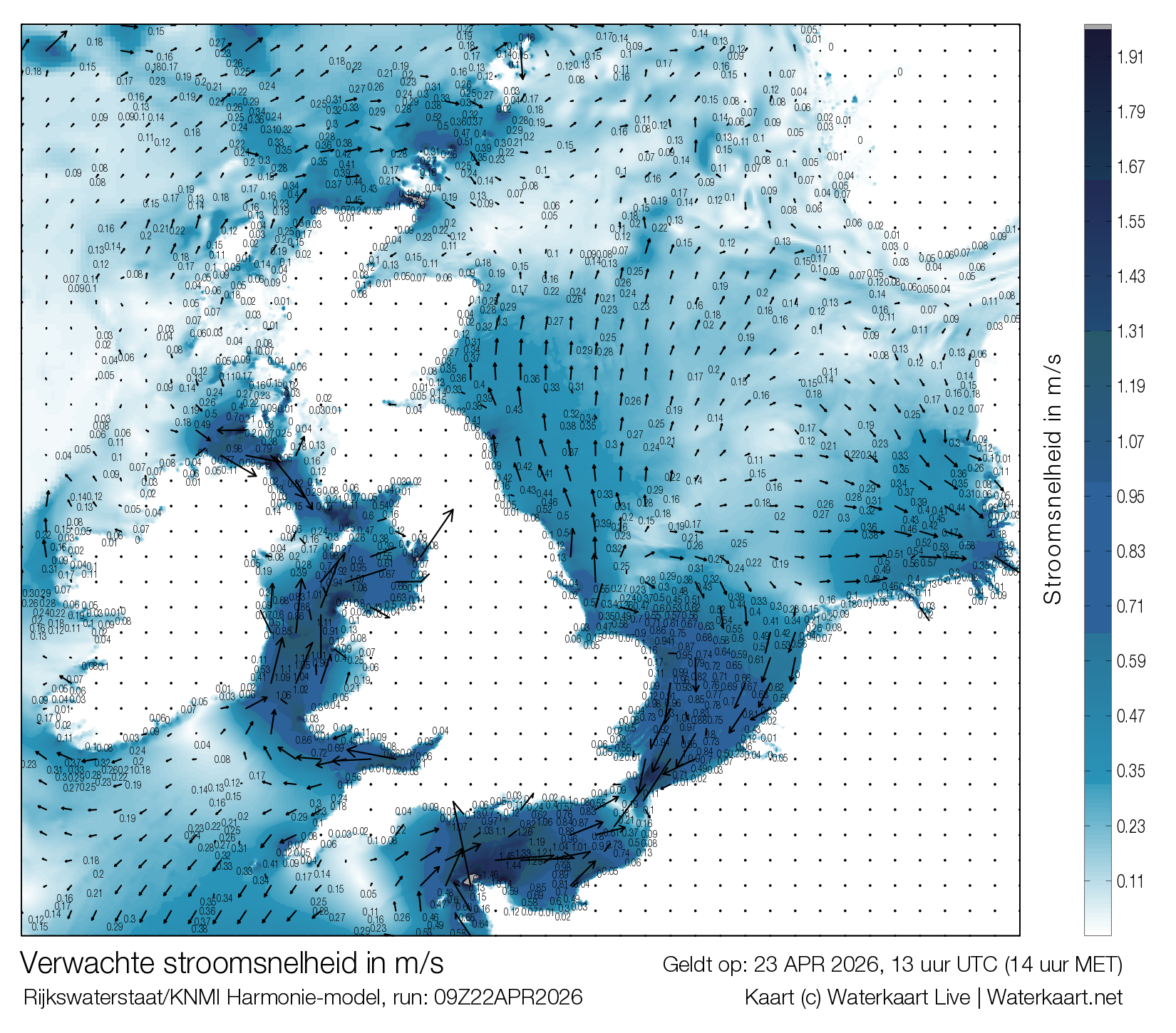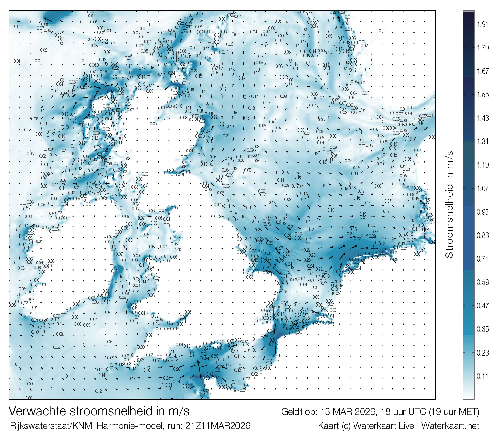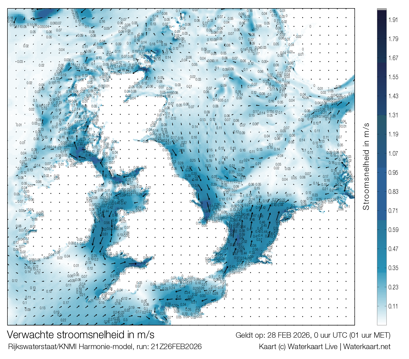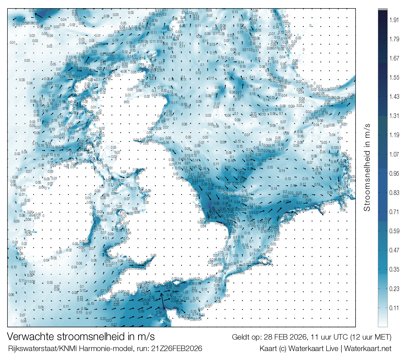 Stroomsnelheden in de Noordzee op basis van de Stroomatlas, verrekend met weersinvloeden. Deze worden iedere dag ververst met data uit het zeestromingen model van Rijkswaterstaat op basis van Harmonie weerdata, voor ieder uur een kaart, tot 48 uur in de toekomst. Lees hieronder meer over dit model