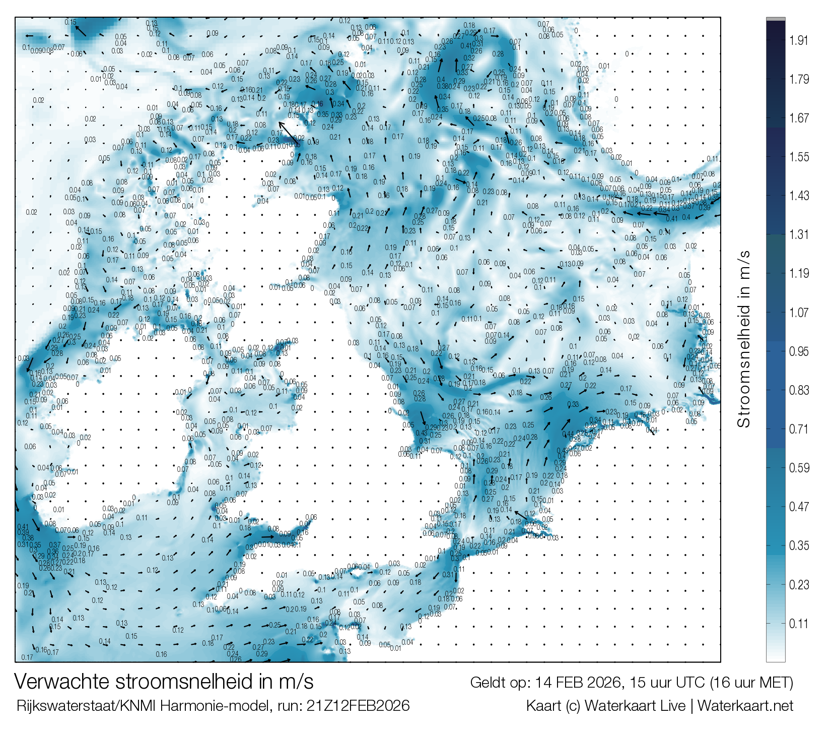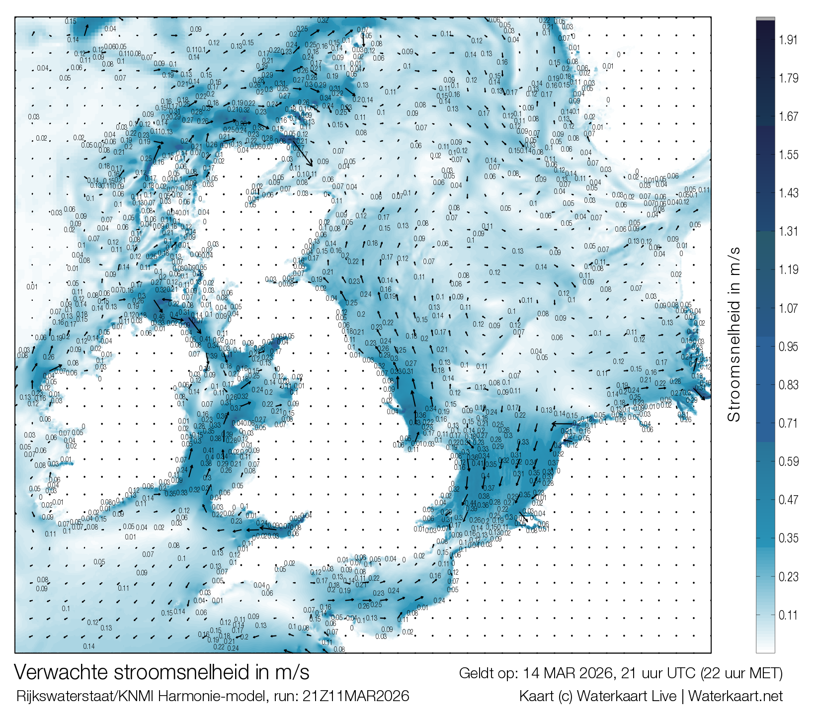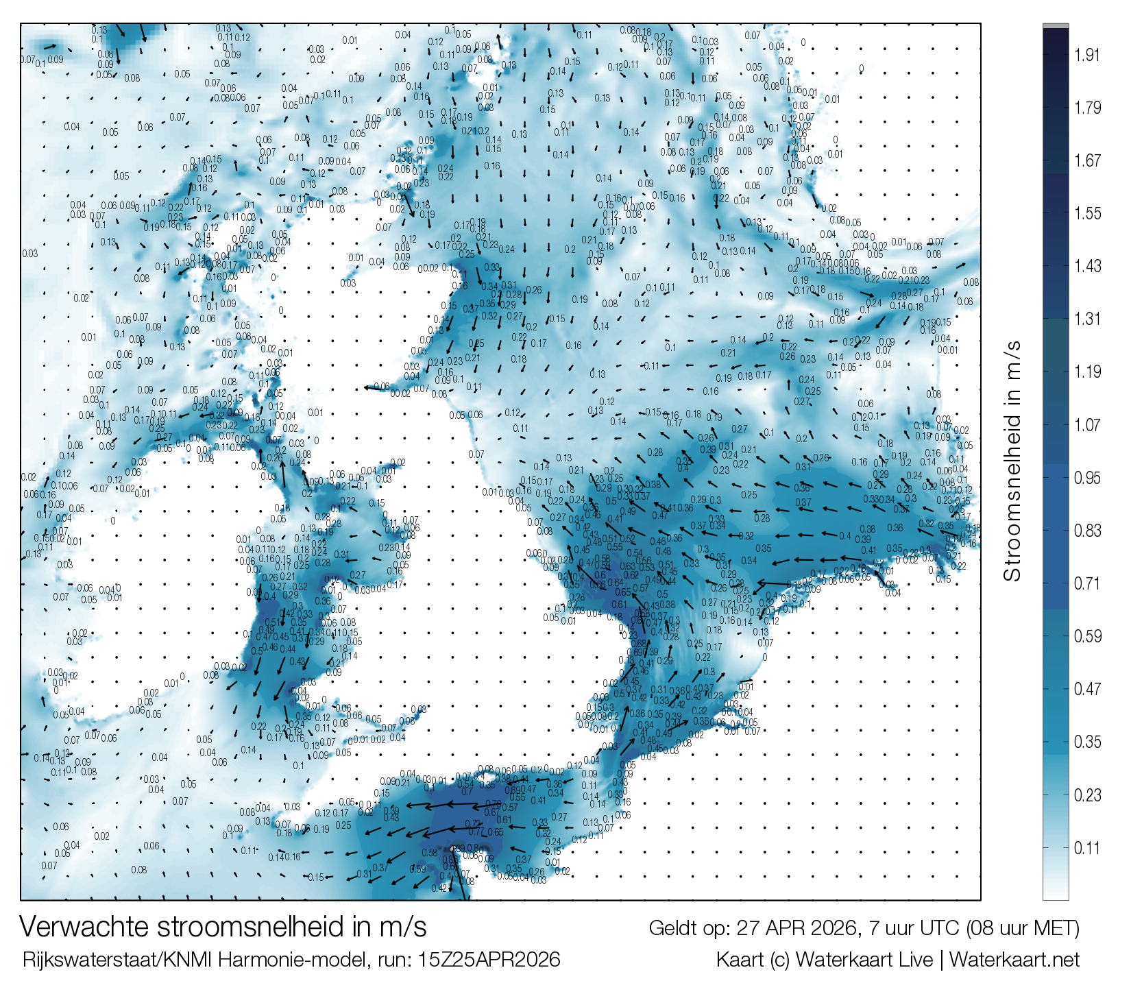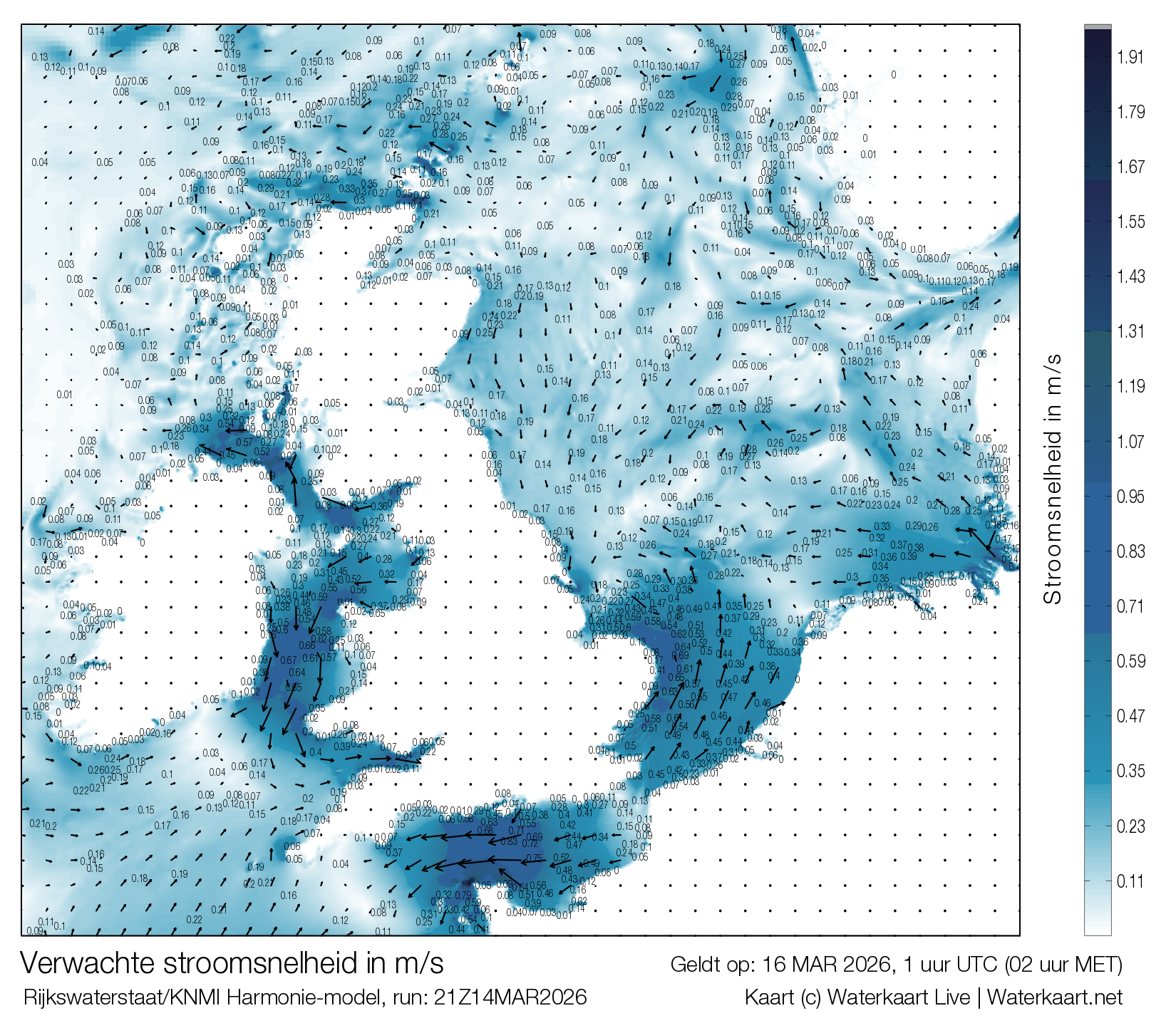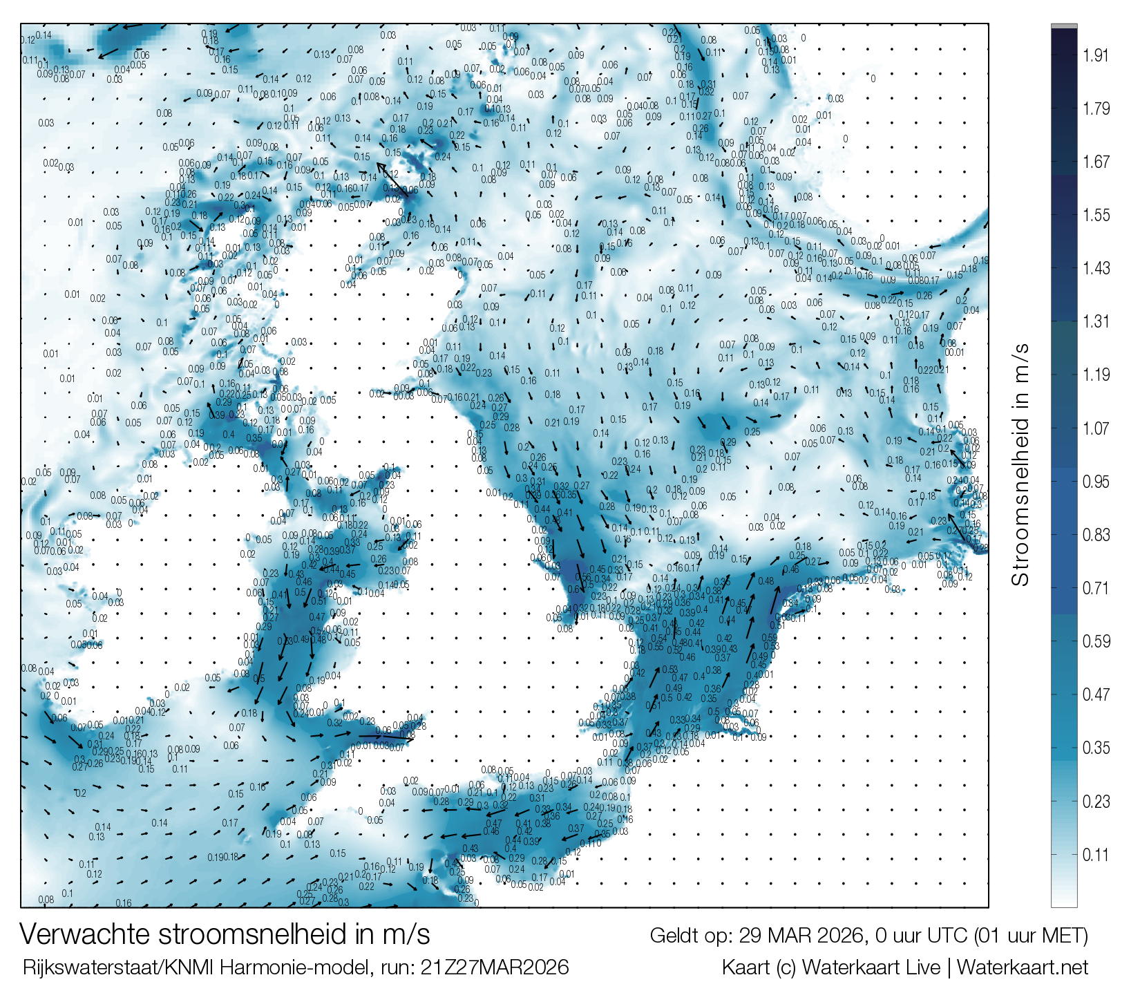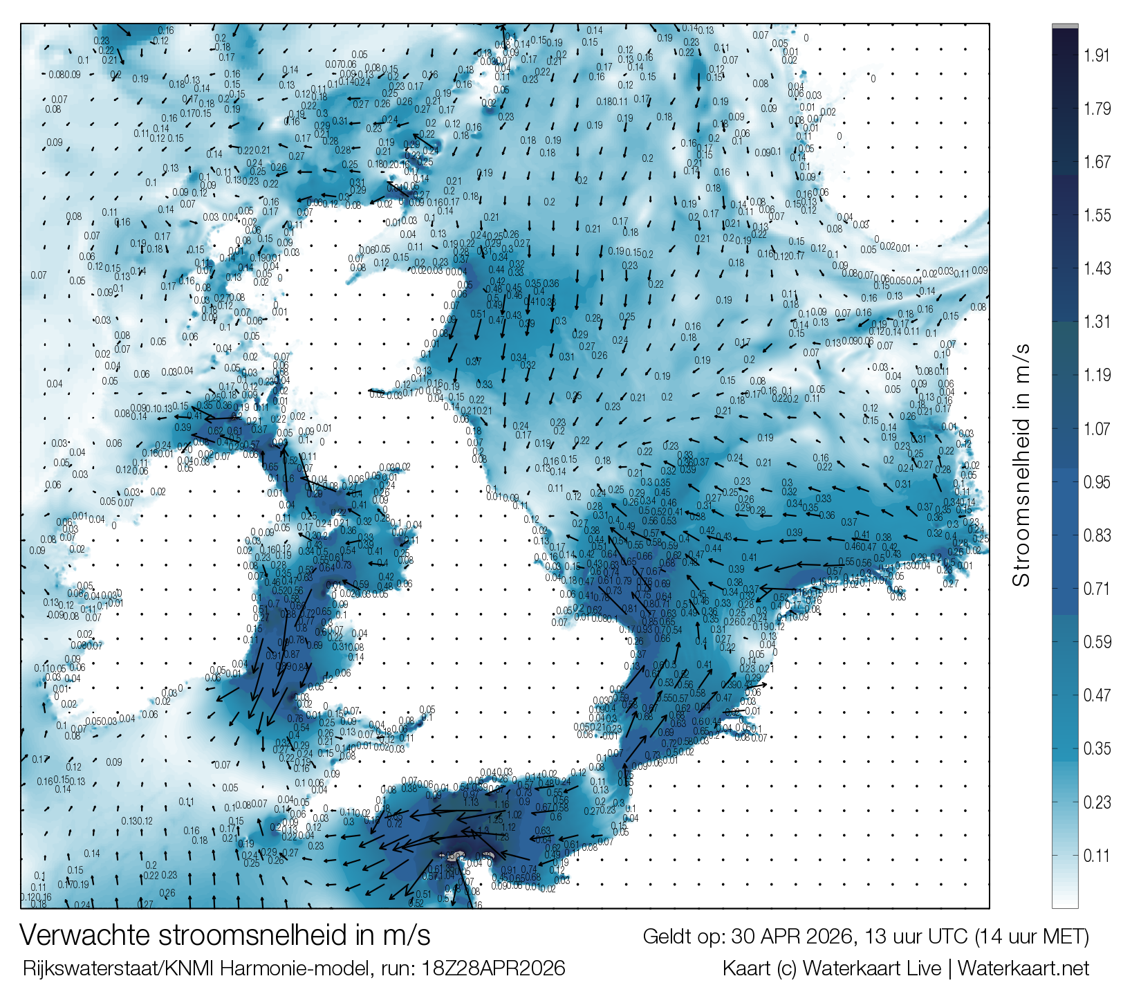 Stroomsnelheden in de Noordzee op basis van de Stroomatlas, verrekend met weersinvloeden. Deze worden iedere dag ververst met data uit het zeestromingen model van Rijkswaterstaat op basis van Harmonie weerdata, voor ieder uur een kaart, tot 48 uur in de toekomst. Lees hieronder meer over dit model
