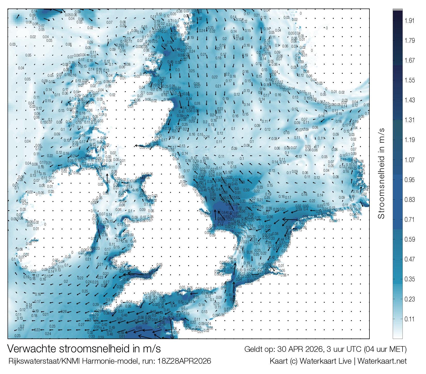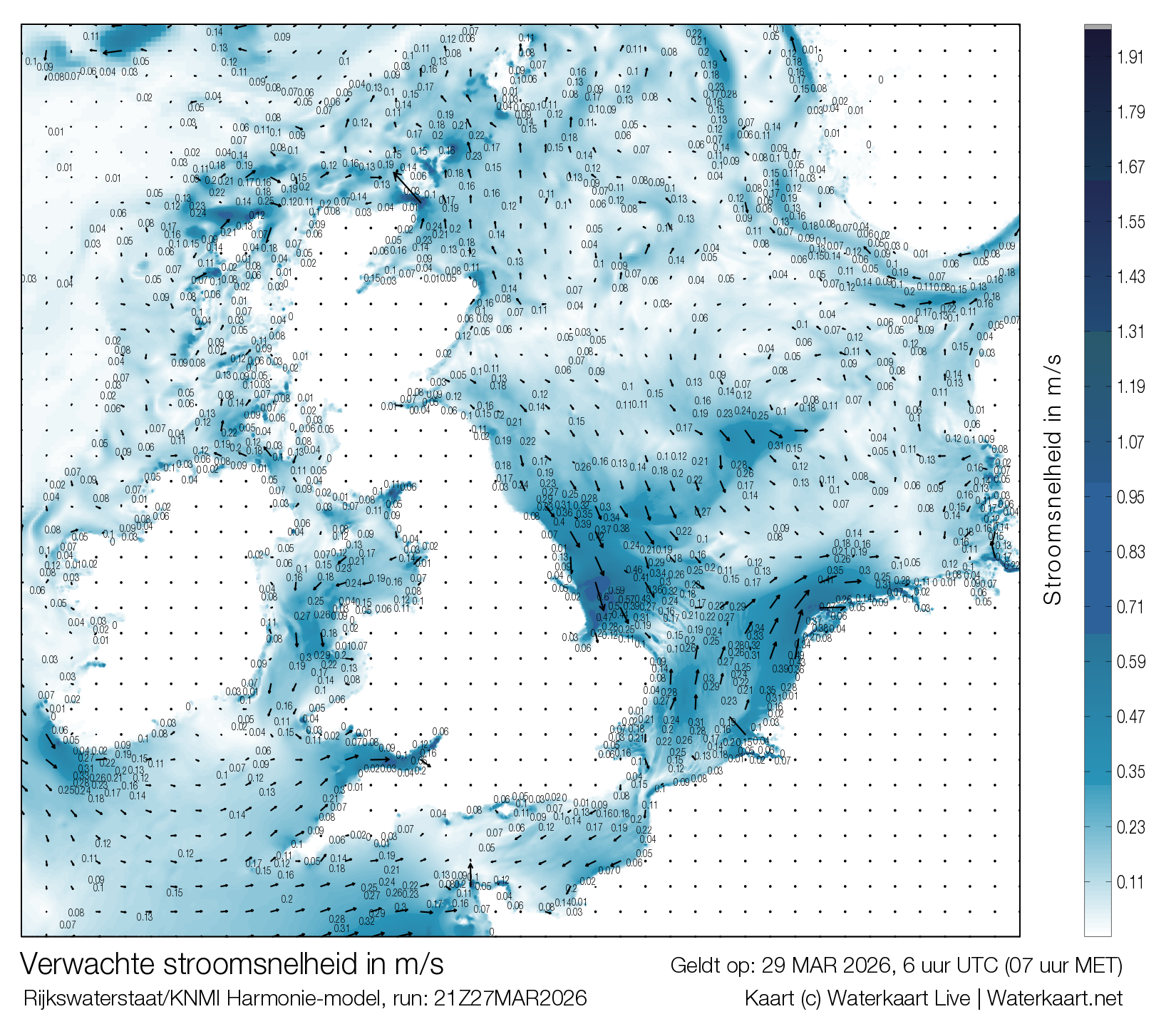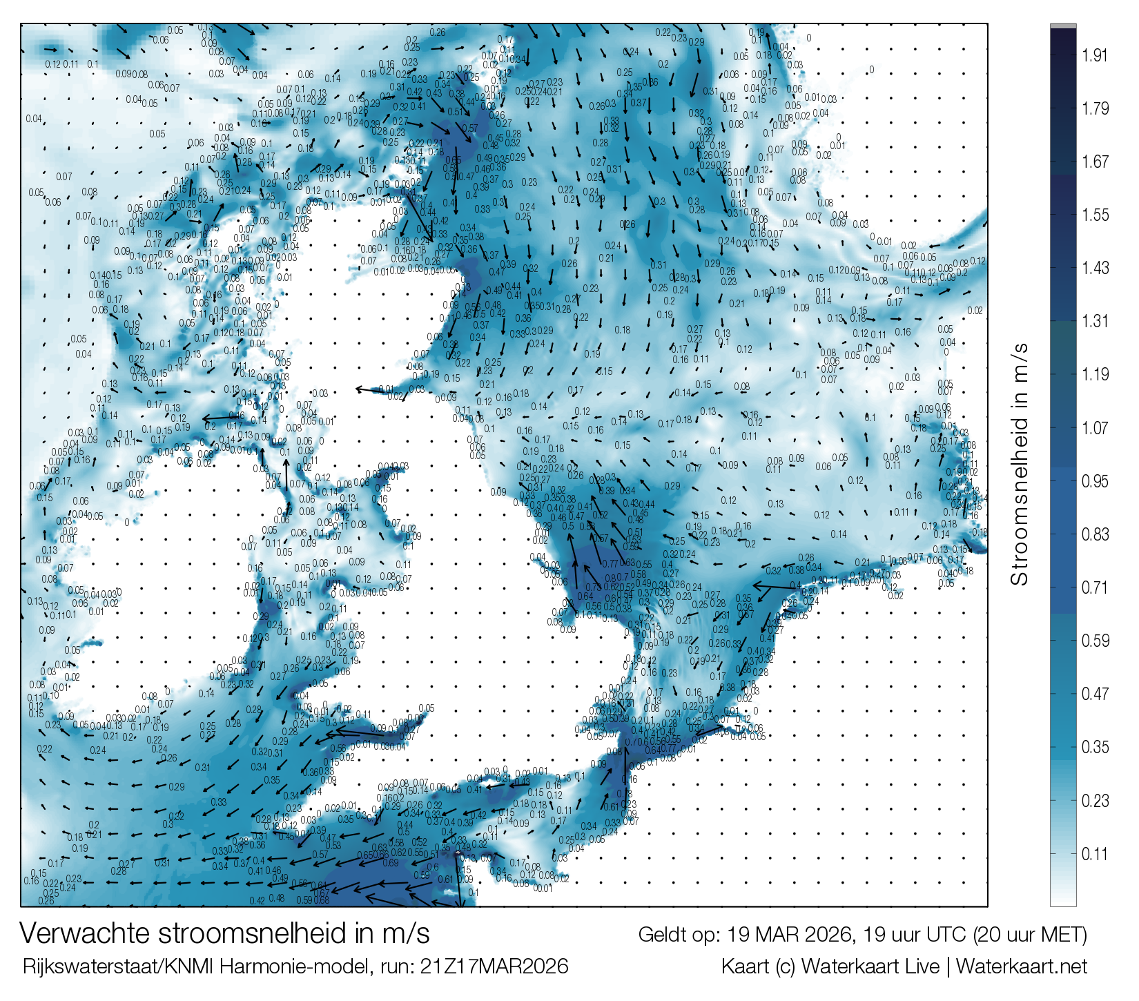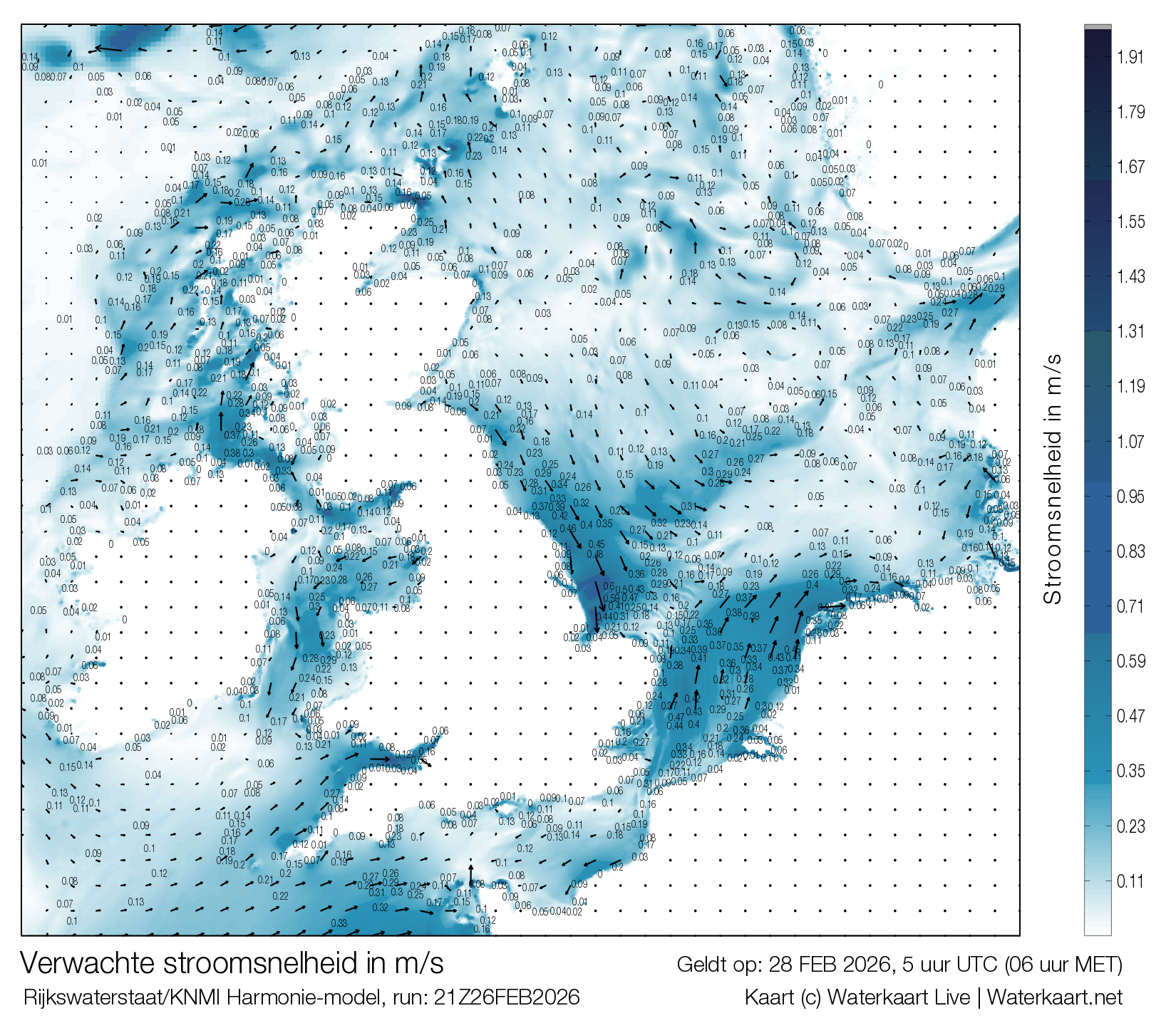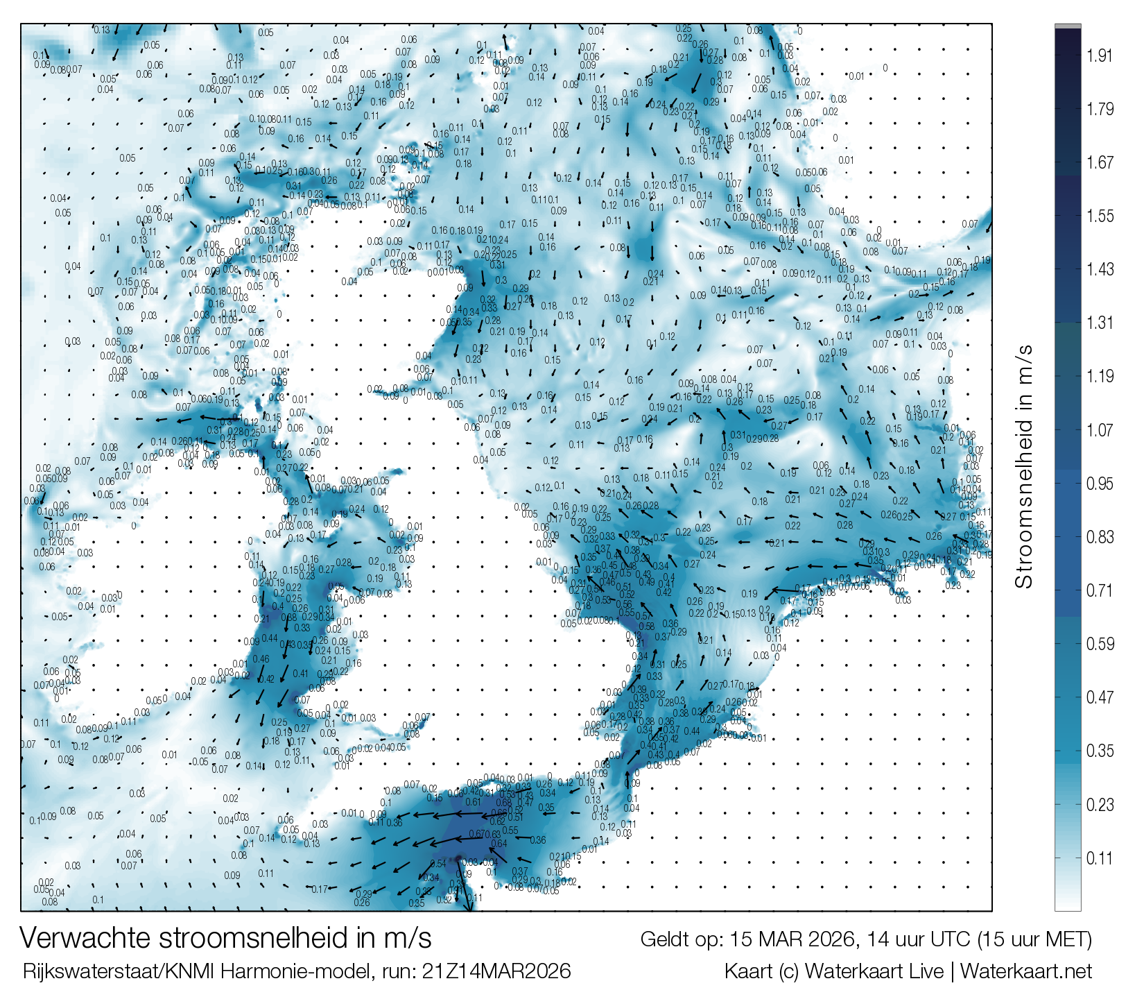 Stroomsnelheden in de Noordzee op basis van de Stroomatlas, verrekend met weersinvloeden. Deze worden iedere dag ververst met data uit het zeestromingen model van Rijkswaterstaat op basis van Harmonie weerdata, voor ieder uur een kaart, tot 48 uur in de toekomst. Lees hieronder meer over dit model