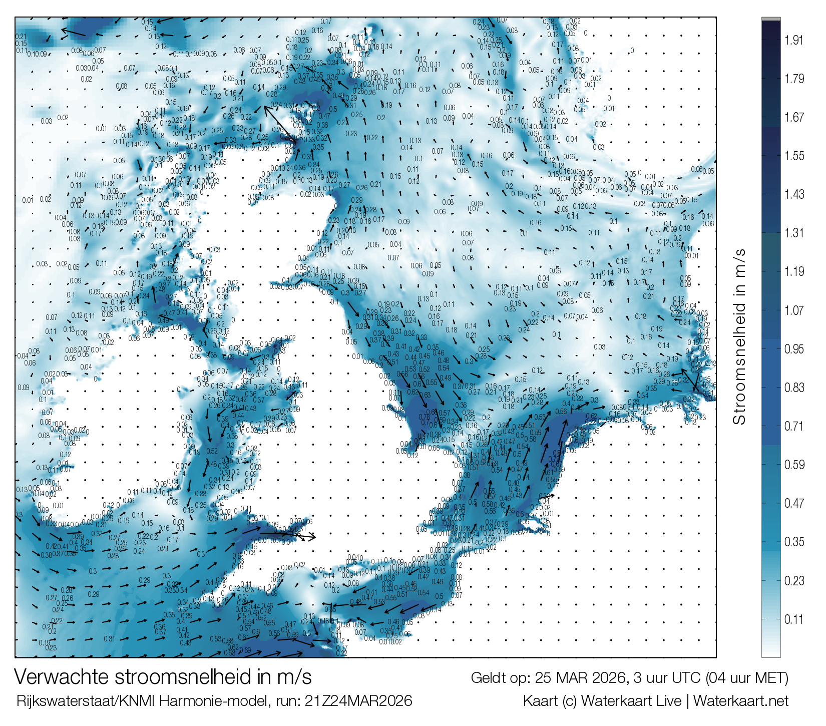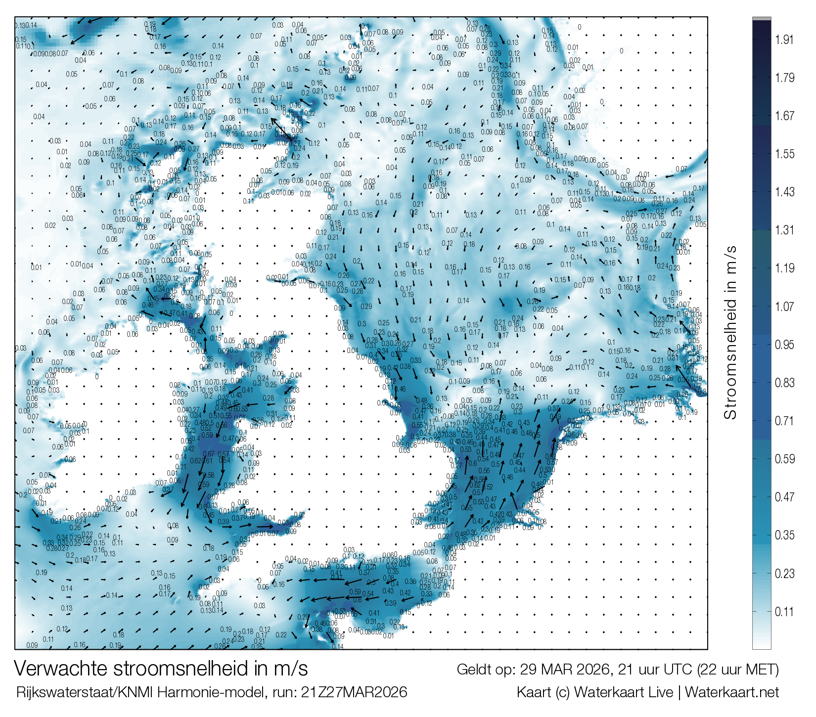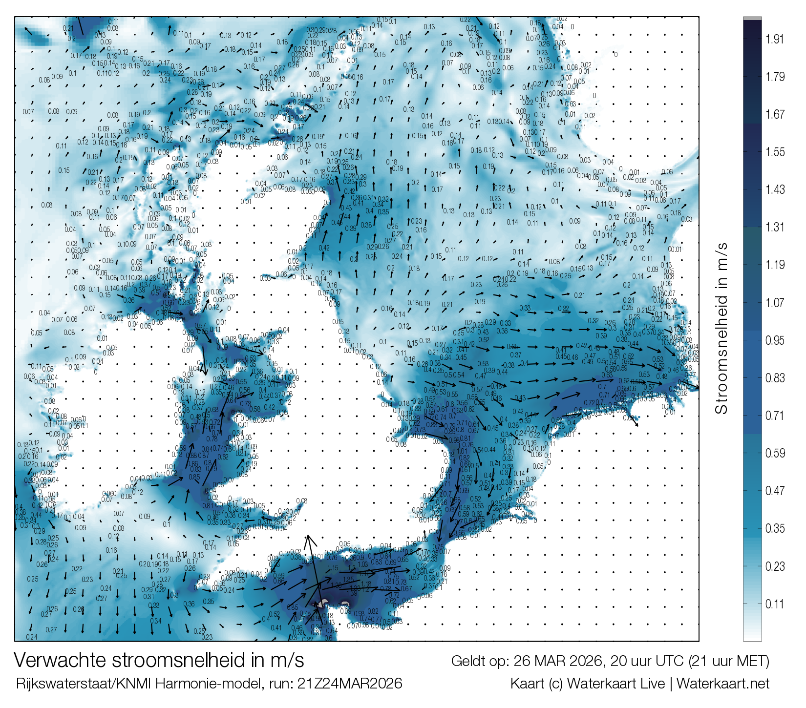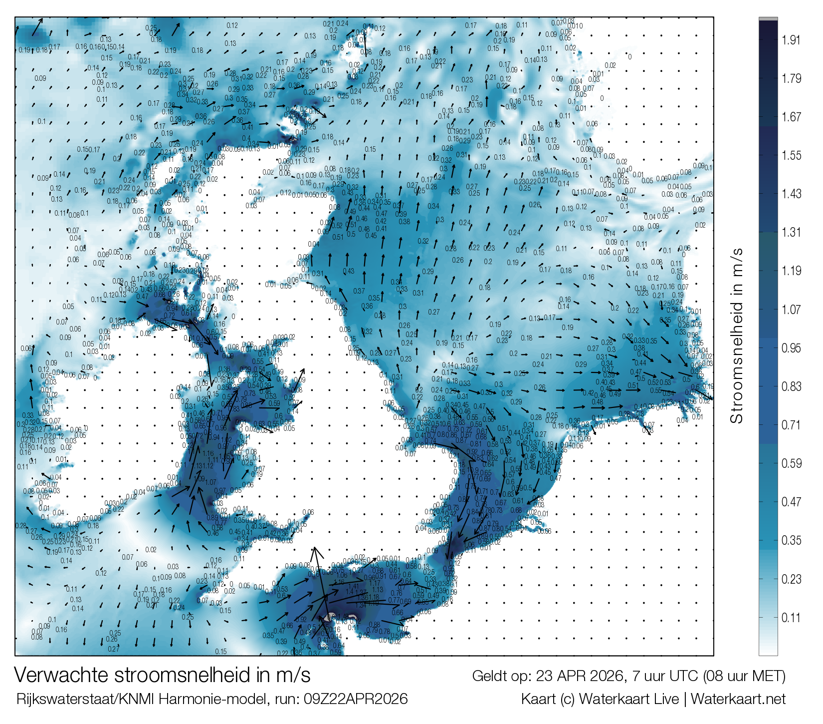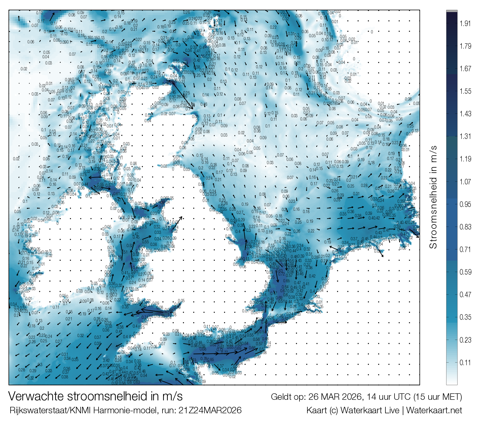 Stroomsnelheden in de Noordzee op basis van de Stroomatlas, verrekend met weersinvloeden. Deze worden iedere dag ververst met data uit het zeestromingen model van Rijkswaterstaat op basis van Harmonie weerdata, voor ieder uur een kaart, tot 48 uur in de toekomst. Lees hieronder meer over dit model