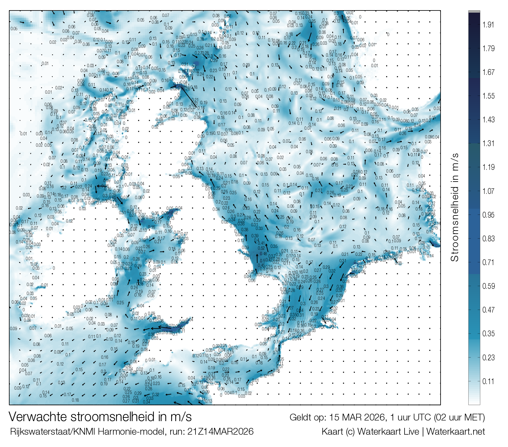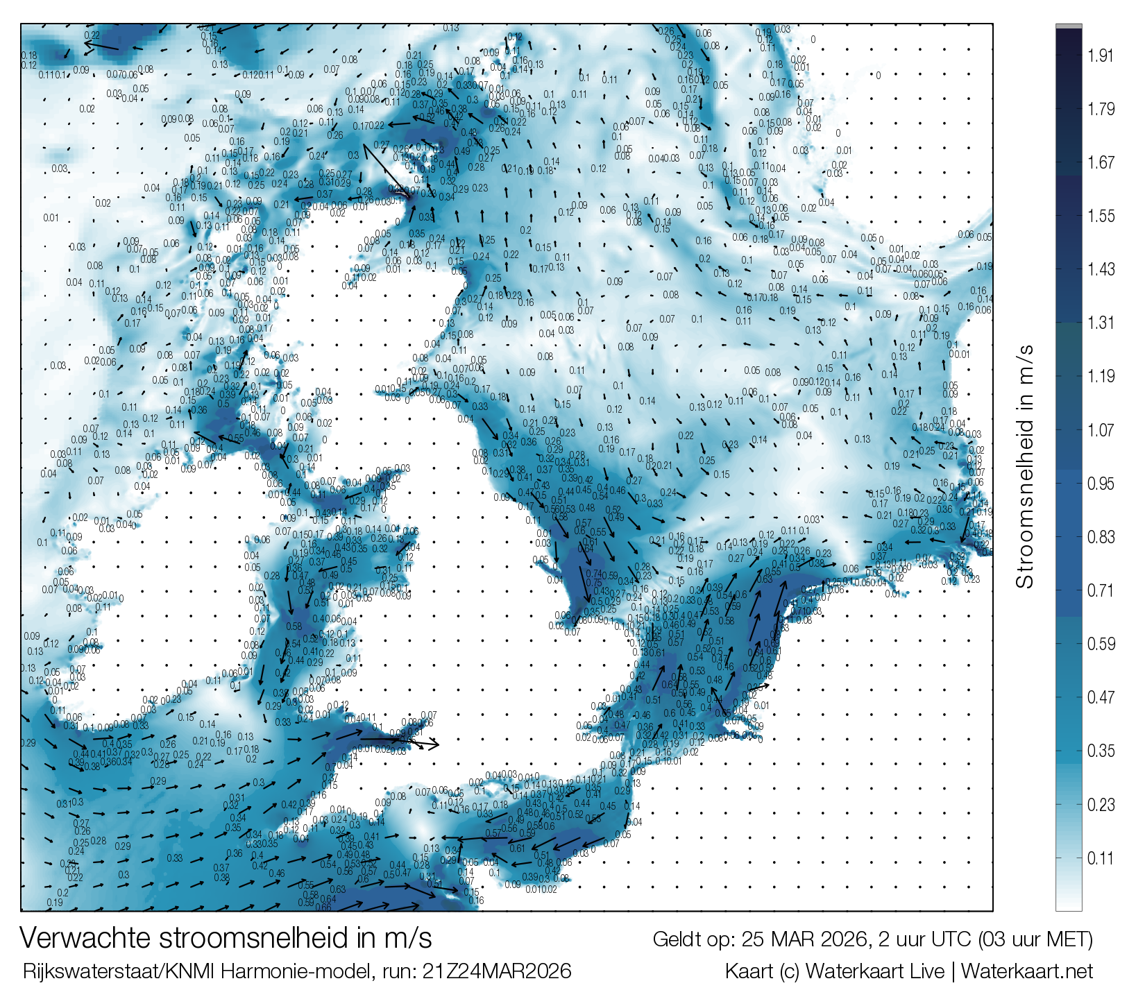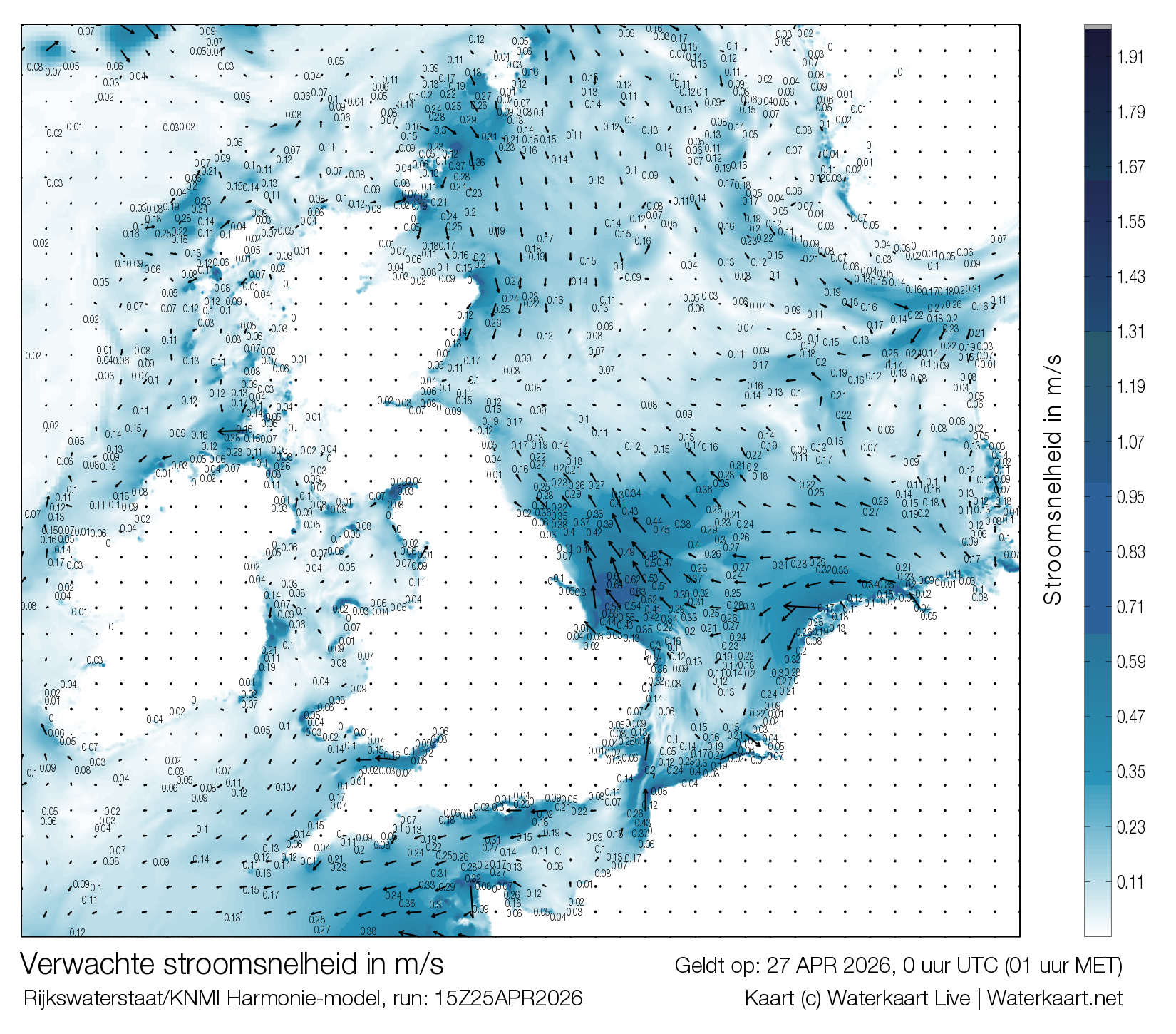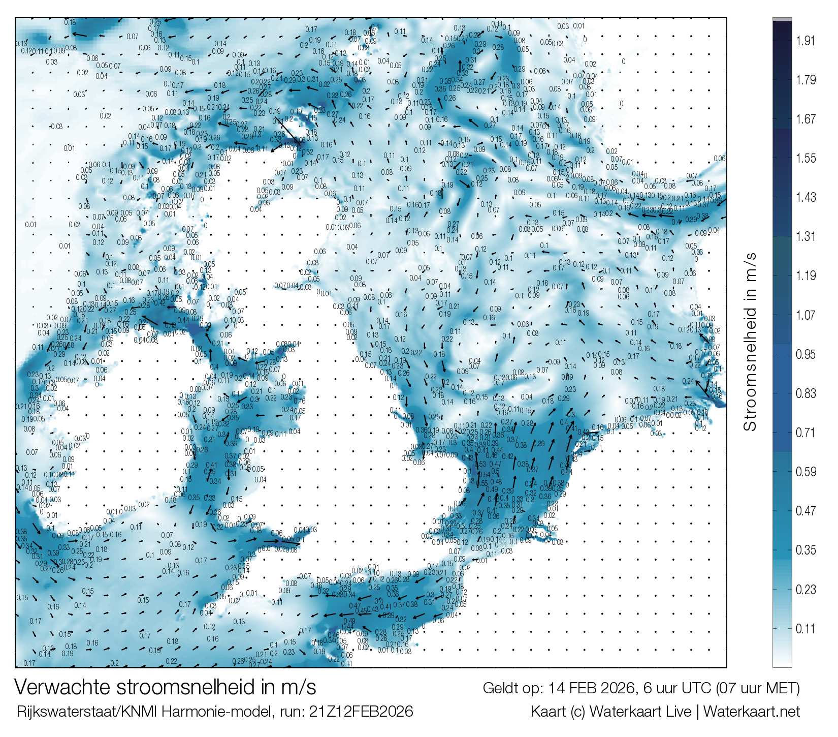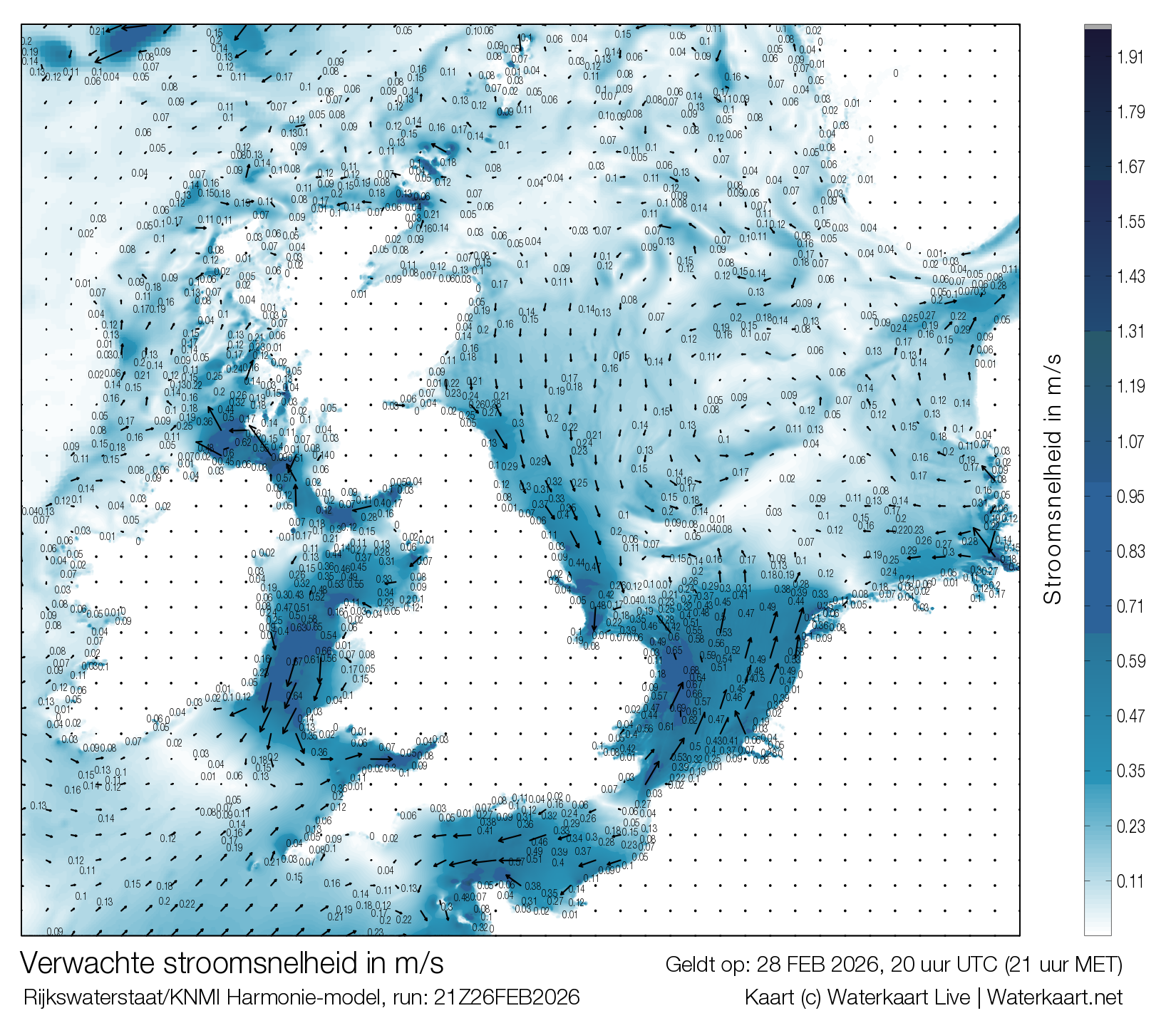 Stroomsnelheden in de Noordzee op basis van de Stroomatlas, verrekend met weersinvloeden. Deze worden iedere dag ververst met data uit het zeestromingen model van Rijkswaterstaat op basis van Harmonie weerdata, voor ieder uur een kaart, tot 48 uur in de toekomst. Lees hieronder meer over dit model