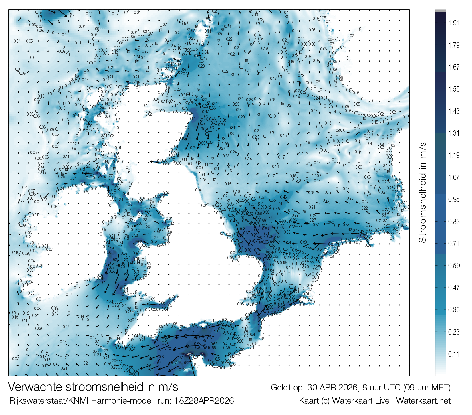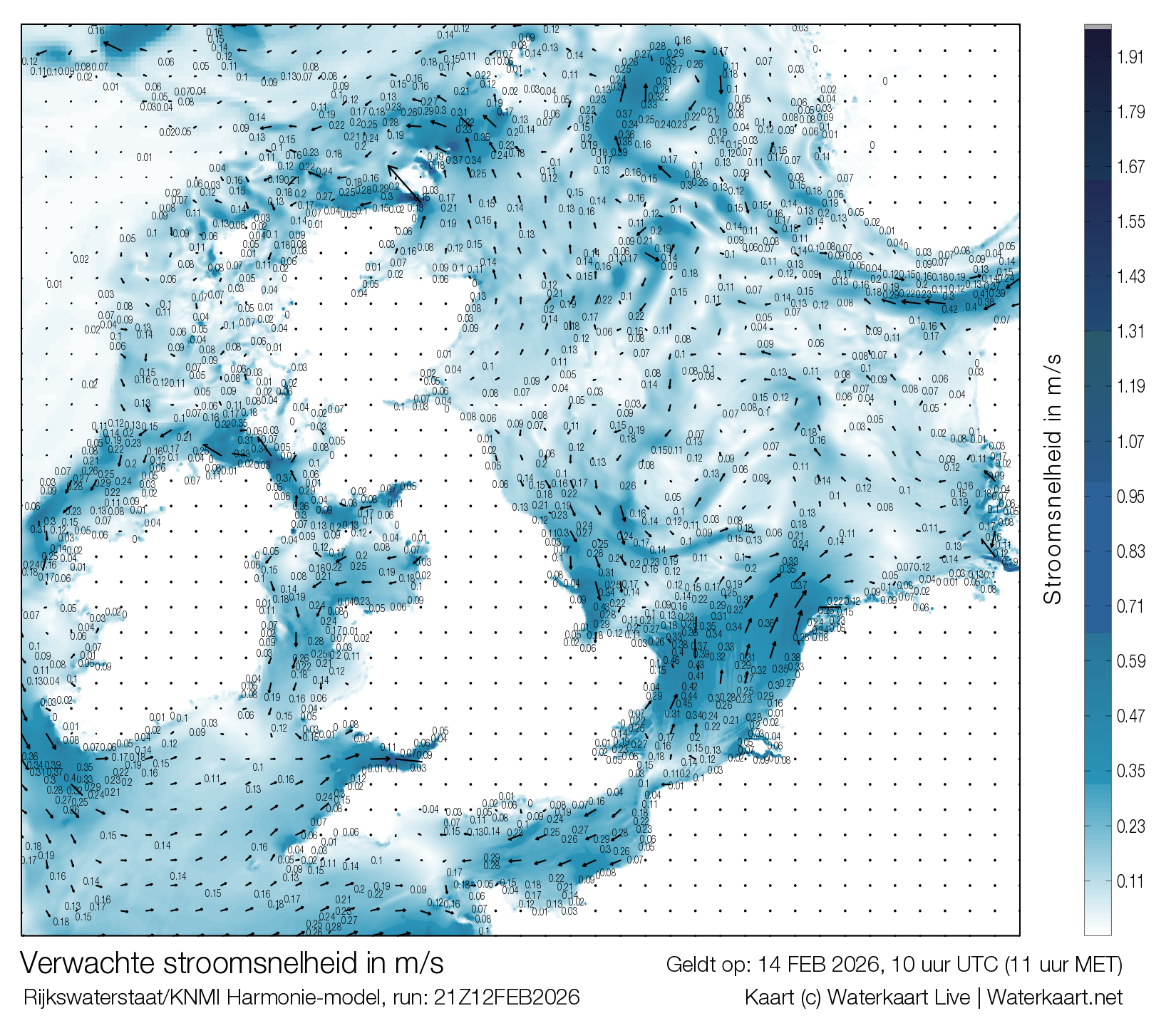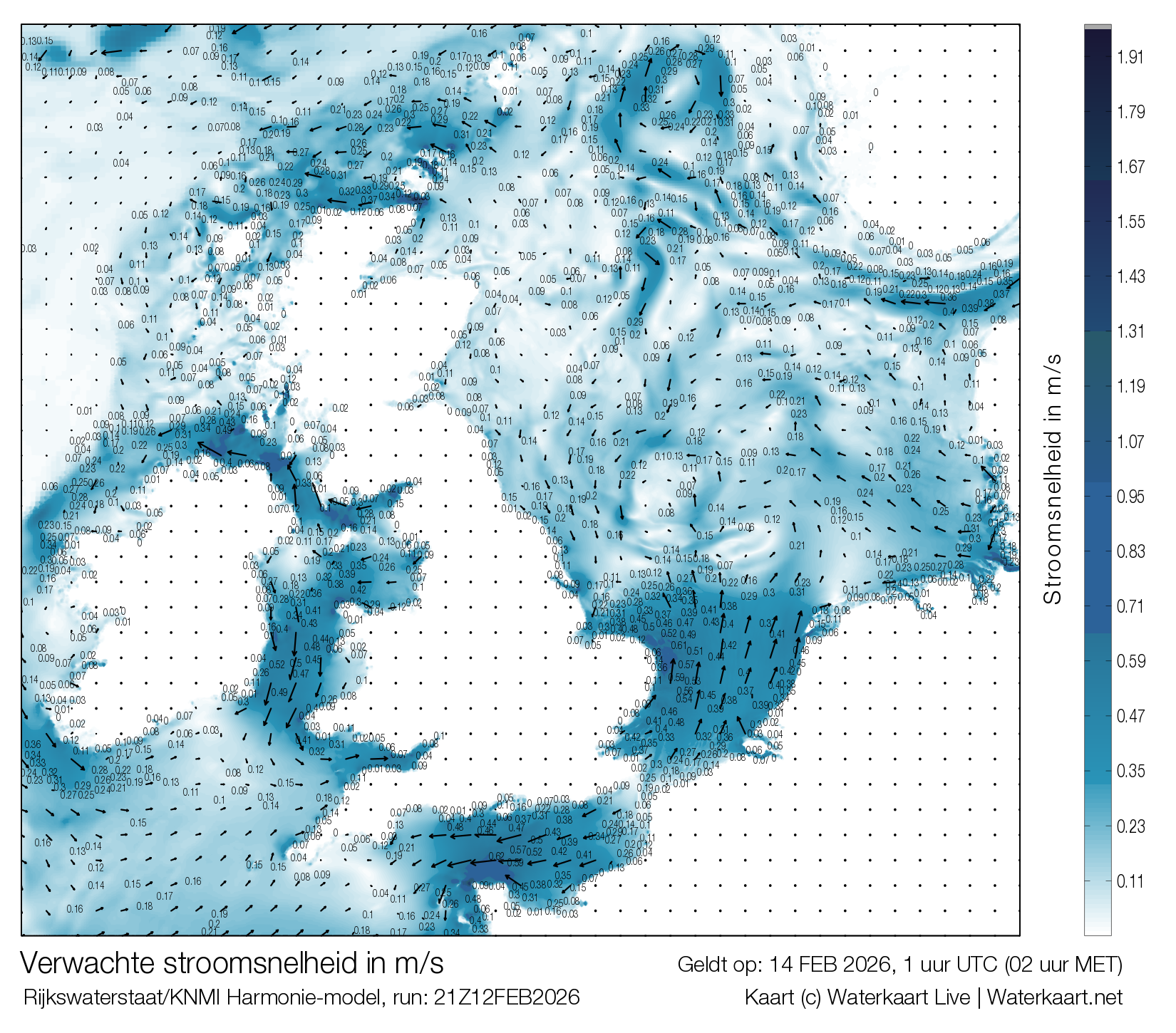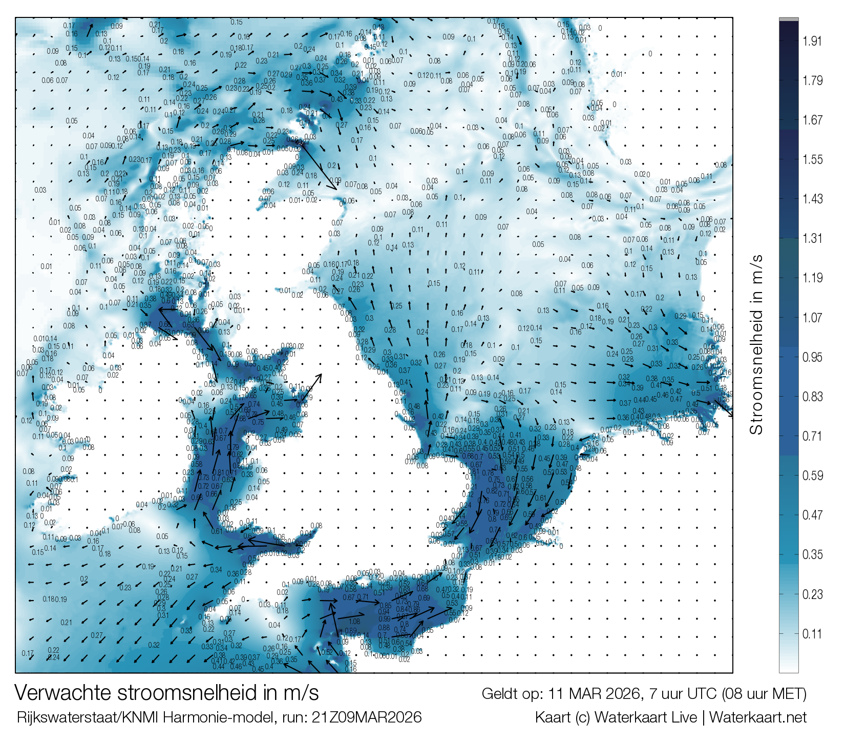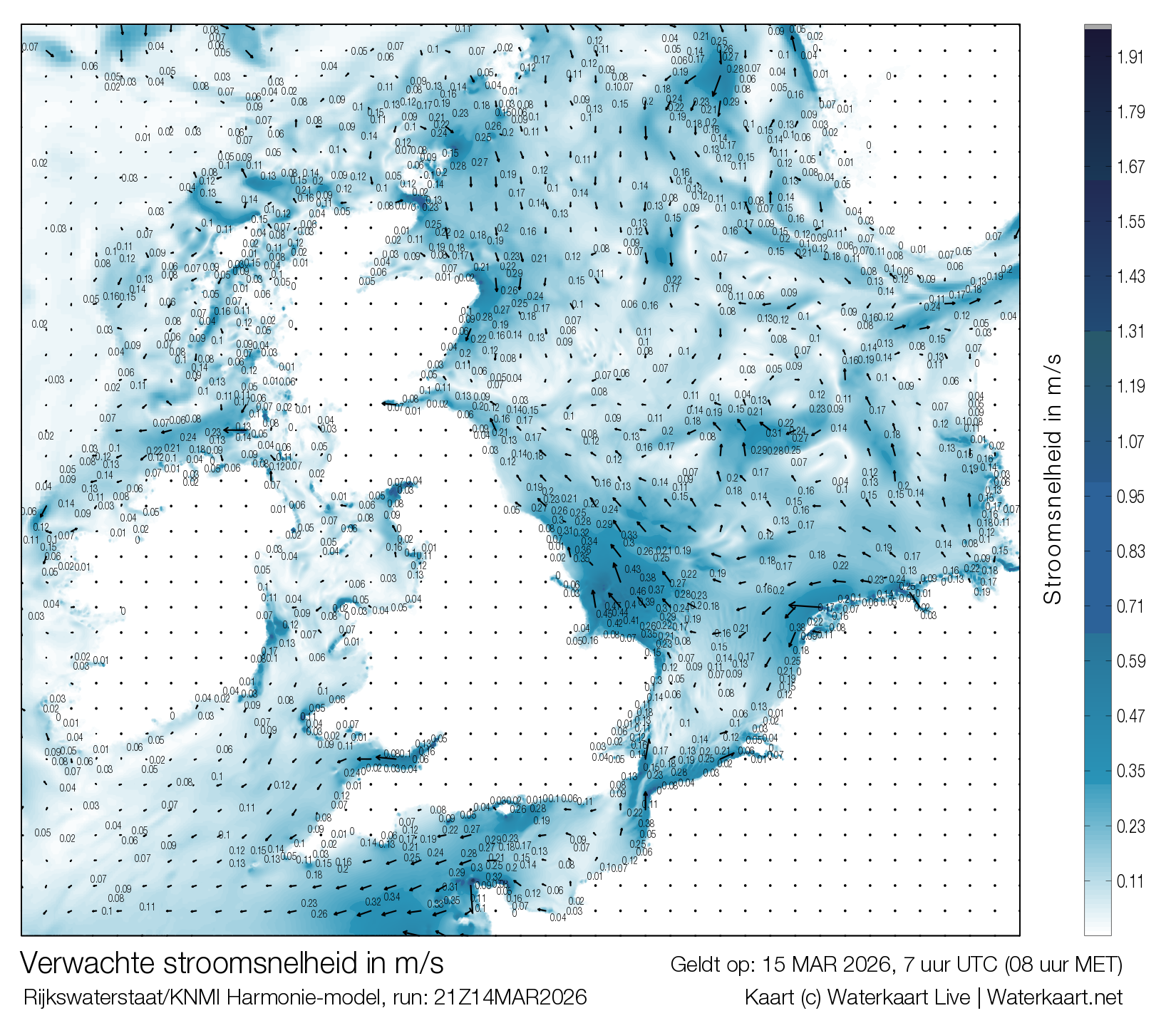Stroomsnelheden in de Noordzee op basis van de Stroomatlas, verrekend met weersinvloeden. Deze worden iedere dag ververst met data uit het zeestromingen model van Rijkswaterstaat op basis van Harmonie weerdata, voor ieder uur een kaart, tot 48 uur in de toekomst. Lees hieronder meer over dit model