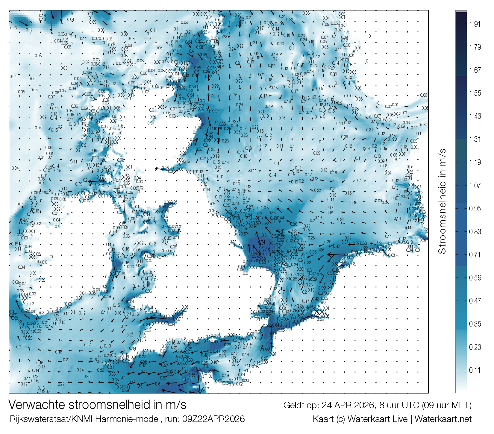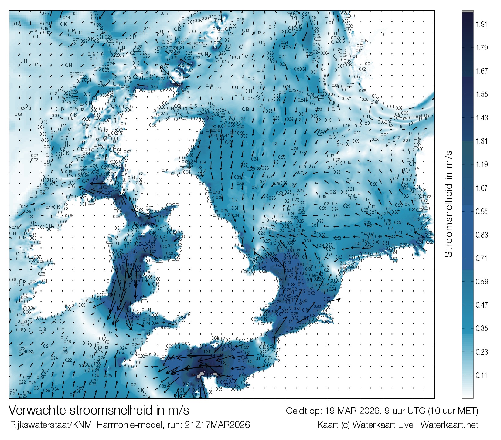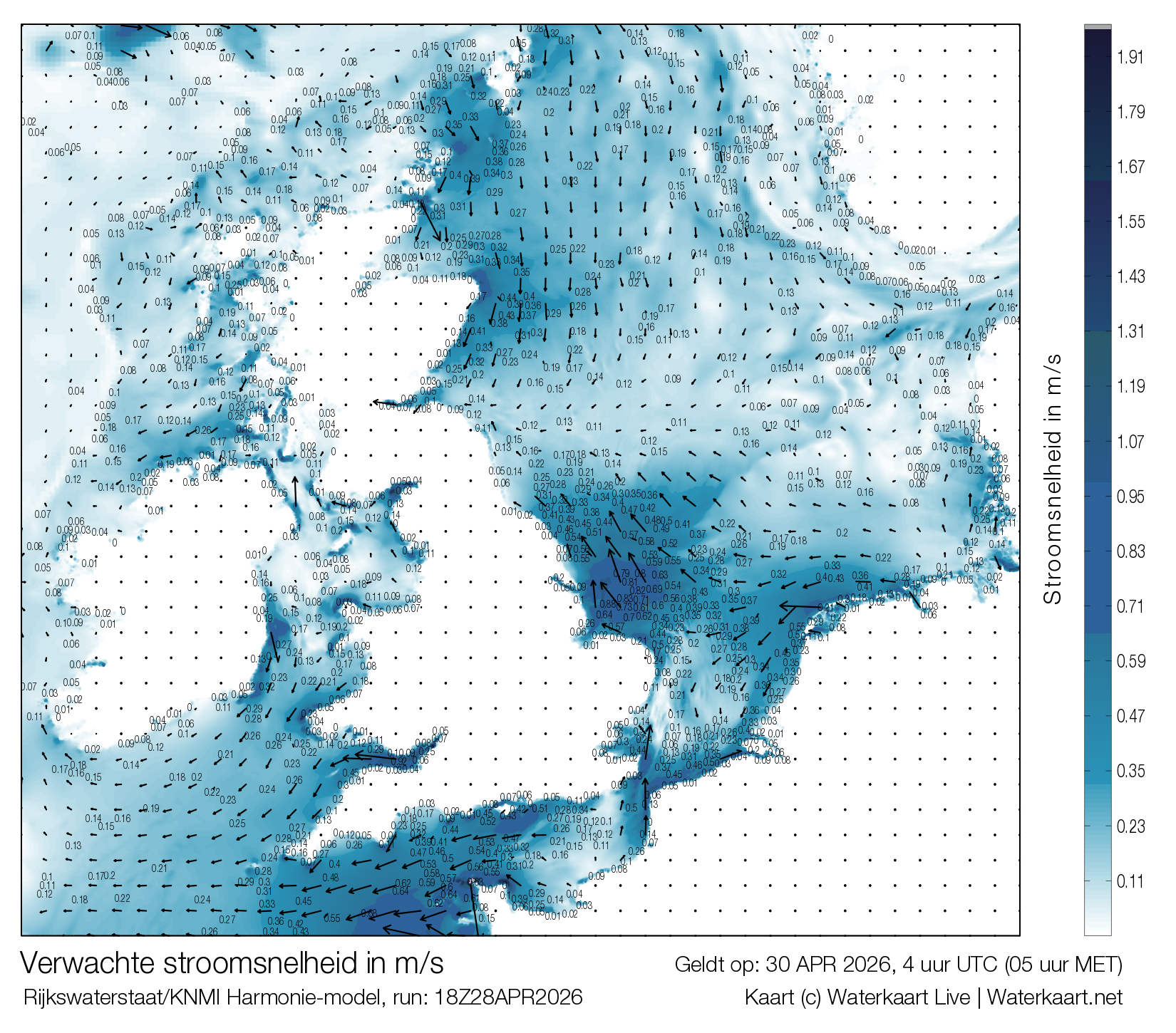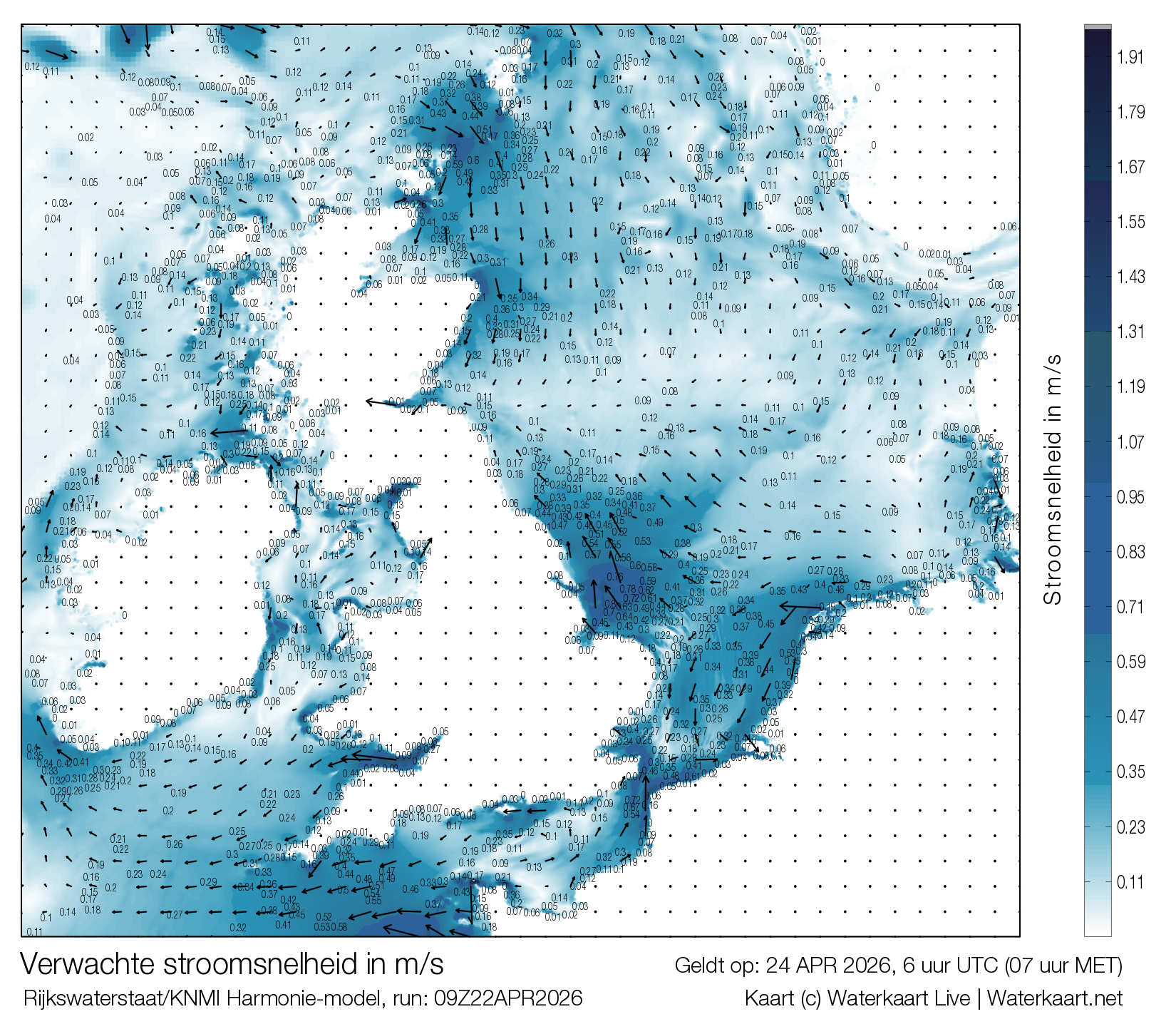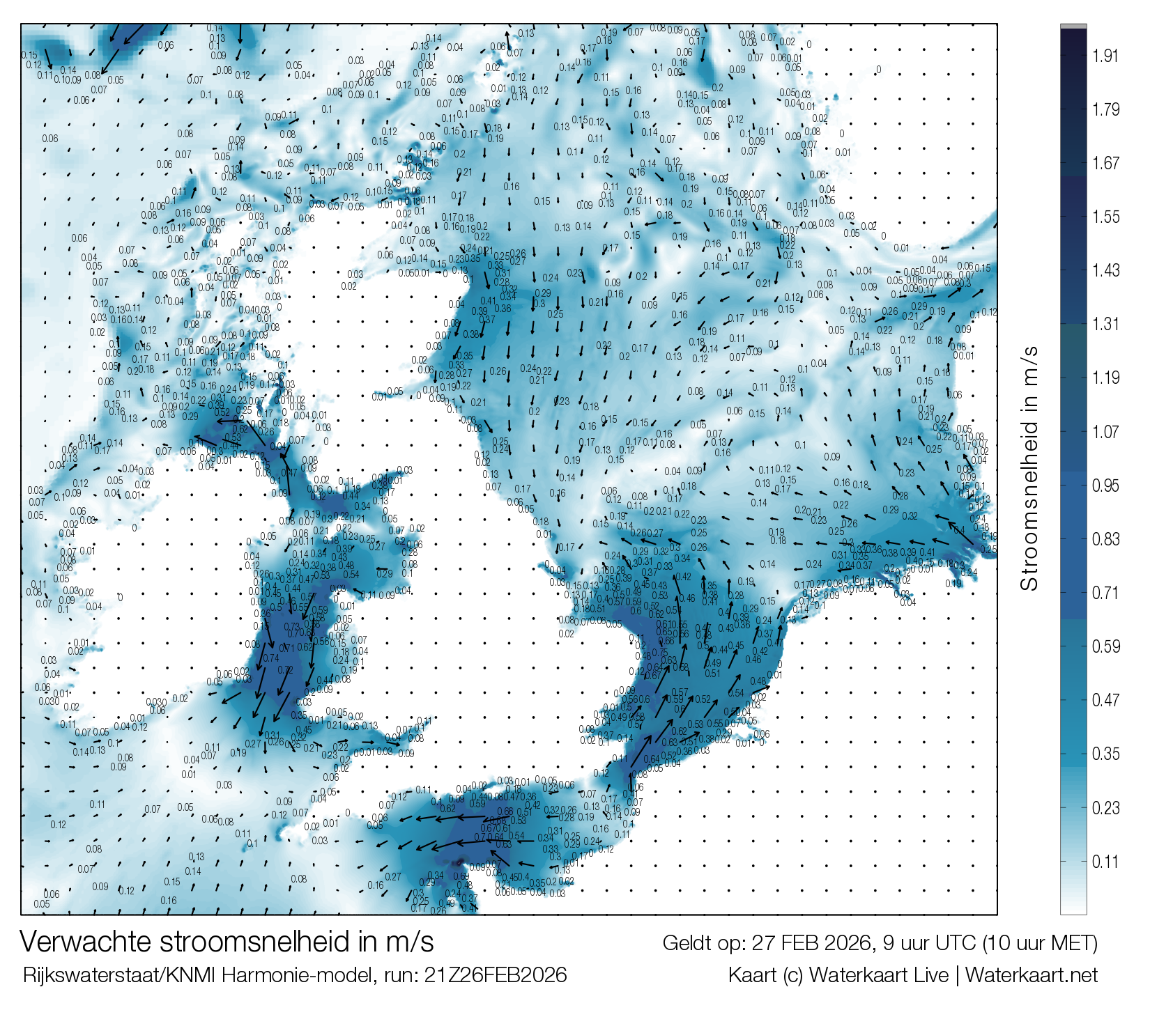 Stroomsnelheden in de Noordzee op basis van de Stroomatlas, verrekend met weersinvloeden. Deze worden iedere dag ververst met data uit het zeestromingen model van Rijkswaterstaat op basis van Harmonie weerdata, voor ieder uur een kaart, tot 48 uur in de toekomst. Lees hieronder meer over dit model
