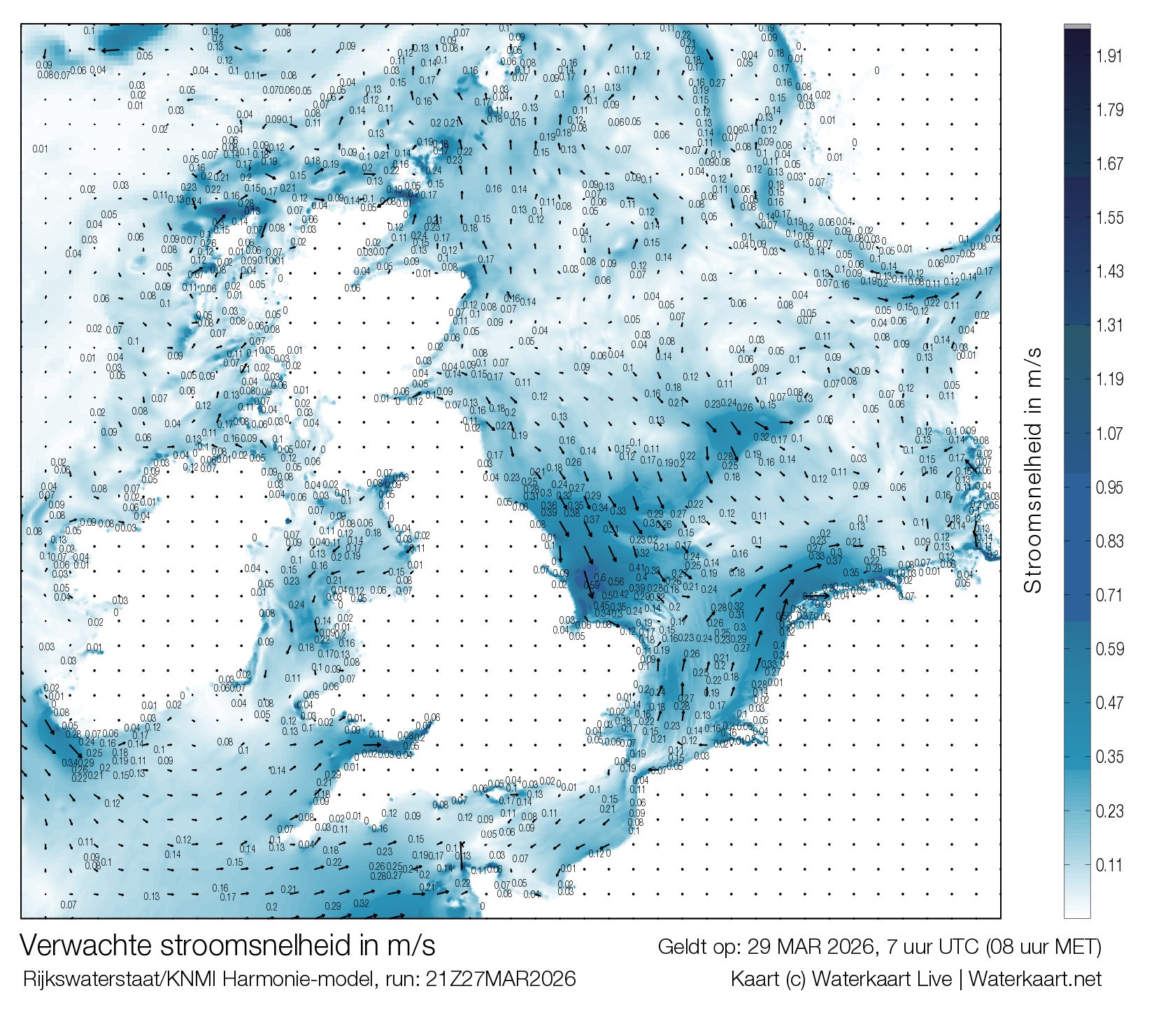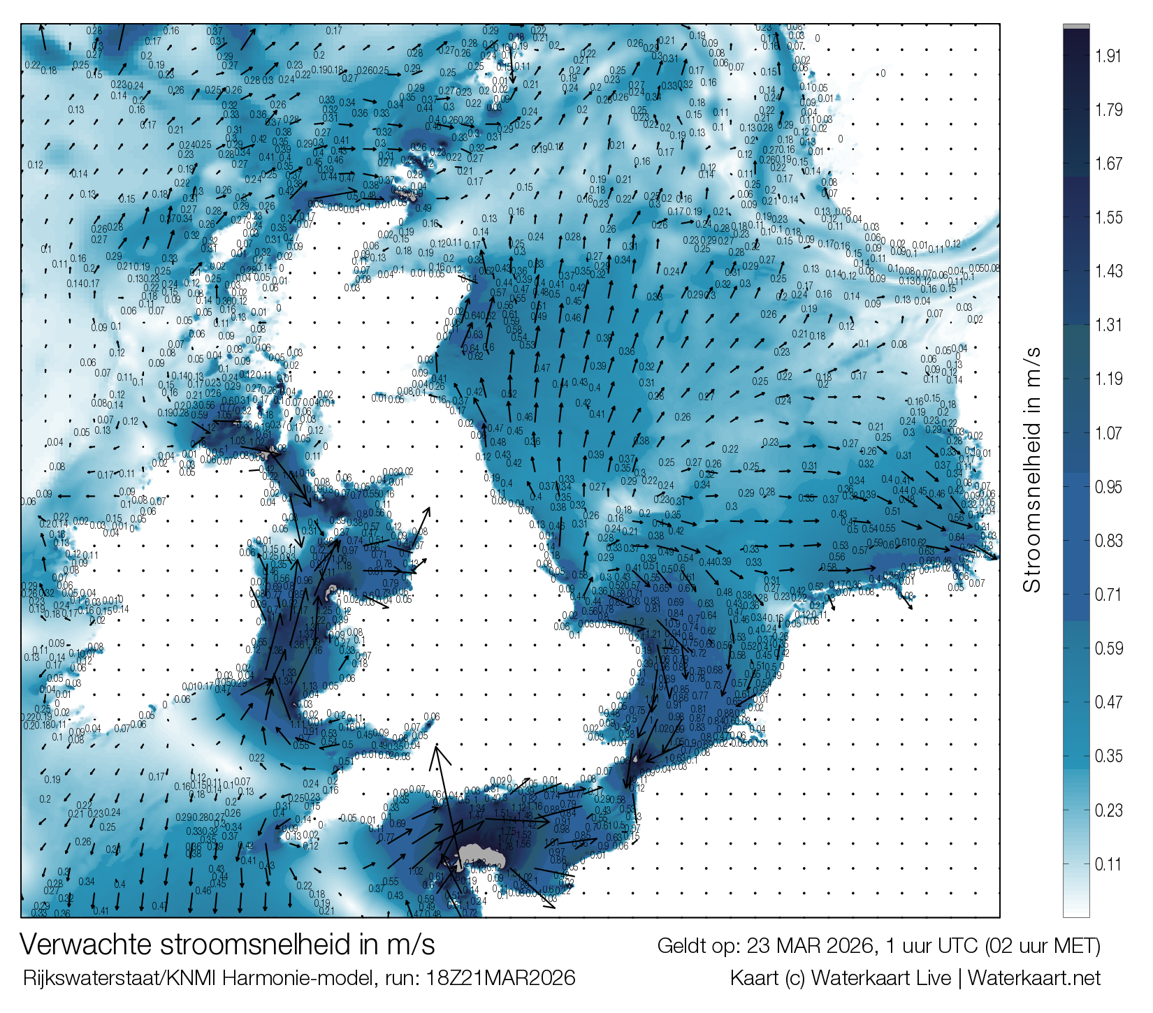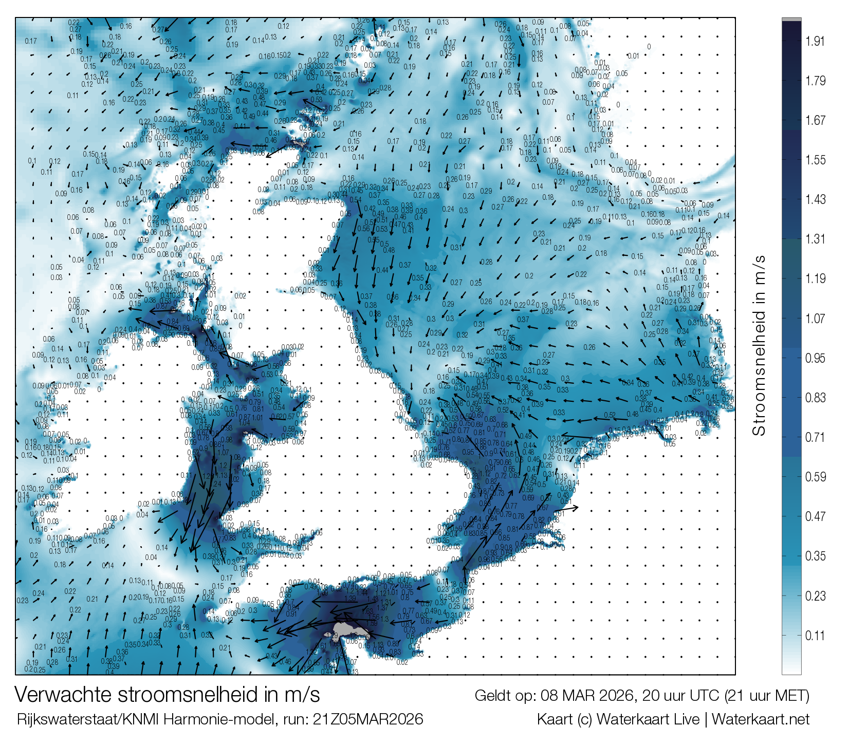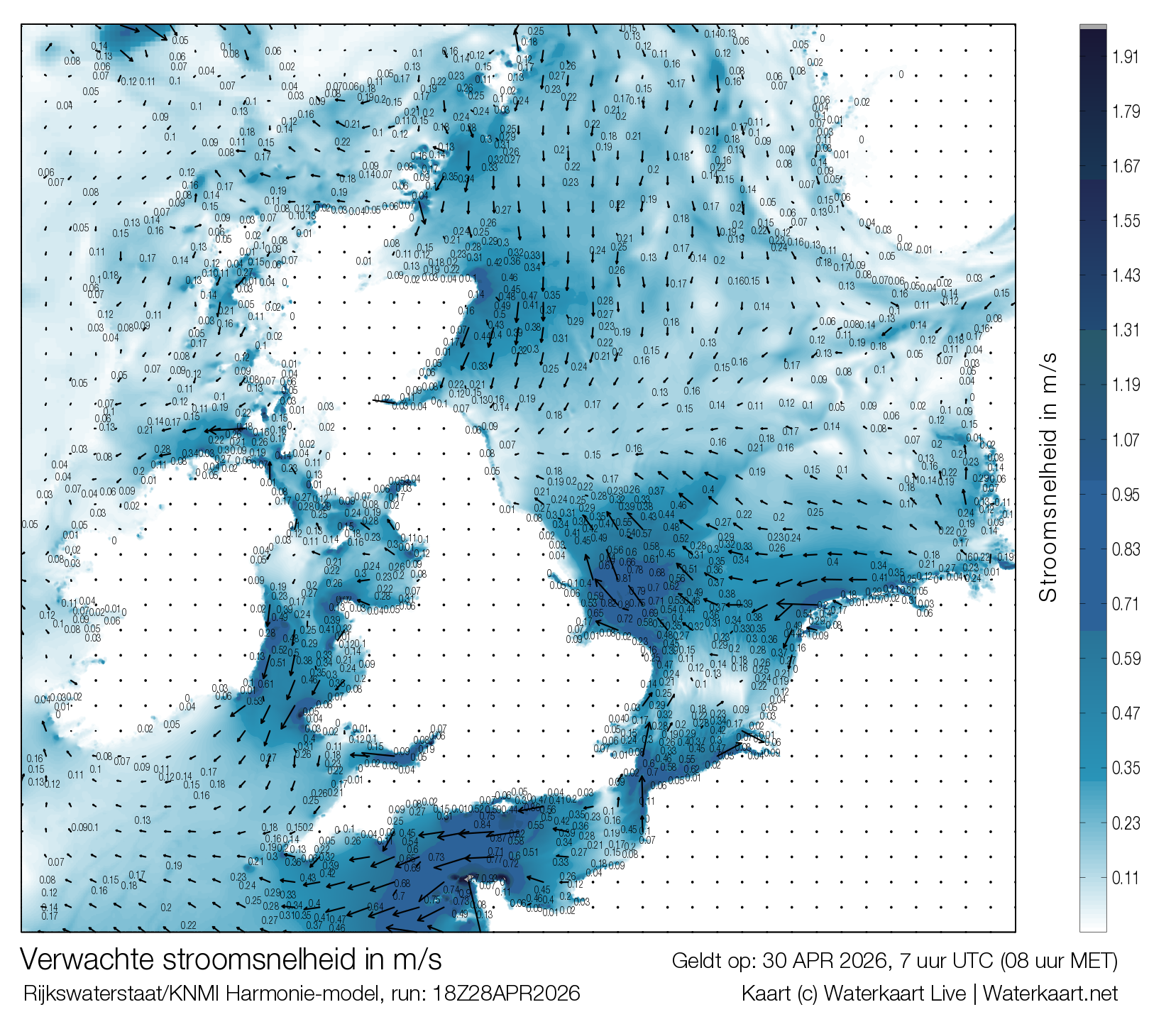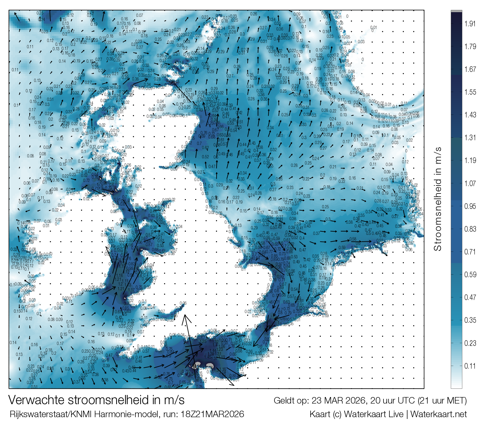 Stroomsnelheden in de Noordzee op basis van de Stroomatlas, verrekend met weersinvloeden. Deze worden iedere dag ververst met data uit het zeestromingen model van Rijkswaterstaat op basis van Harmonie weerdata, voor ieder uur een kaart, tot 48 uur in de toekomst. Lees hieronder meer over dit model