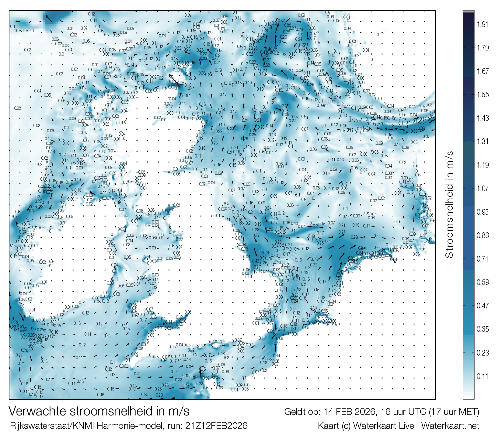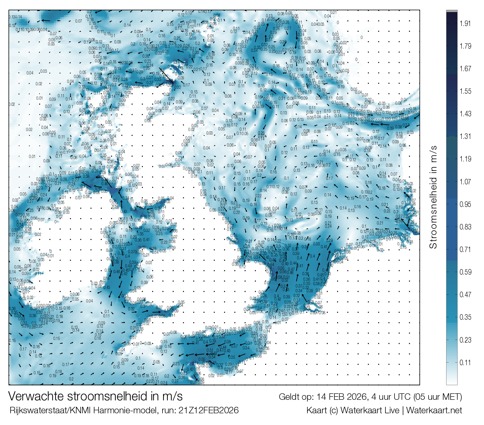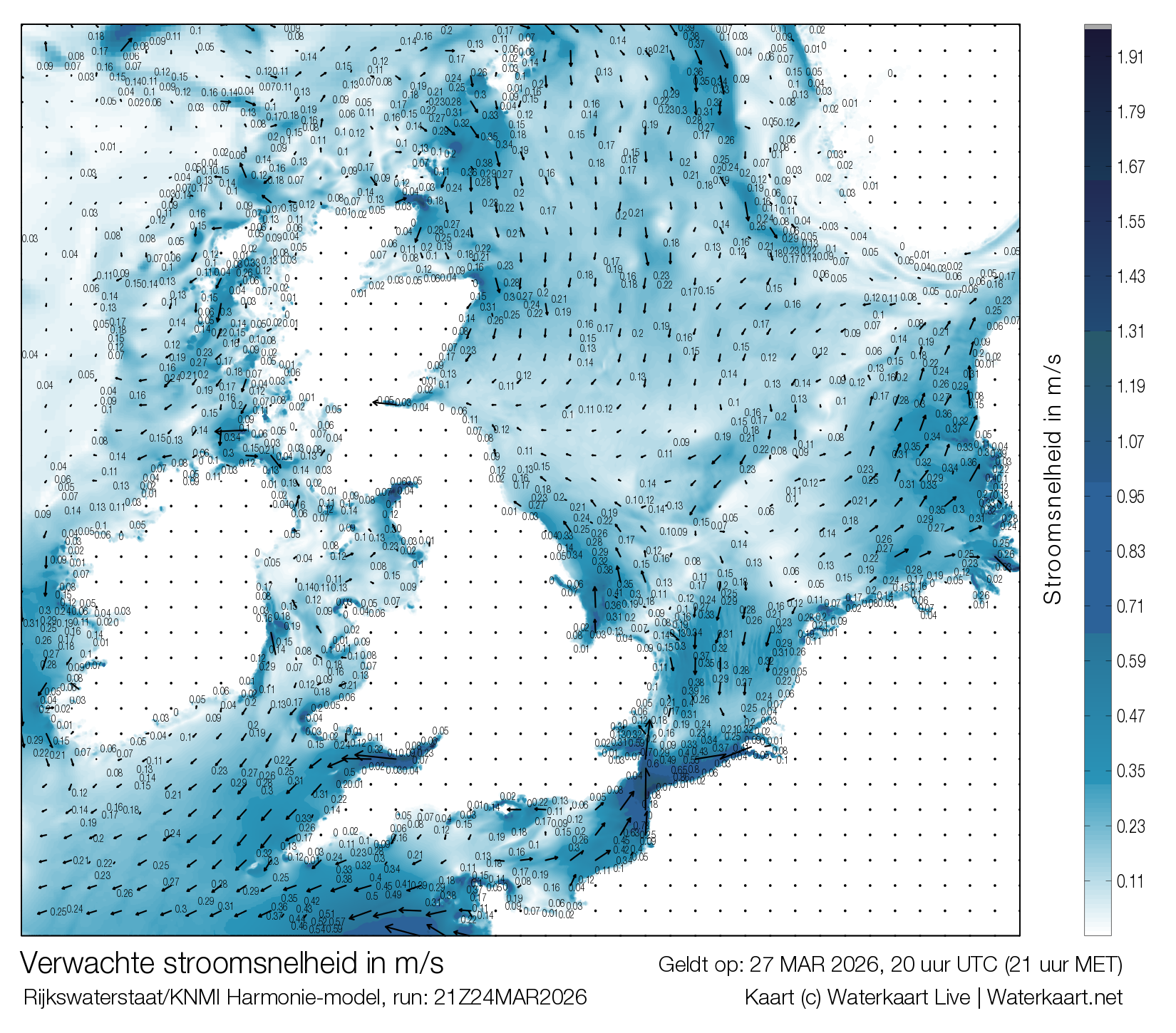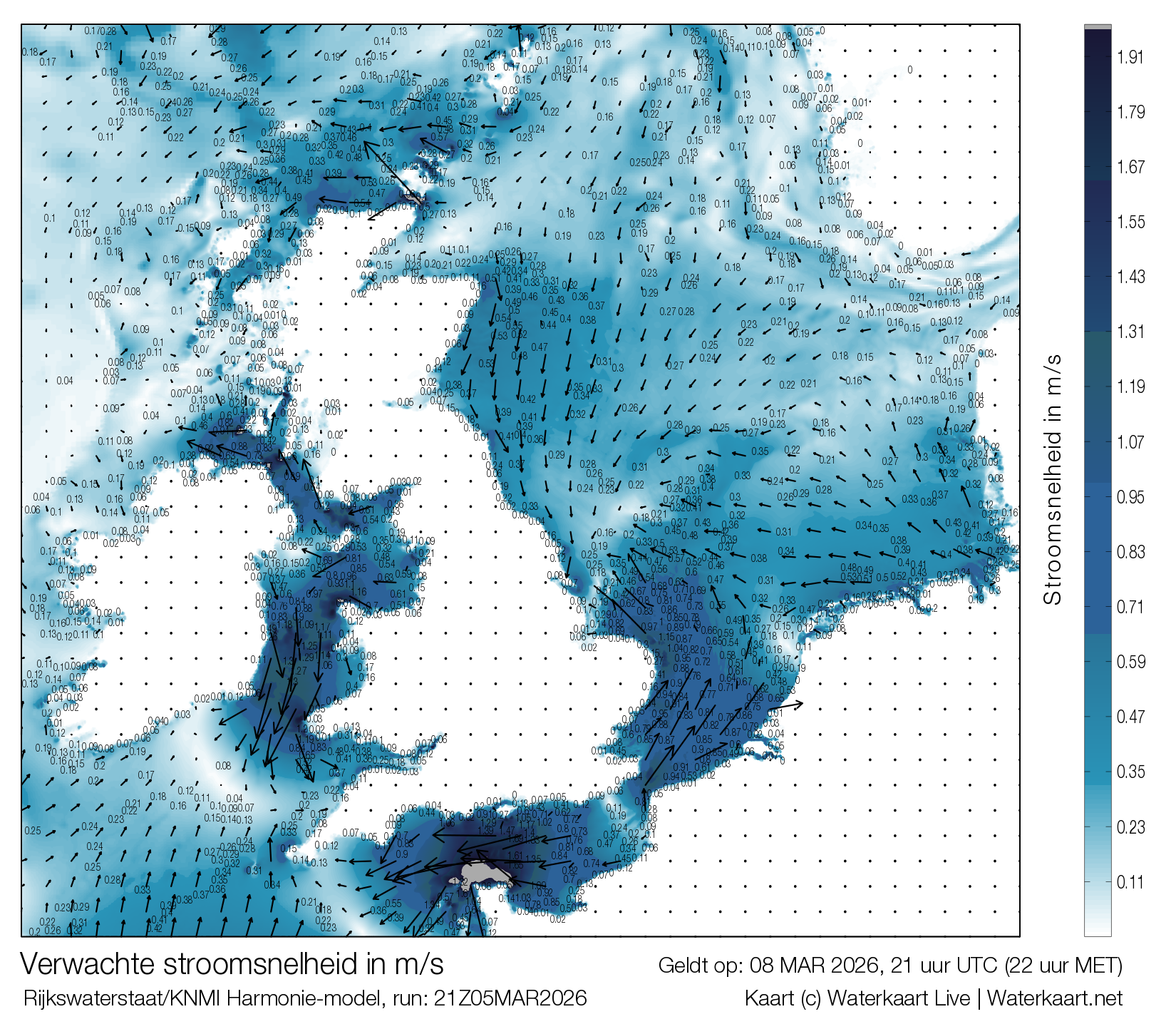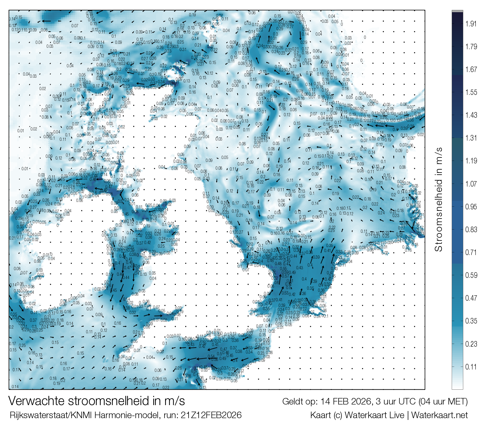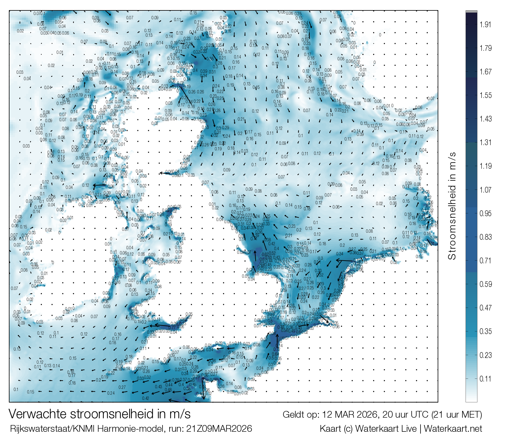Stroomsnelheden in de Noordzee op basis van de Stroomatlas, verrekend met weersinvloeden. Deze worden iedere dag ververst met data uit het zeestromingen model van Rijkswaterstaat op basis van Harmonie weerdata, voor ieder uur een kaart, tot 48 uur in de toekomst. Lees hieronder meer over dit model