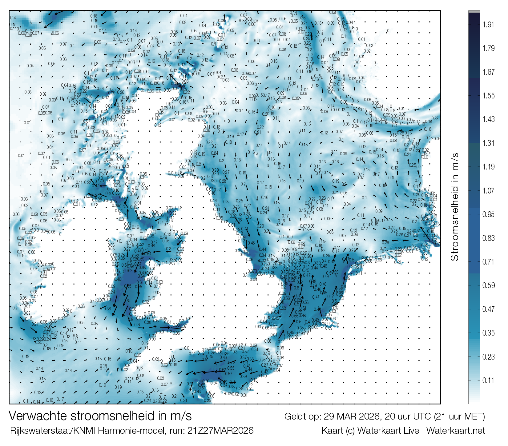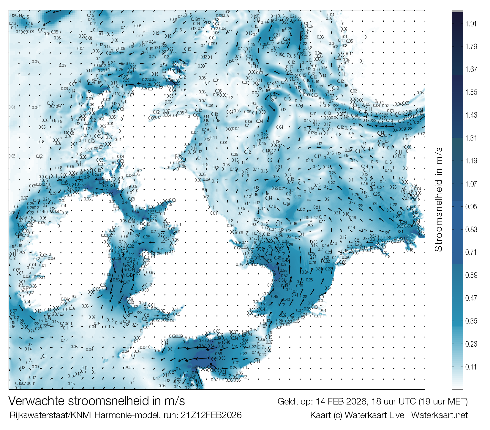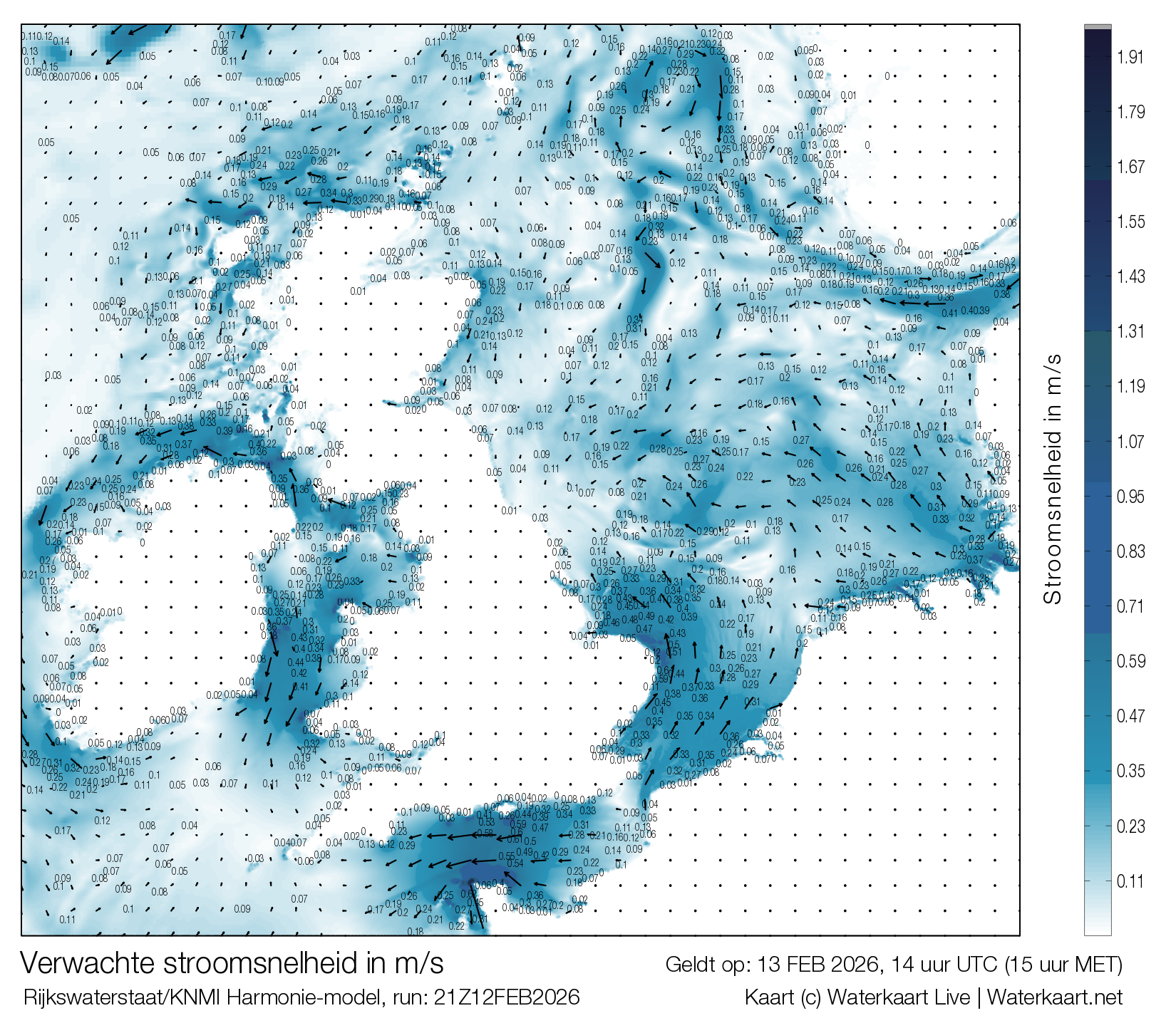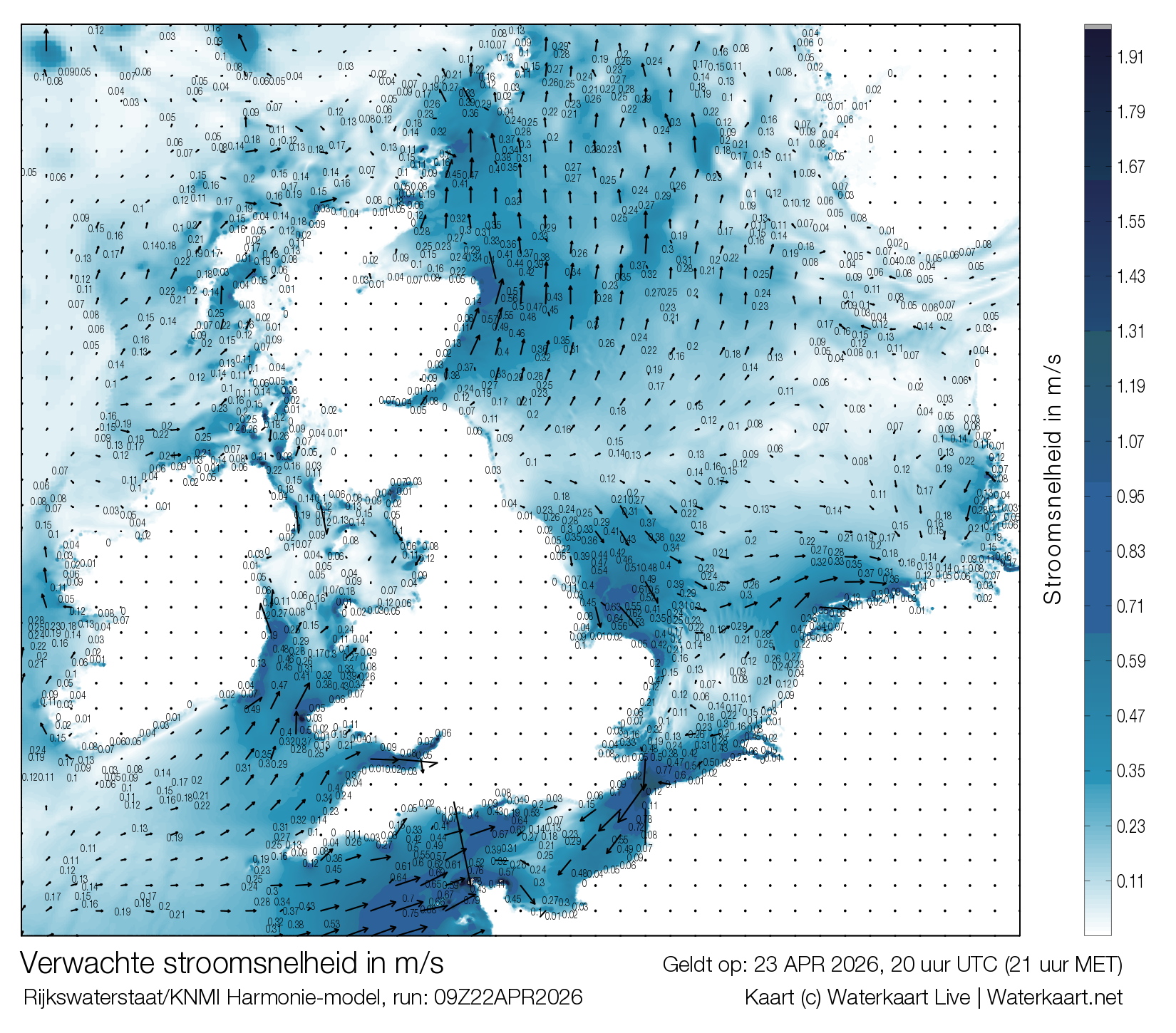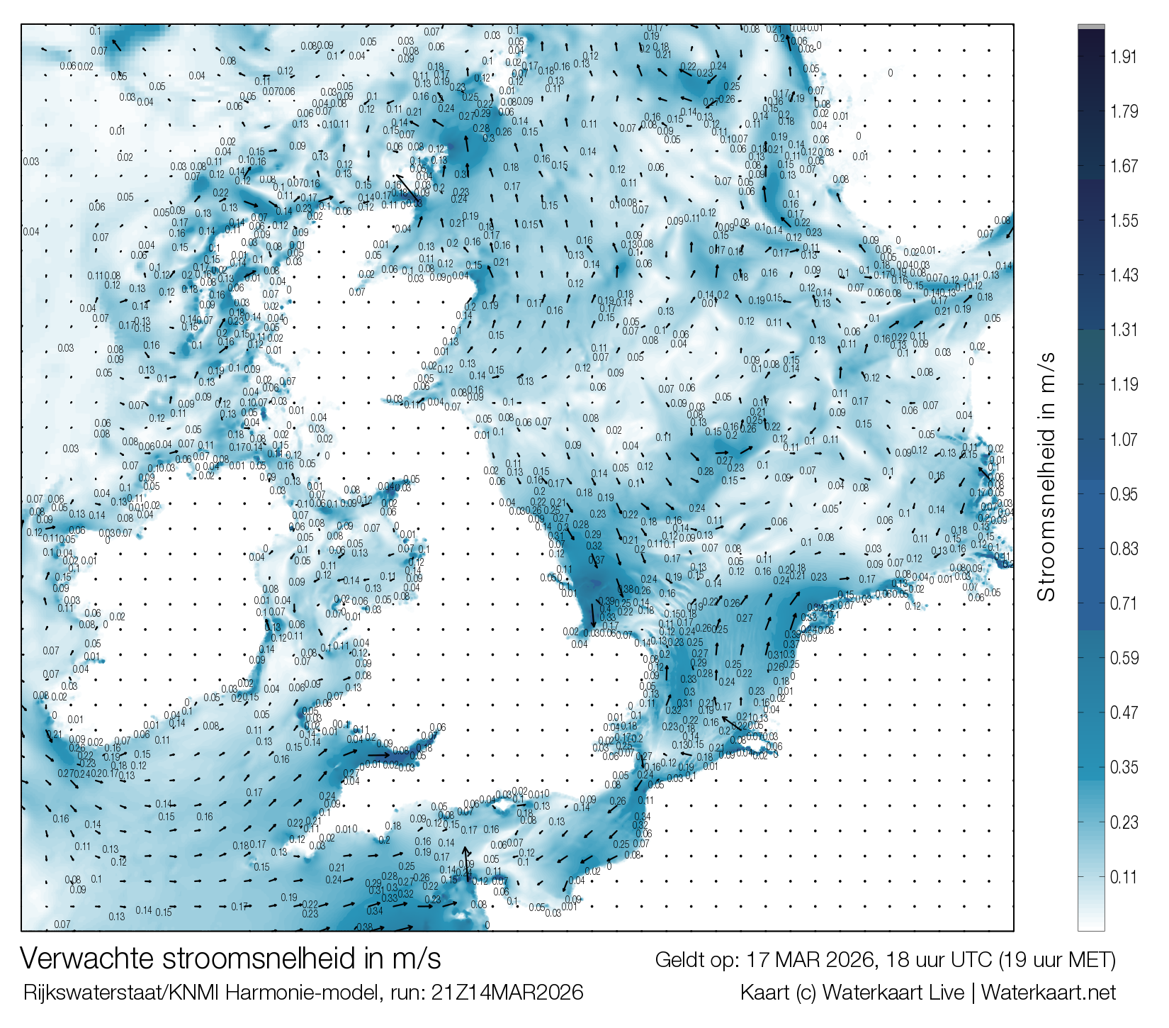 Stroomsnelheden in de Noordzee op basis van de Stroomatlas, verrekend met weersinvloeden. Deze worden iedere dag ververst met data uit het zeestromingen model van Rijkswaterstaat op basis van Harmonie weerdata, voor ieder uur een kaart, tot 48 uur in de toekomst. Lees hieronder meer over dit model