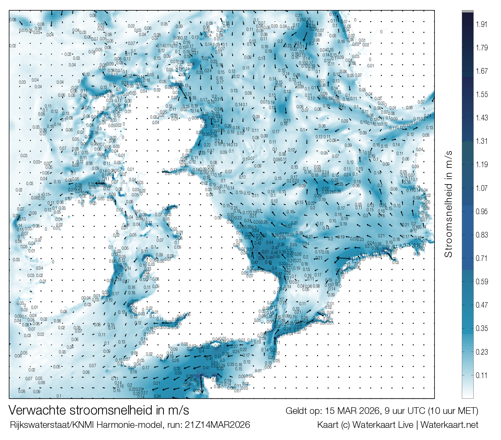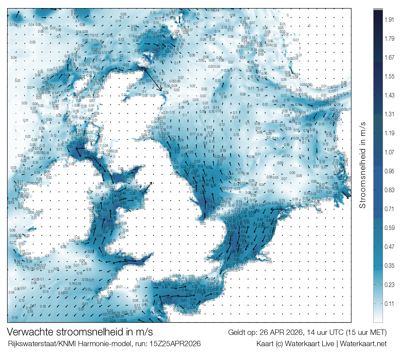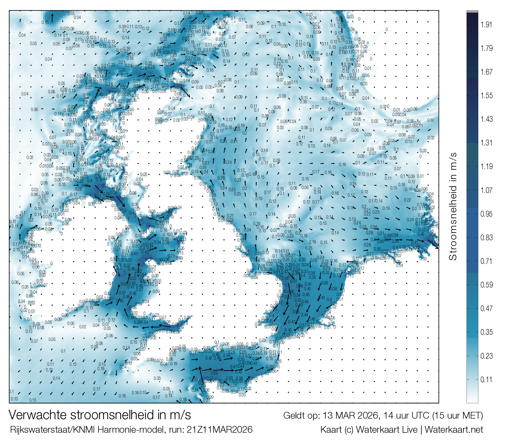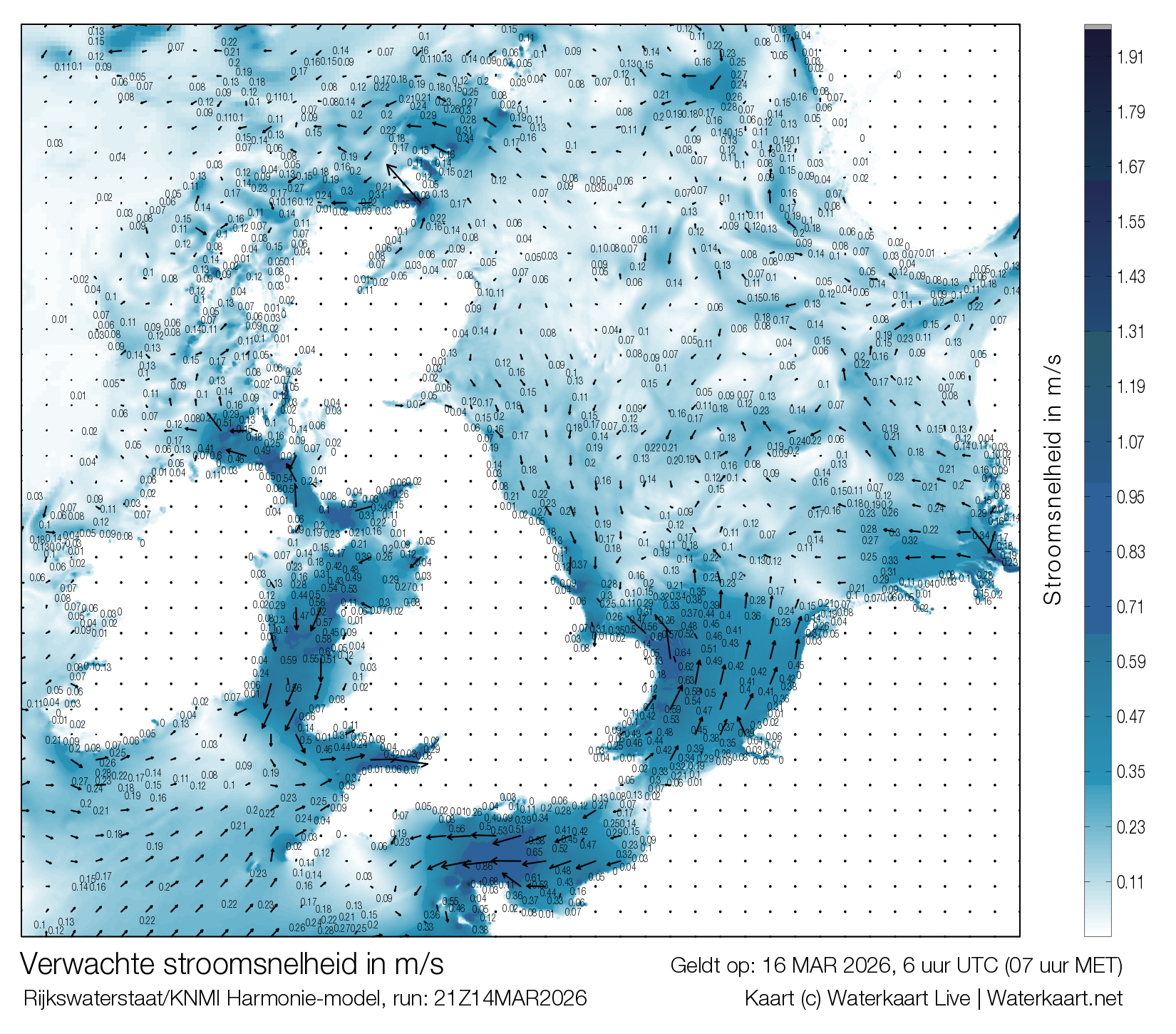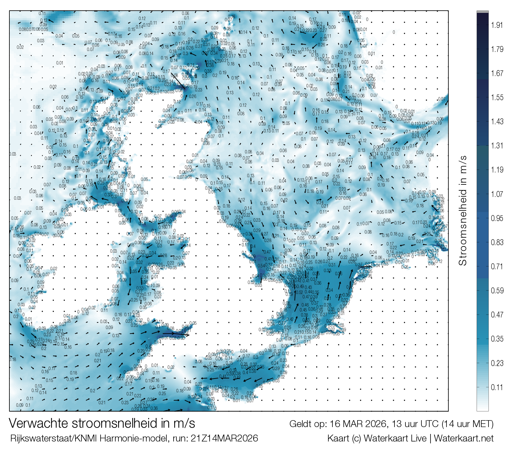 Stroomsnelheden in de Noordzee op basis van de Stroomatlas, verrekend met weersinvloeden. Deze worden iedere dag ververst met data uit het zeestromingen model van Rijkswaterstaat op basis van Harmonie weerdata, voor ieder uur een kaart, tot 48 uur in de toekomst. Lees hieronder meer over dit model