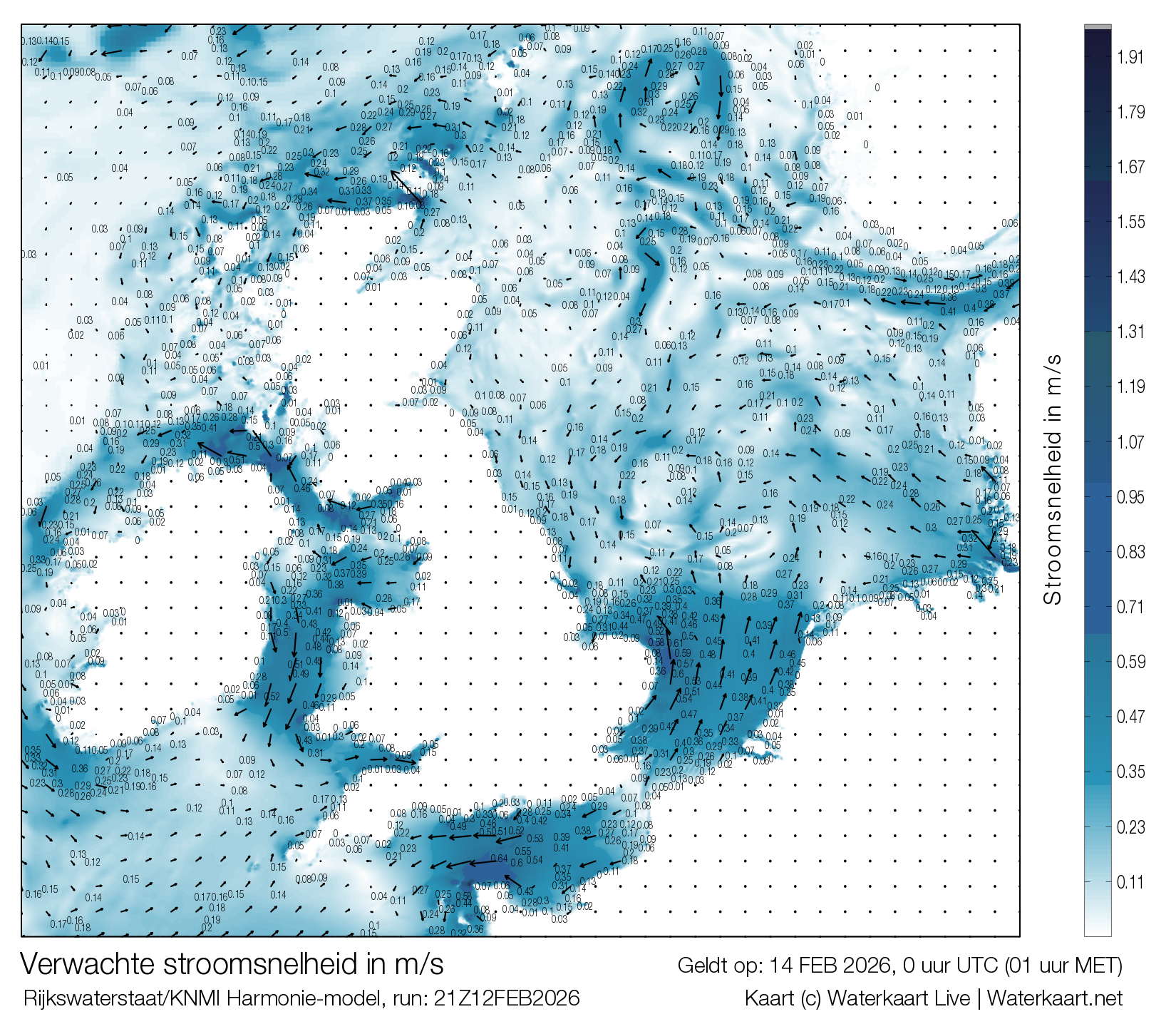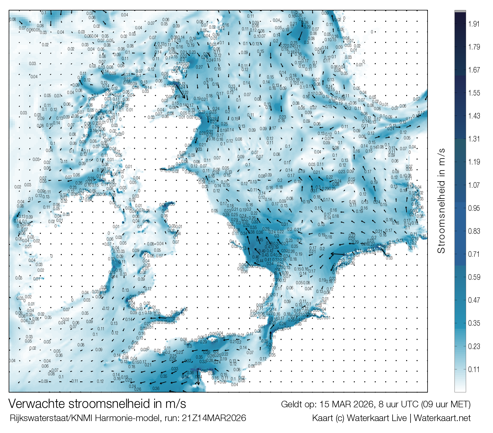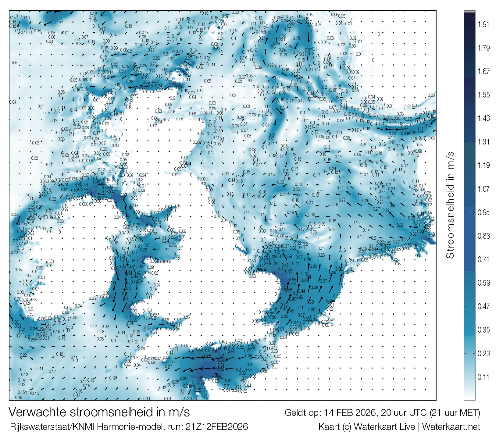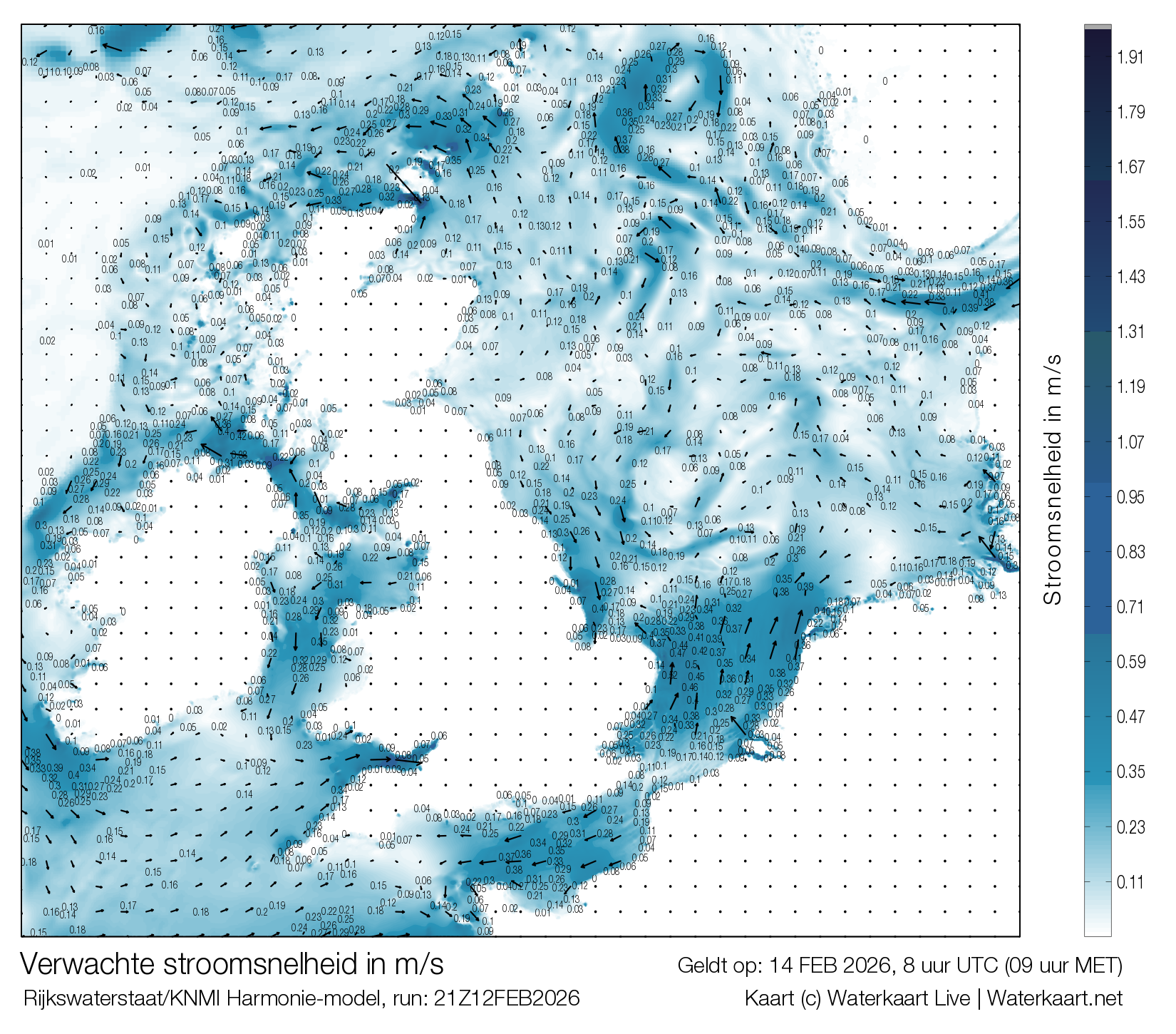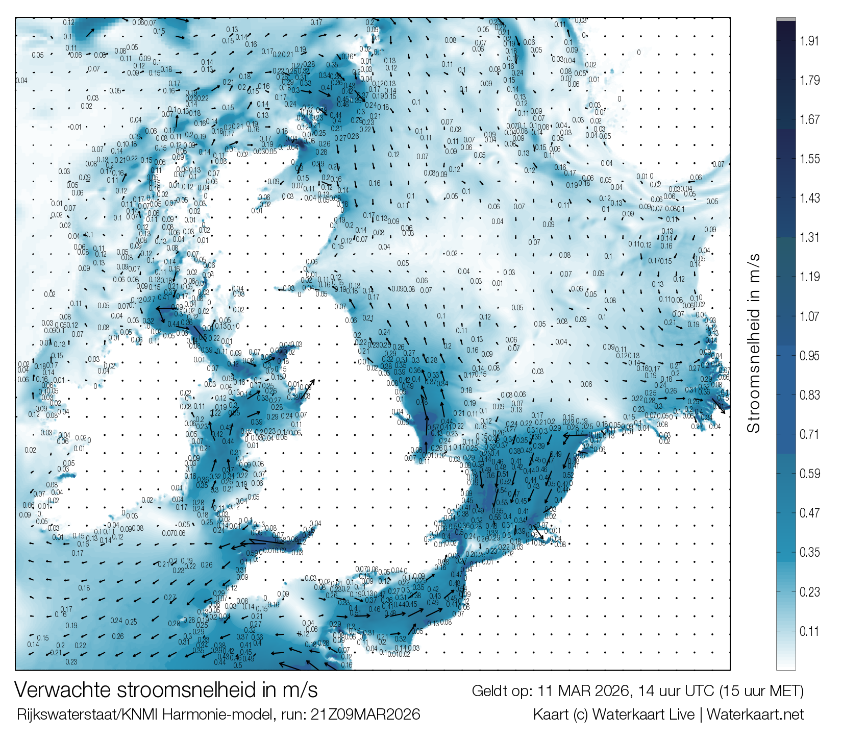 Stroomsnelheden in de Noordzee op basis van de Stroomatlas, verrekend met weersinvloeden. Deze worden iedere dag ververst met data uit het zeestromingen model van Rijkswaterstaat op basis van Harmonie weerdata, voor ieder uur een kaart, tot 48 uur in de toekomst. Lees hieronder meer over dit model