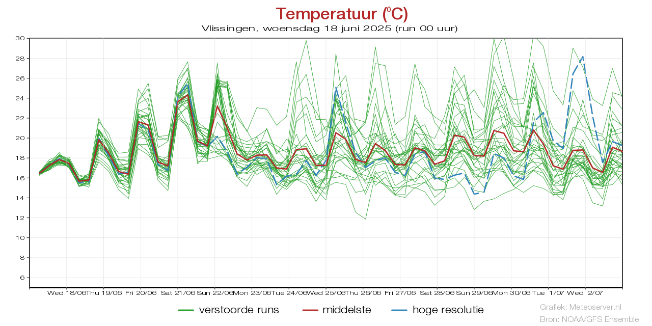 Die onzekerheid is nodig, omdat het weer nu eenmaal onzeker is. Je weet nooit precies wat het gaat worden, verwachtingen opstellen gaat daarom vaak beter als je die onzekerheid ook inbouwt in de berekening. Als het model daarna 52 keer heeft gedraaid wordt het ideale midden berekend (de dikke rode stippellijn). Grote kans dat het toekomstige weerbeeld daar op zal lijken. De berekeningen worden 4 maal daags uitgevoerd om steeds de nieuwe actuele waardes als uitgangspunt te kunnen nemen. Je ziet ook dat naarmate de dagen vorderen, de onzekerheid toeneemt. Hoe meer de groene lijntjes uit elkaar liggen, hoe hoger de onzekerheid.
