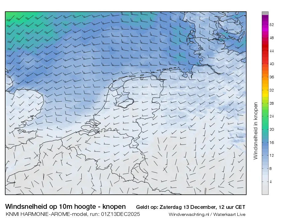 Weerkaarten met de windsnelheidverwachting in knopen. Deze worden vier maal daags vervaardigd met data uit het Harmonie-Arome weermodel van het KNMI, voor ieder uur een kaart, tot 36 uur in de toekomst.